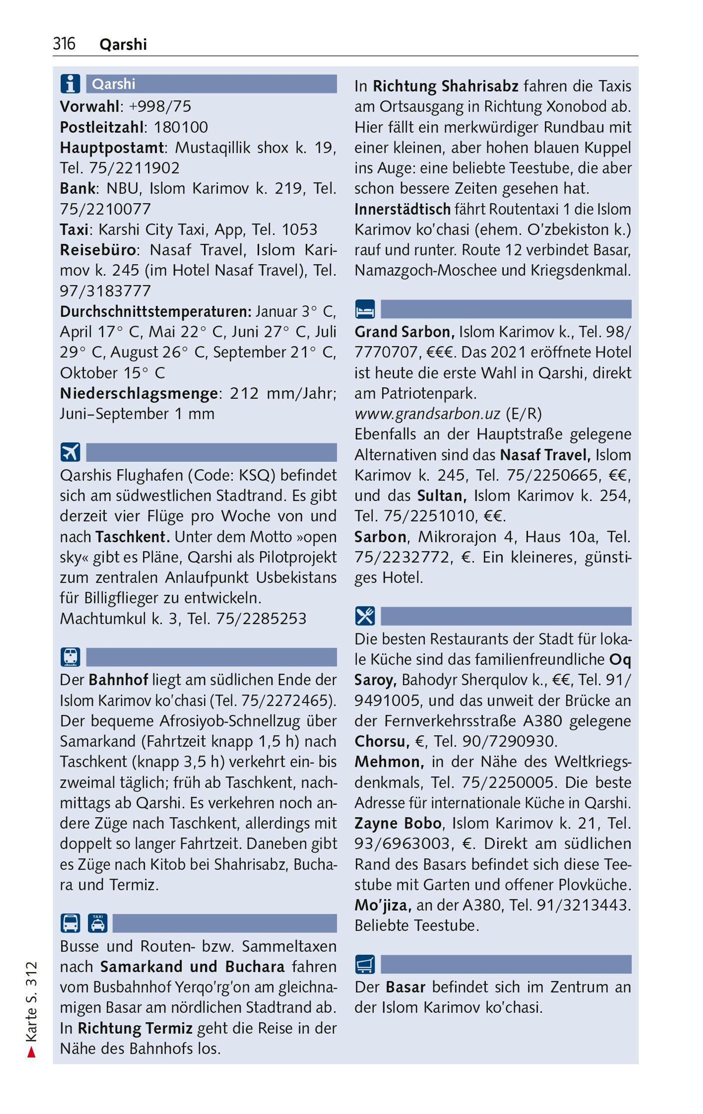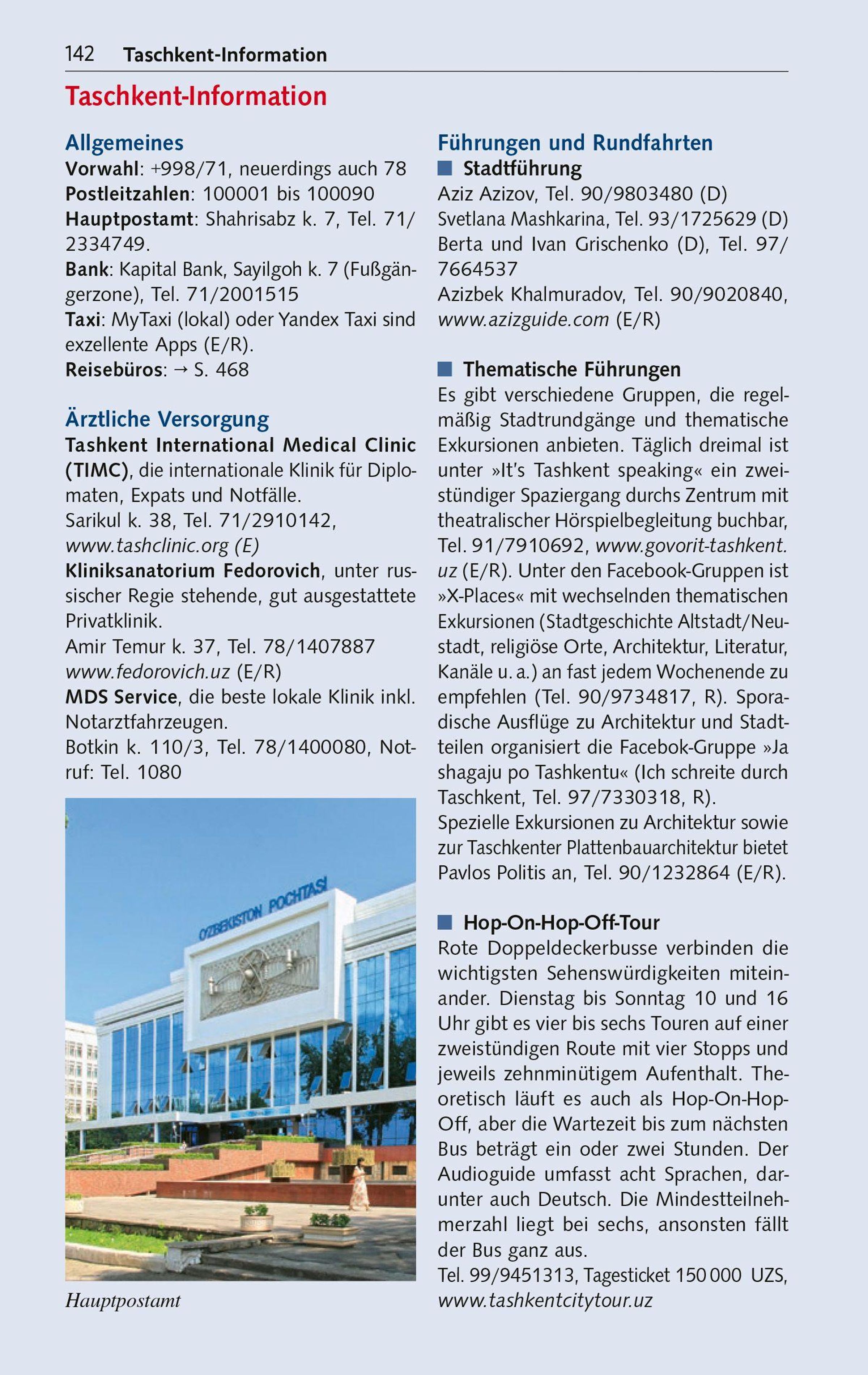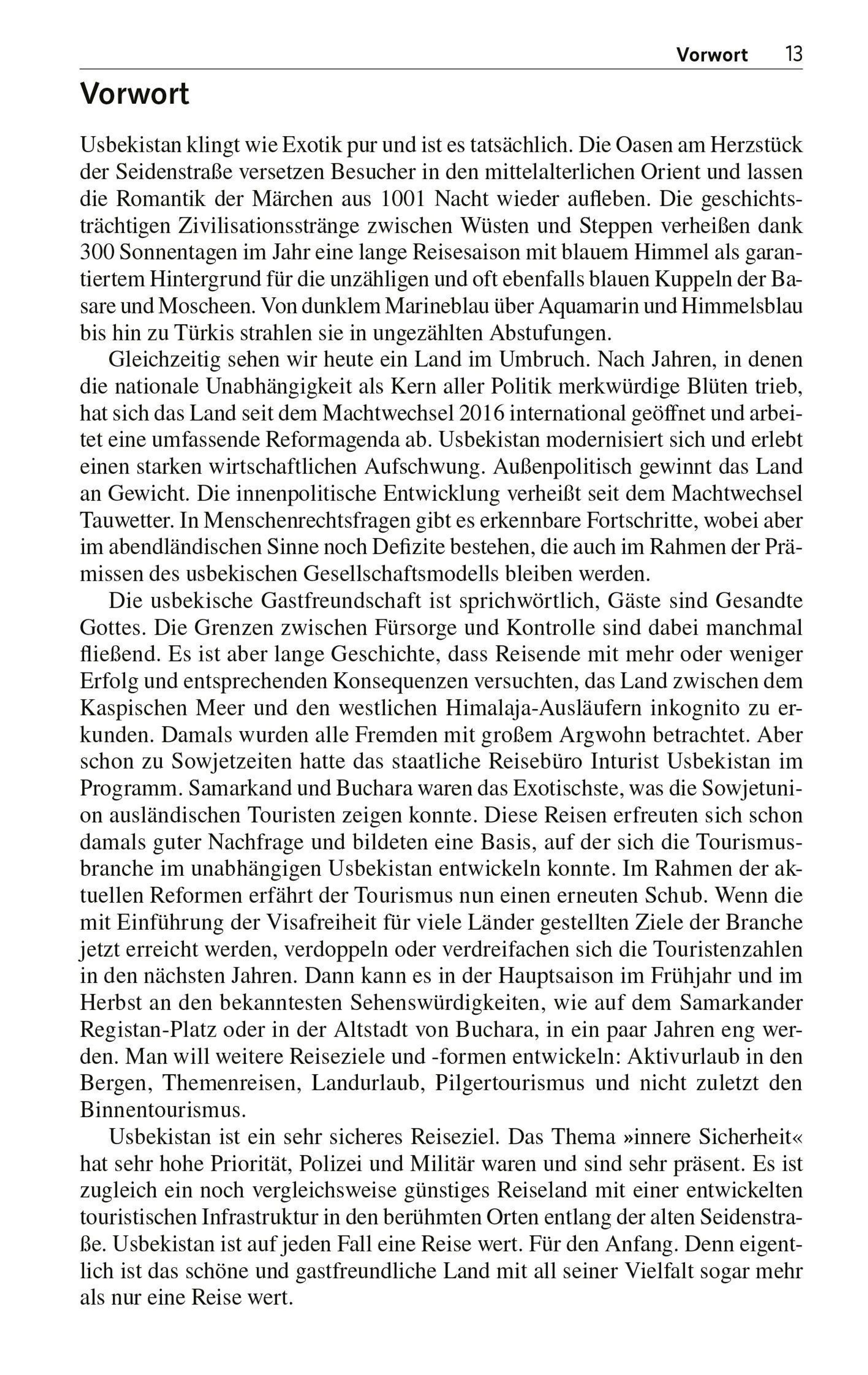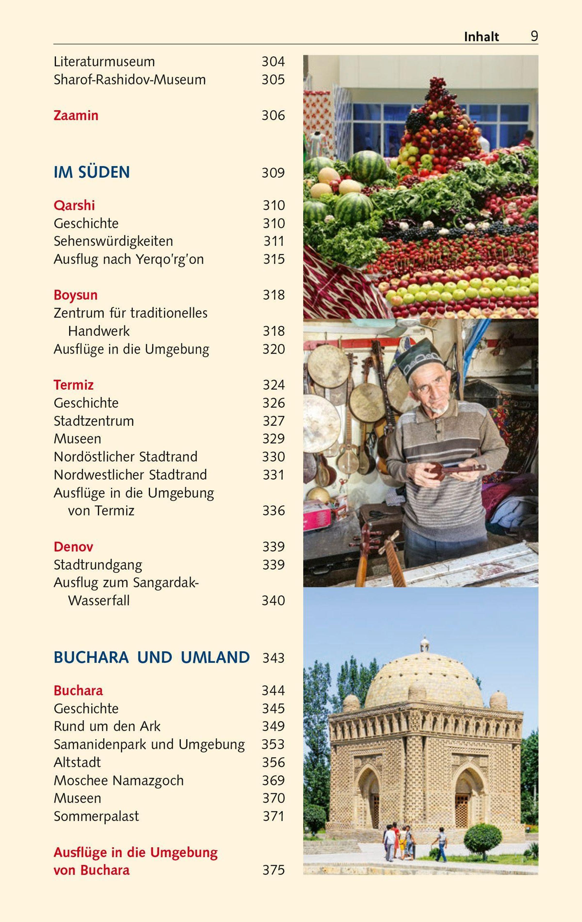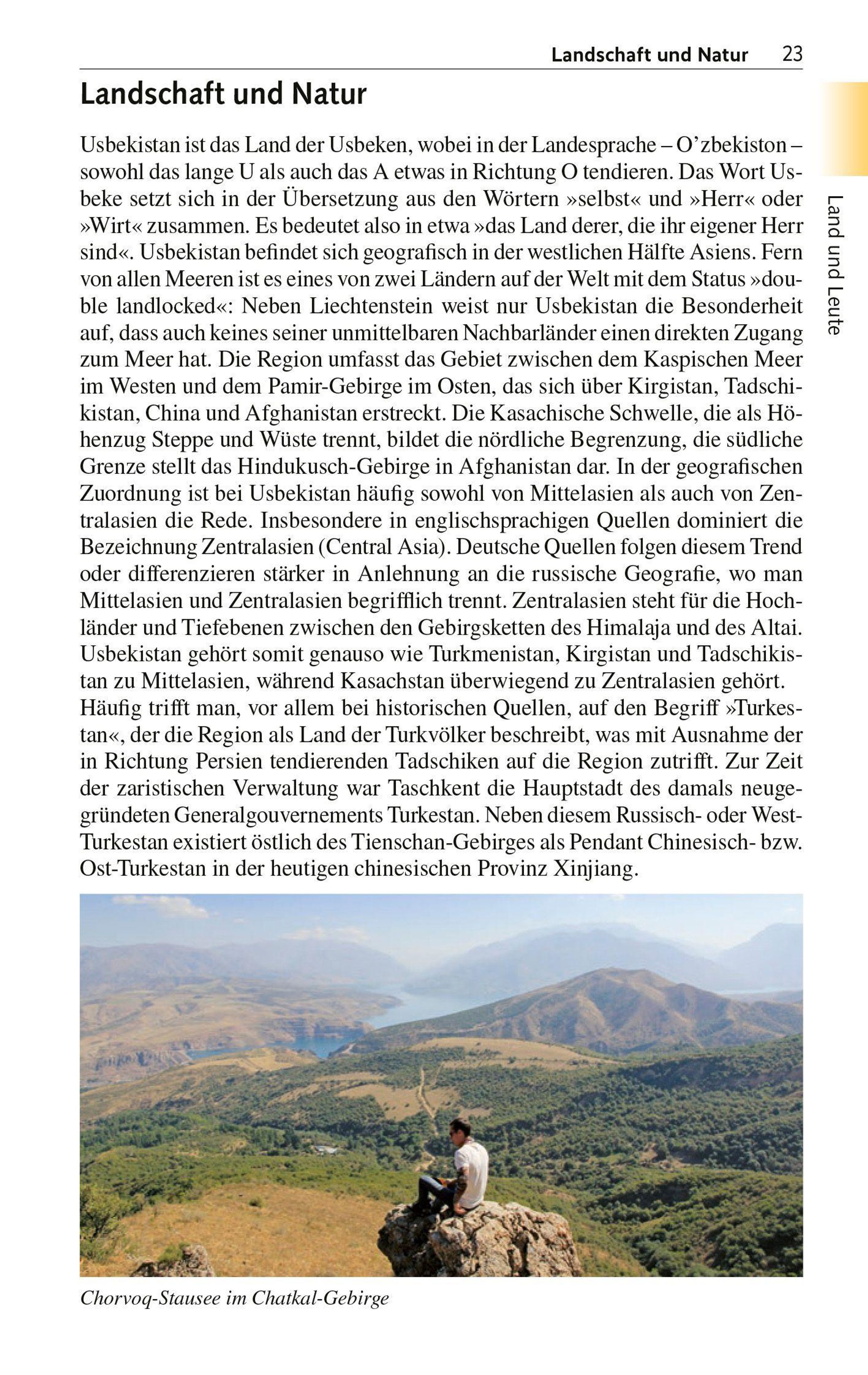 Die Autoren des Trescher-Reiseführers USBEKISTAN, Irina und Bodo Thöns, leben im Land und kennen es wie ihre Westentasche. Alle Regionen und ihre Sehenswürdigkeiten werden von ihnen umfassend beschrieben, auch die abseits der touristischen Routen. Landeskundliche Kapitel führen ein in Geografie und Natur, beleuchten Geschichte und Kultur, die Traditionen und den Alltag der Menschen. Empfehlungen für Hotels, Jurtencamps, Restaurants und Basare, viele Stadtpläne, ein herausnehmbarer Faltplan sowie ausführliche reisepraktische Tipps ergänzen diesen allseits zuverlässigen Wegbegleiter.