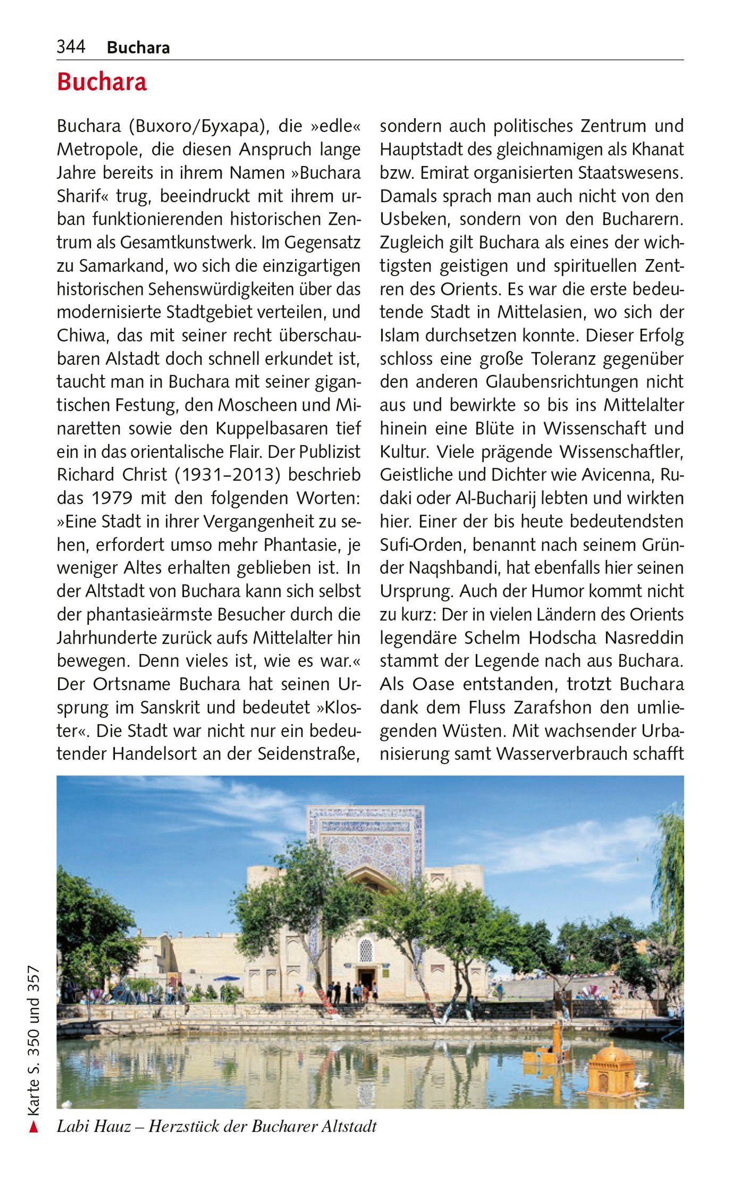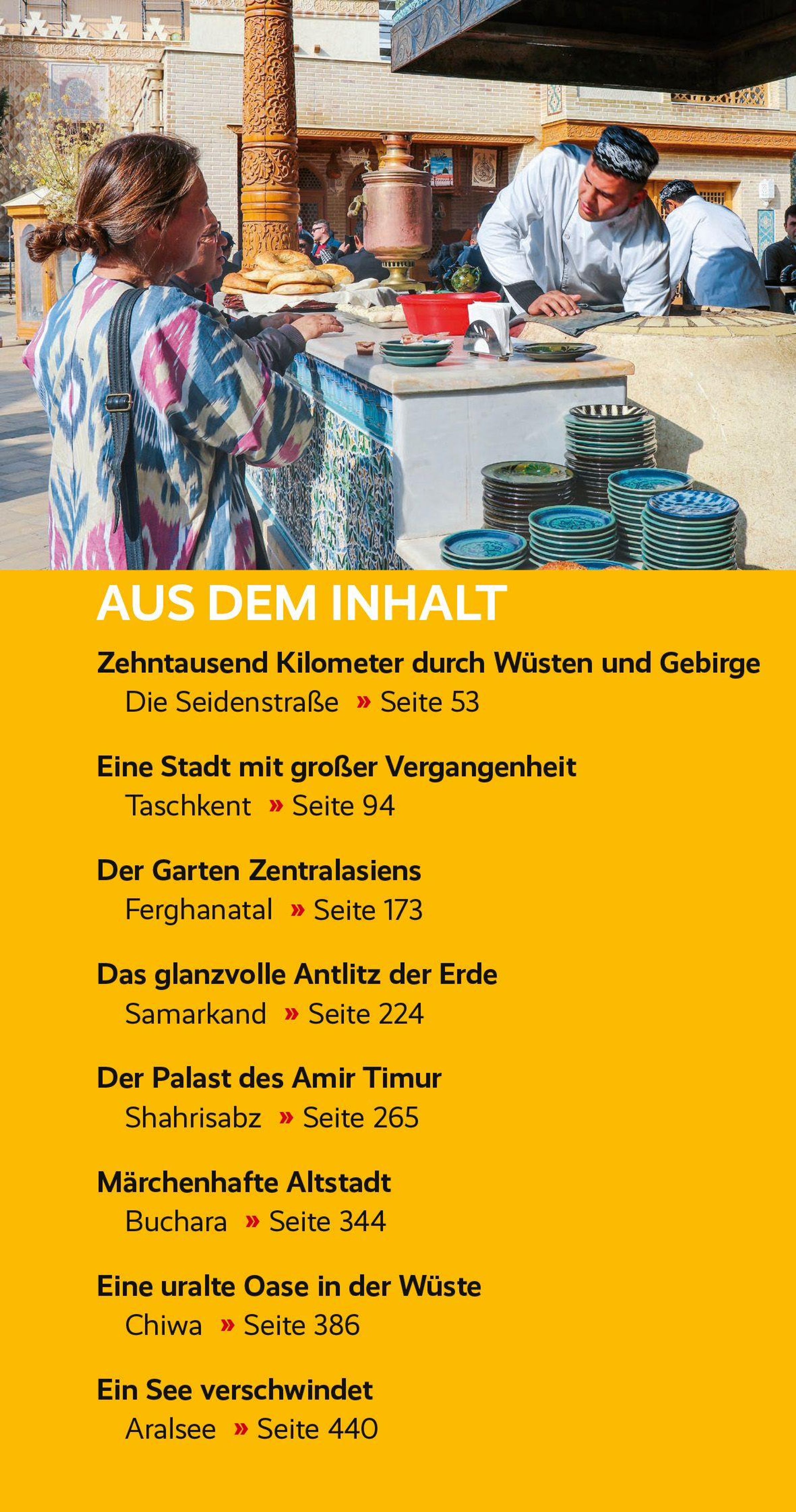 Von den westlichen Wüsten bis östlich zum Pamir-Gebirge, vom nördlichen Aralsee bis südlich zum Hindukusch erstreckt sich Usbekistan im Zentrum der alten Seidenstraße. Schon in der Antike verband die sagenumwobene Handelsstraße Fernost mit Europa, und noch heute schlagen die alten Oasenstädte Reisende in ihren Bann. Samarkand: Meisterwerk islamischer Baukunst wie aus Tausendundeiner Nacht. Chiwa zwischen Roter und Schwarzer Sandwüste: Altstadt, Moscheen, Paläste und Zitadelle sind komplett von mächtigen Festungsmauern umgeben. Buchara: märchenhafte Wüstenstadt, über 2500 Jahre alt, mit Palästen, Moscheen, Medresen und bunten Basaren. Schließlich Shahrisabz, Geburtsstadt des berüchtigten Eroberers Amir Timur. Alle vier Oasenstädte sind UNESCO-Welterbe, wegen ihrer mit filigranen blauen Mosaiken versehenen Bauwerke auch "blaue Edelsteine" genannt.