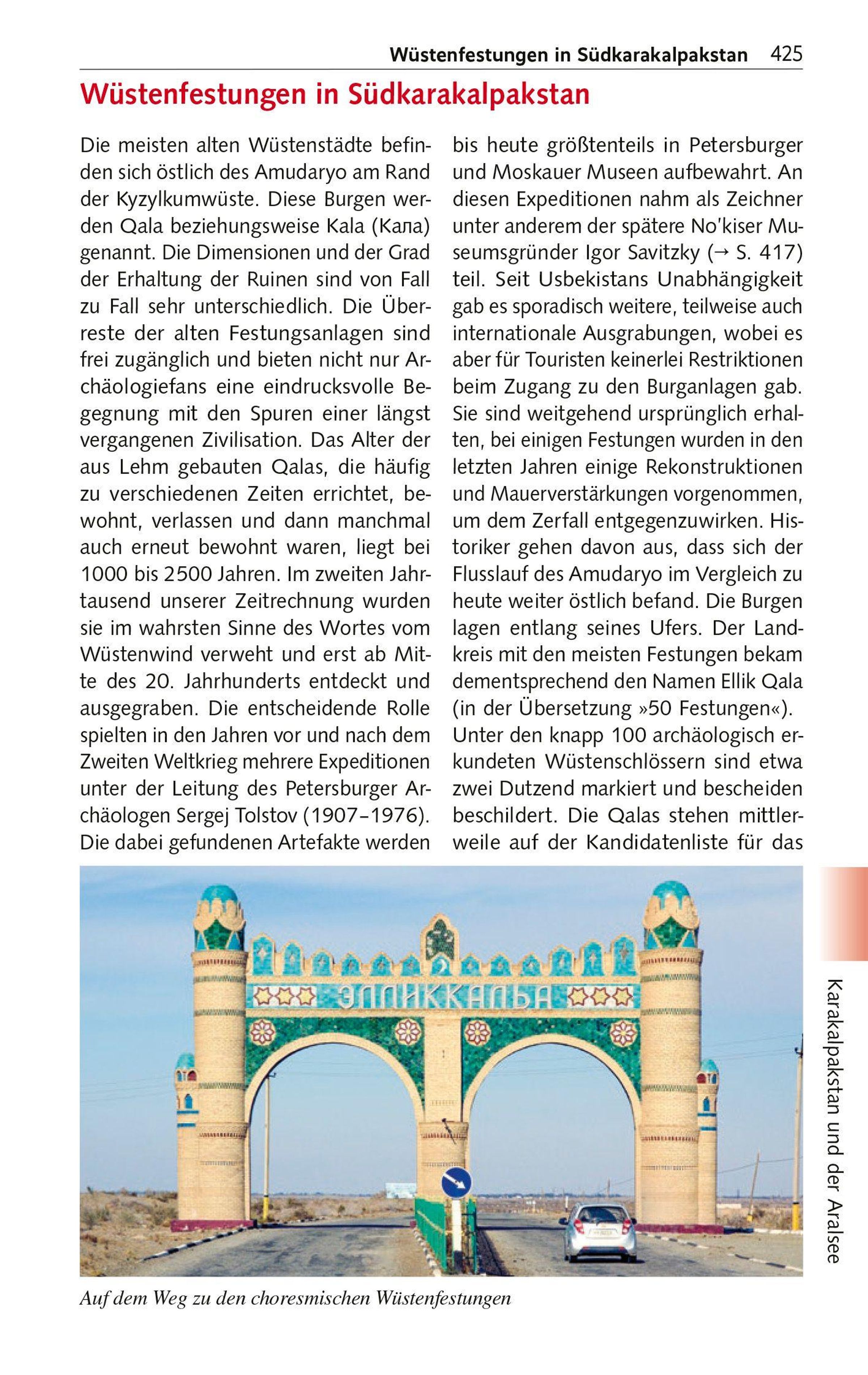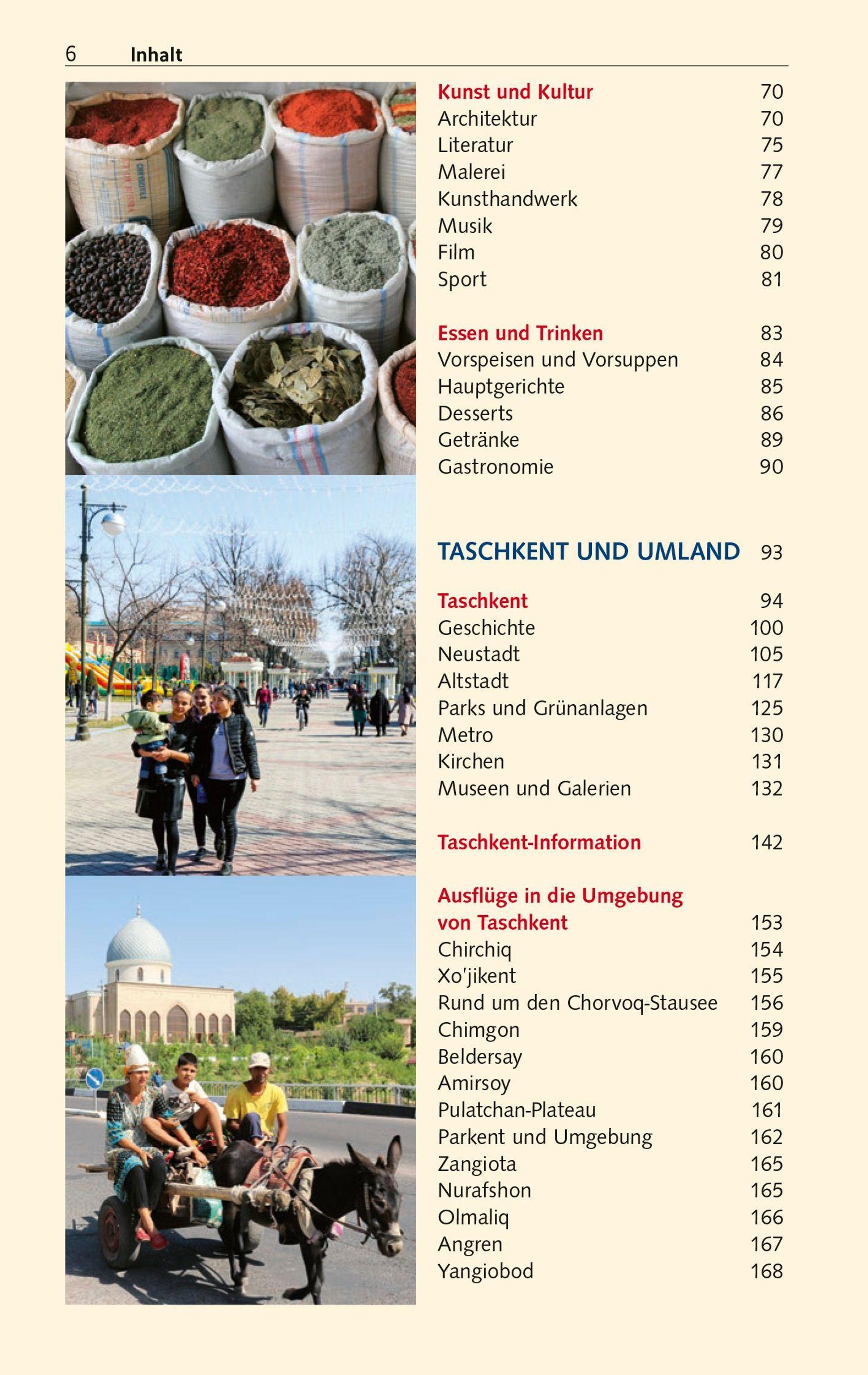 Die Hauptstadt Taschkent besticht mit ihrem Mix aus grünen Parks, traditioneller und sowjetischer Architektur. Das Ferghanatal im Dreiländereck Usbekistan, Kirgistan, Kasachstan, die Wüste Kyzylkum oder eine Fahrt zum schwindenden Aralsee zählen zu den beeindruckenden Naturerlebnissen. Die Wüstenfestungen am Amudaryo, Reste buddhistischer Klöster und zoroastrischer Feuertempel zeugen von der reichen Geschichte. Viele weitere spannende Entdeckungen, Basare mit orientalischem Flair und eine herzliche Gastfreundschaft erwarten die Besucher im Land.