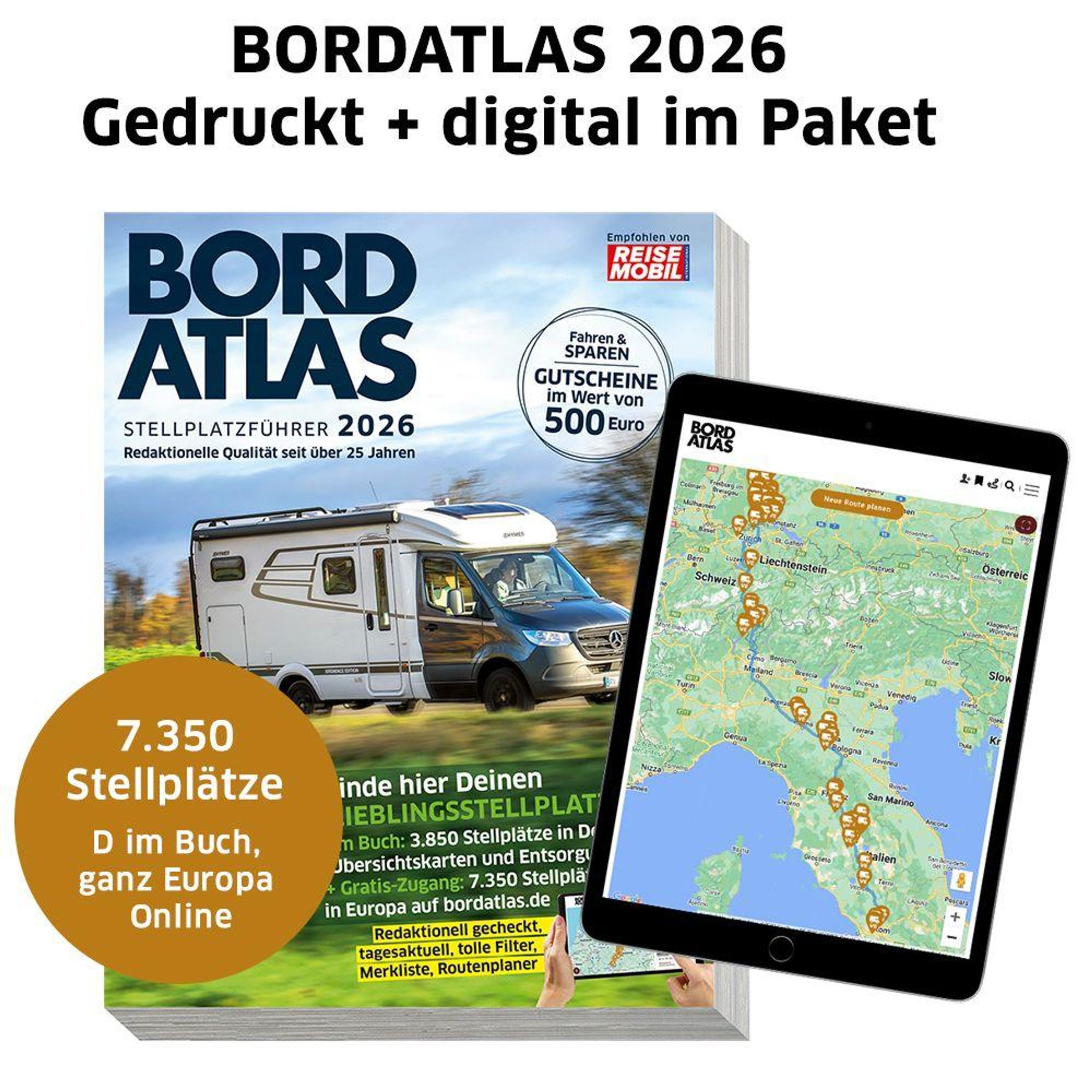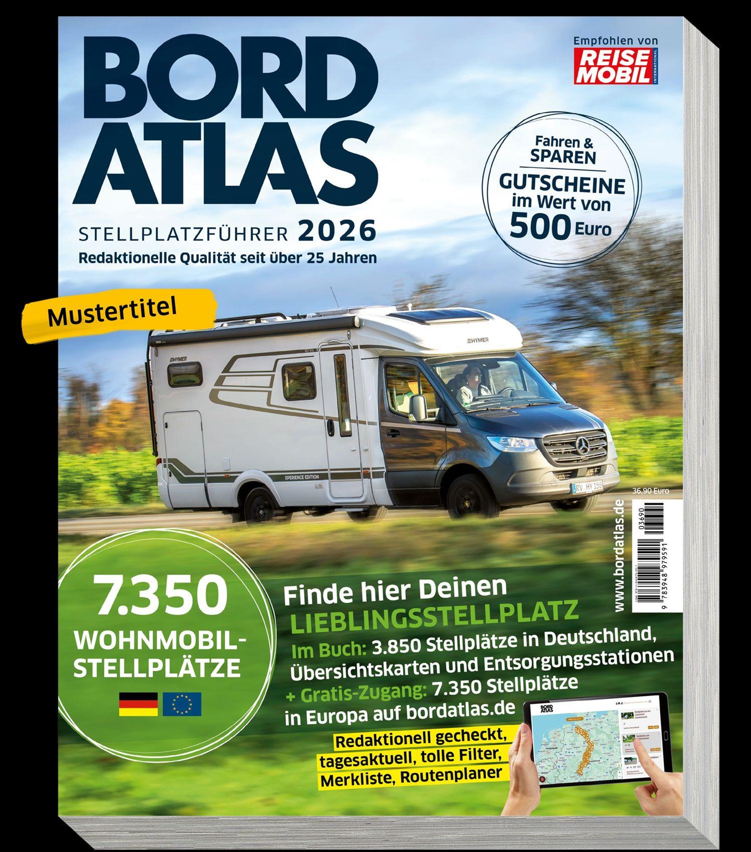 Seit über 25 Jahren veröffentlicht der BORDATLAS über 7.000 Wohnmobil-Stellplätze als Übernachtungsmöglichkeit für Wohnmobil-Fahrer in Deutschland und Europa. Kundenvorteil: Seit Neuestem kann ein Buchkäufer dabei parallel zum Buch die Online-Suche auf www. bordatlas. de mit allen nützlichen Suchfunktionen nutzen, ein entsprechender Gutscheincode ist im Buch enthalten. Freuen Sie sich auf die neue Ausgabe 2026 und recherchieren Sie Ihre Wunsch-Stellplätze im Buch und Online.