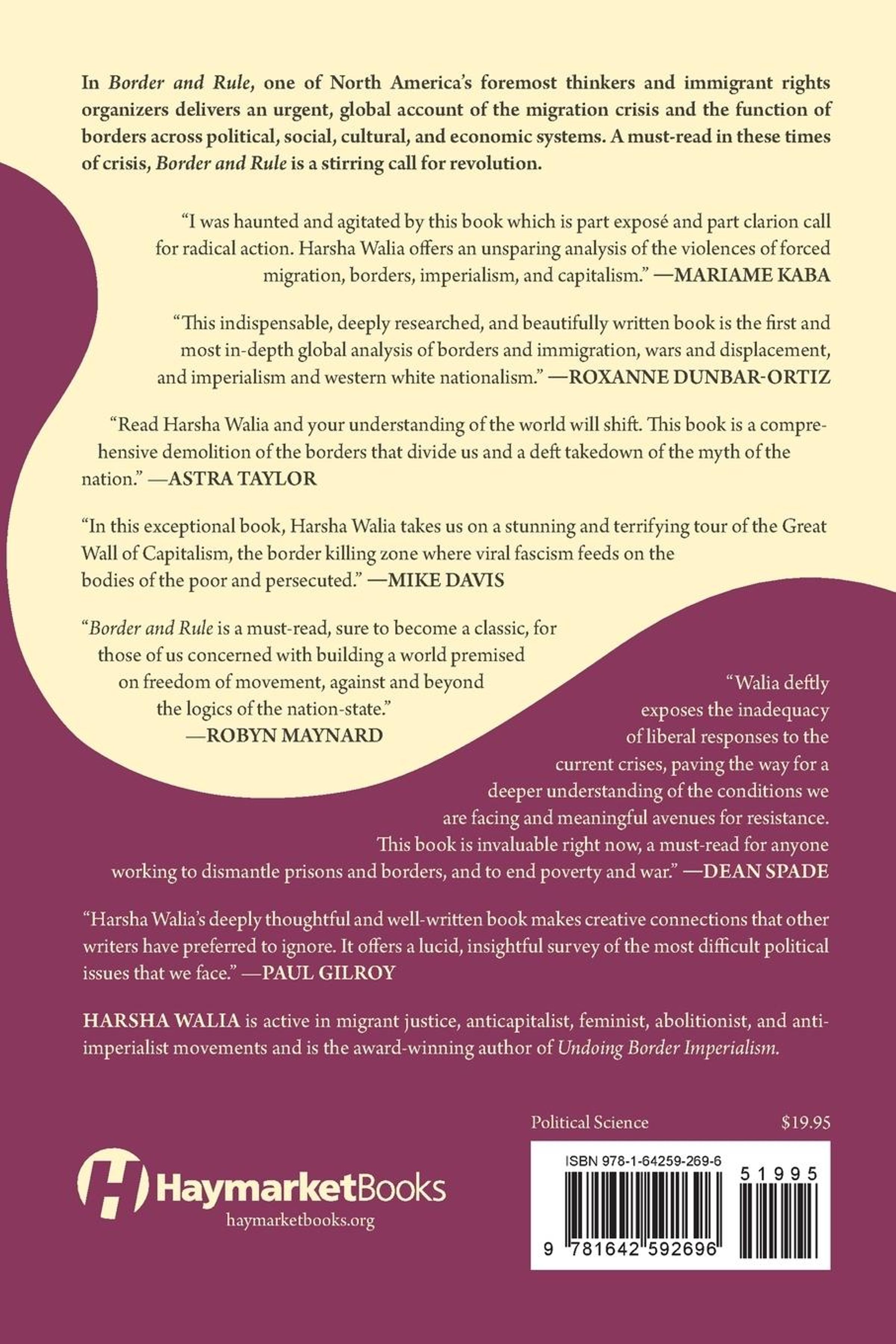 Harsha Walia disrupts easy explanations for the migrant and refugee crises, instead showing them to be the inevitable outcomes of the conquest, capitalist globalization, and climate change that are generating mass dispossession worldwide. Border and Rule explores a number of seemingly disparate global geographies with shared logics of border rule that displace, immobilize, criminalize, exploit, and expel migrants and refugees. With her keen ability to connect the dots, Walia demonstrates how borders divide the international working class and consolidate imperial, capitalist, and racist nationalist rule. Ambitious in scope and internationalist in orientation, Border and Rule breaks through American exceptionalist and liberal responses to the migration crisis and cogently maps the lucrative connections between state violence, capitalism, and right-wing nationalism around the world.