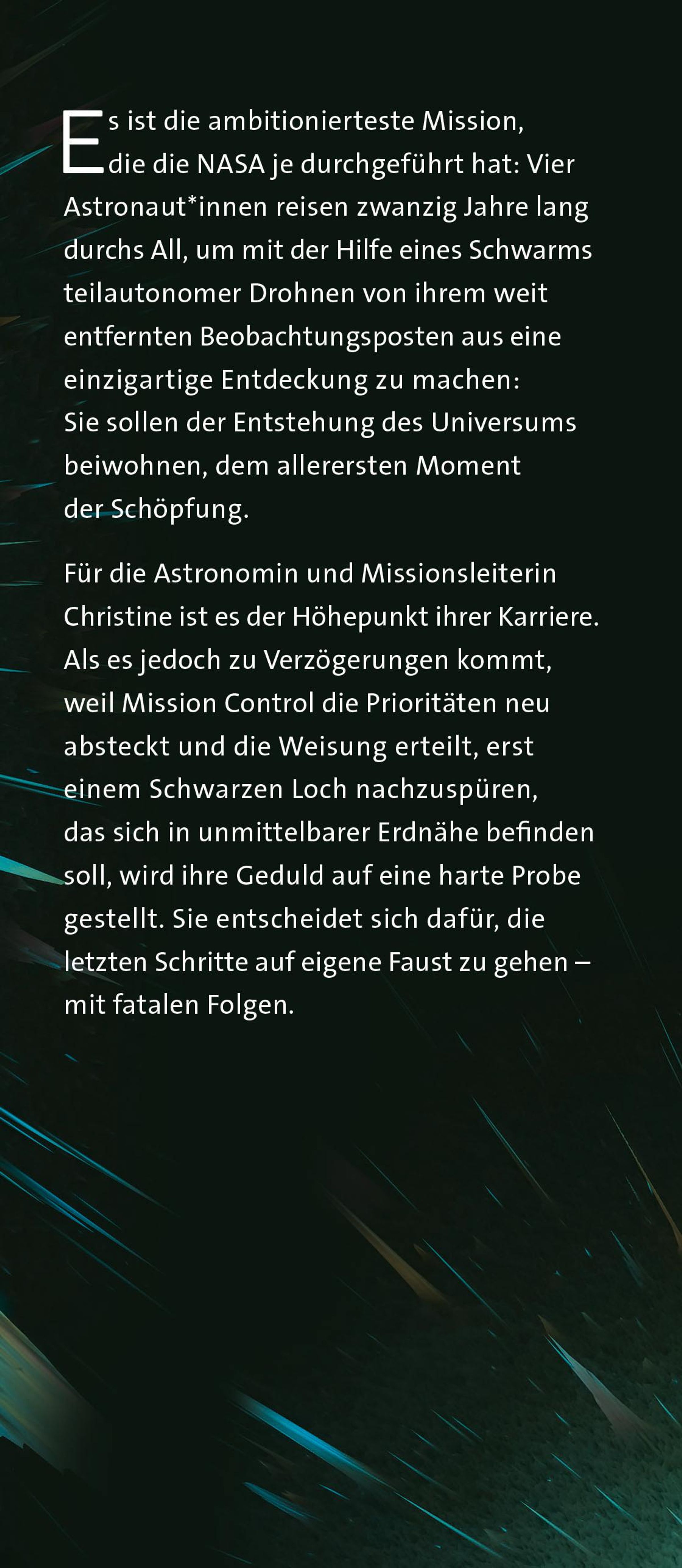 Weiter als die vier Astronauten der Shepherd-1 ist noch nie jemand ins All vorgestoßen. Das Ziel ihrer Mission: die Entstehung des Kosmos zu beobachten. Ein Schwarm von Sonden soll so ausgerichtet werden, dass mithilfe der Sonne als Linse der Moment des Urknalls sichtbar wird.