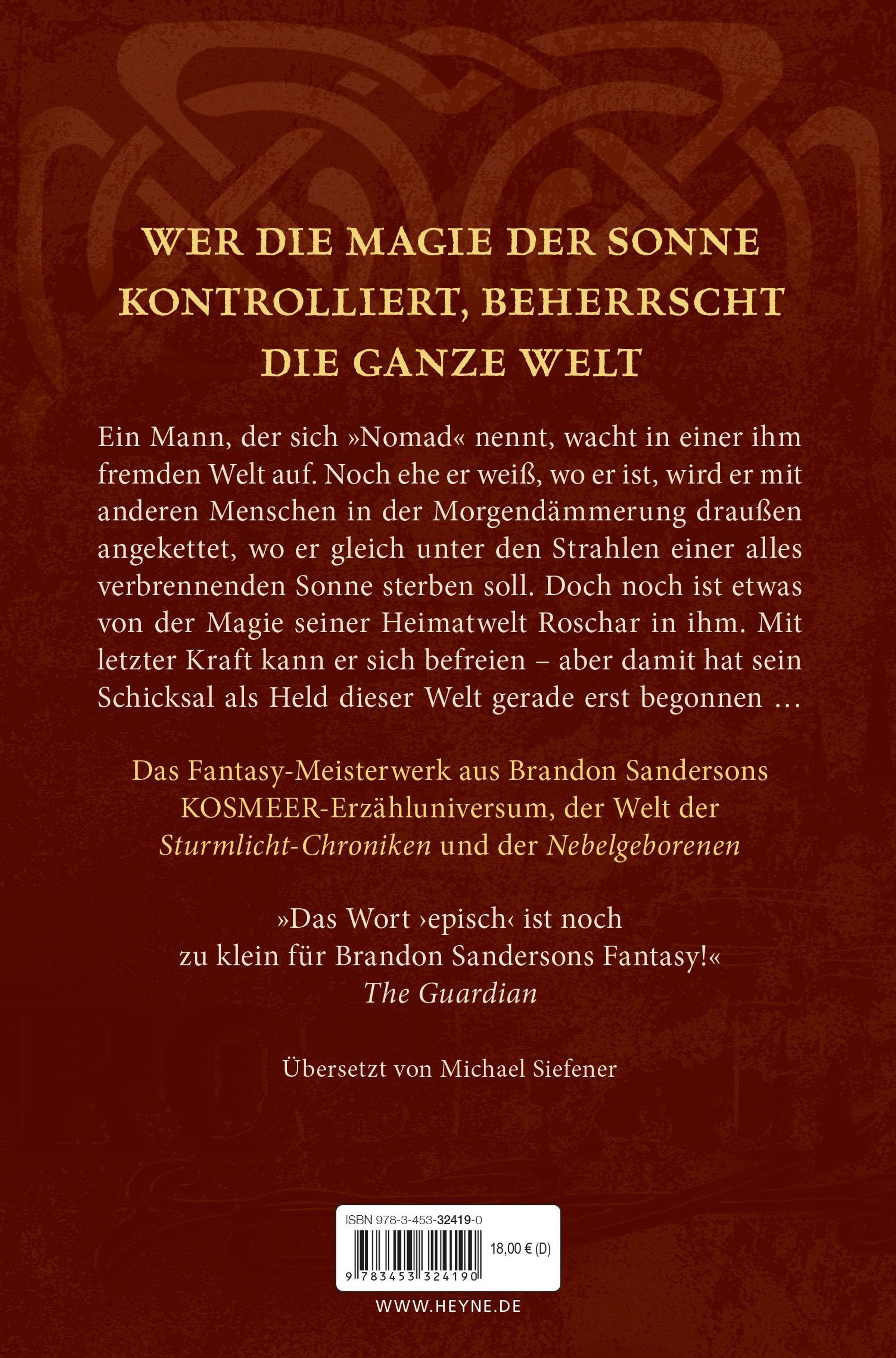 Ein Mann, der sich seit Langem nur noch 'der Nomade' nennt, wacht in einer ihm fremden Welt auf. Noch ehe er herausfinden kann, wo er ist, wird er mit anderen Menschen in der grauen Morgendämmerung draußen angekettet, wo er gleich unter den Strahlen einer alles verbrennenden Sonne sterben soll. Doch noch ist etwas von der Magie seiner Heimatwelt Roschar in ihm. Mit letzter Kraft kann er sich befreien - aber damit hat sein Schicksal als Held dieser Welt gerade erst begonnen.