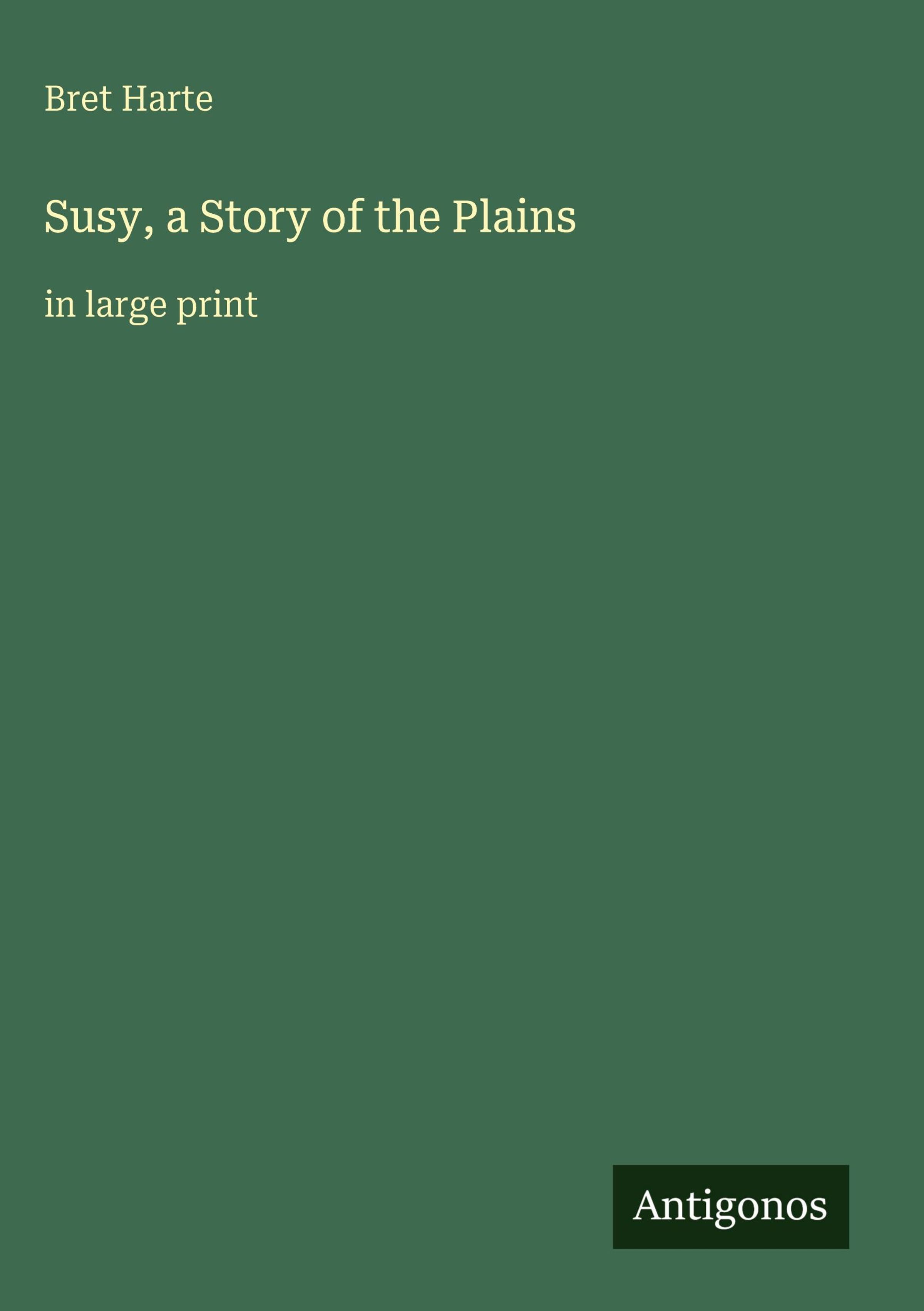 Text: "Bret Harte: Susy, a Story of the Plains, in large print." Am unteren Rand steht "Antigonos". Hintergrund in Grün., Buch