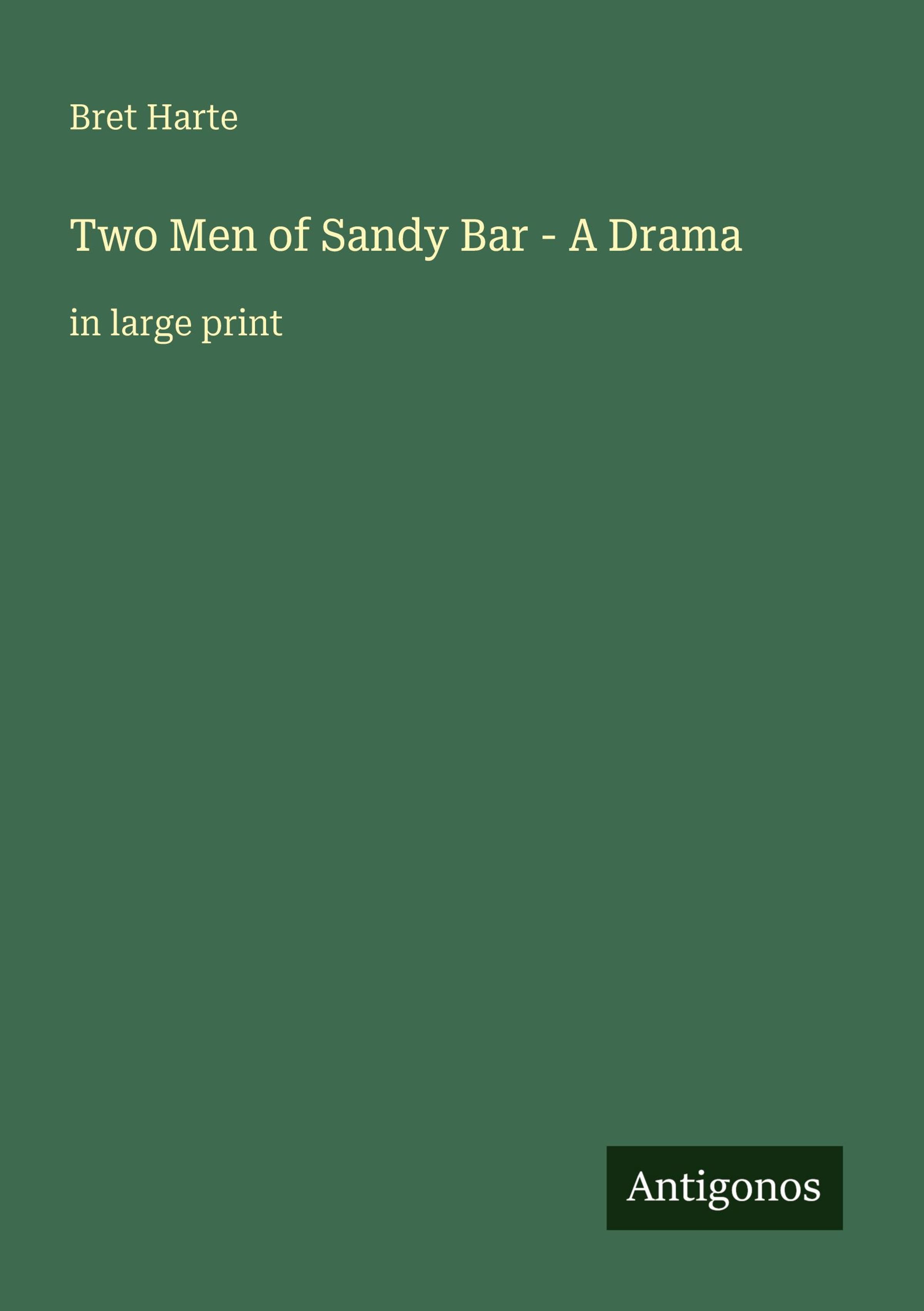 Text: "Bret Harte, Two Men of Sandy Bar - A Drama, in large print, Antigonos." Grüner Hintergrund, schlichtes Design., Buch