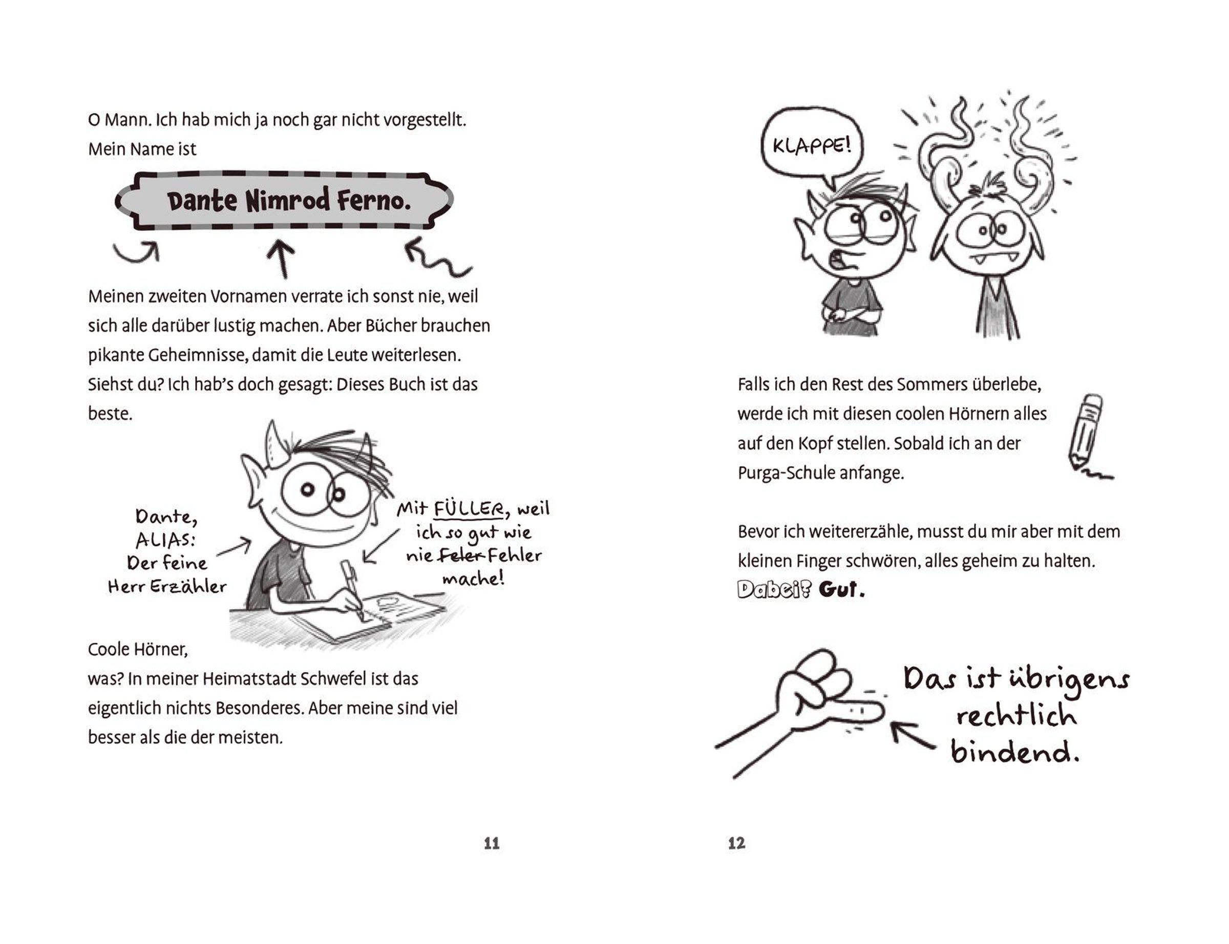 "DANTE N. FERNO", "HÖLLISCH PEINLICH!", "LOSER", "Tritt mich!". Illustrationen von Wesen, die lachen und ein Hauptcharakter., Buch