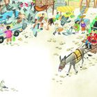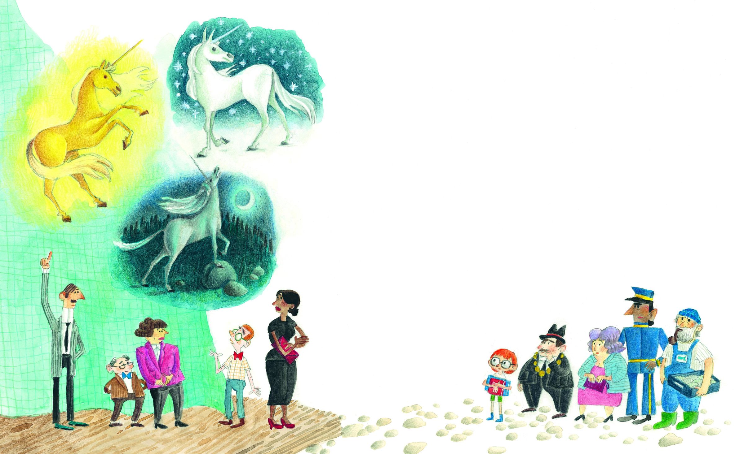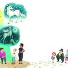 'Kommt her! Seht euch das einzig wahre Einhorn an! Es ist ein äußerst scheues Tier. Nur wer ehrlich ist und niemals lügt, kann das Wundertier erblicken. Tretet ein! Das Einhorn zu sehen, bringt Wohlstand und Glück!'