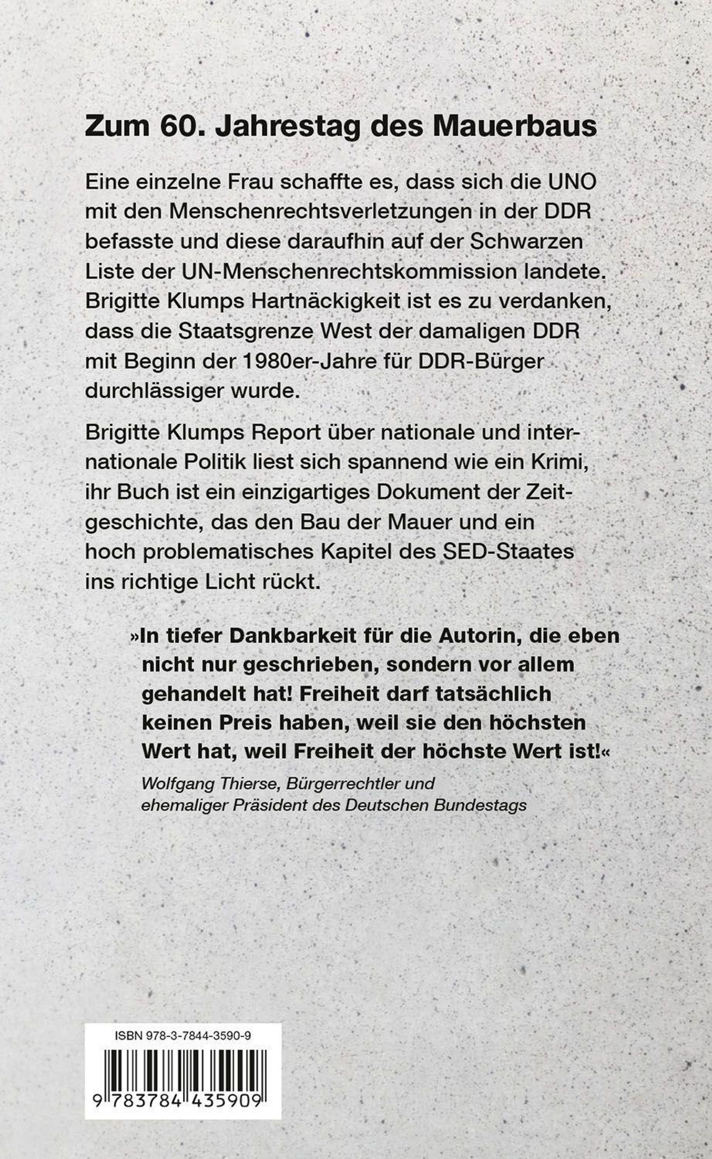 Brigitte Klumps Hartnäckigkeit ist es zu verdanken, dass die DDR 1980 auf der Schwarzen Liste der UN-Menschenrechtskommission landete. Einfach war es nicht, eine Weltbehörde wie die UNO vom Fehlverhalten eines ihrer Mitglieder zu überzeugen, das zudem noch im Weltsicherheitsrat saß. Doch die DDR sagte zu, die ihr vorgehaltenen Rechtsbrüche zu prüfen und zu beseitigen. Tausende DDR-Bürger durften daraufhin ausreisen. Und das alles ohne "besondere Bemühungen der westdeutschen Bundesregierung", die vorher jährlich für rund 100 Millionen Mark Menschen freigekauft hatte. Brigitte Klumps Report über nationale und internationale Politik liest sich spannend wie ein Krimi. Ihr Buch ist ein einzigartiges Dokument der Zeitgeschichte, das anlässlich der 60. Wiederkehr des Mauerbaus an das bittere Unrecht unter dem DDR-Regime erinnert und unbedingt das Wiederlesen lohnt.Anmerkungen:
