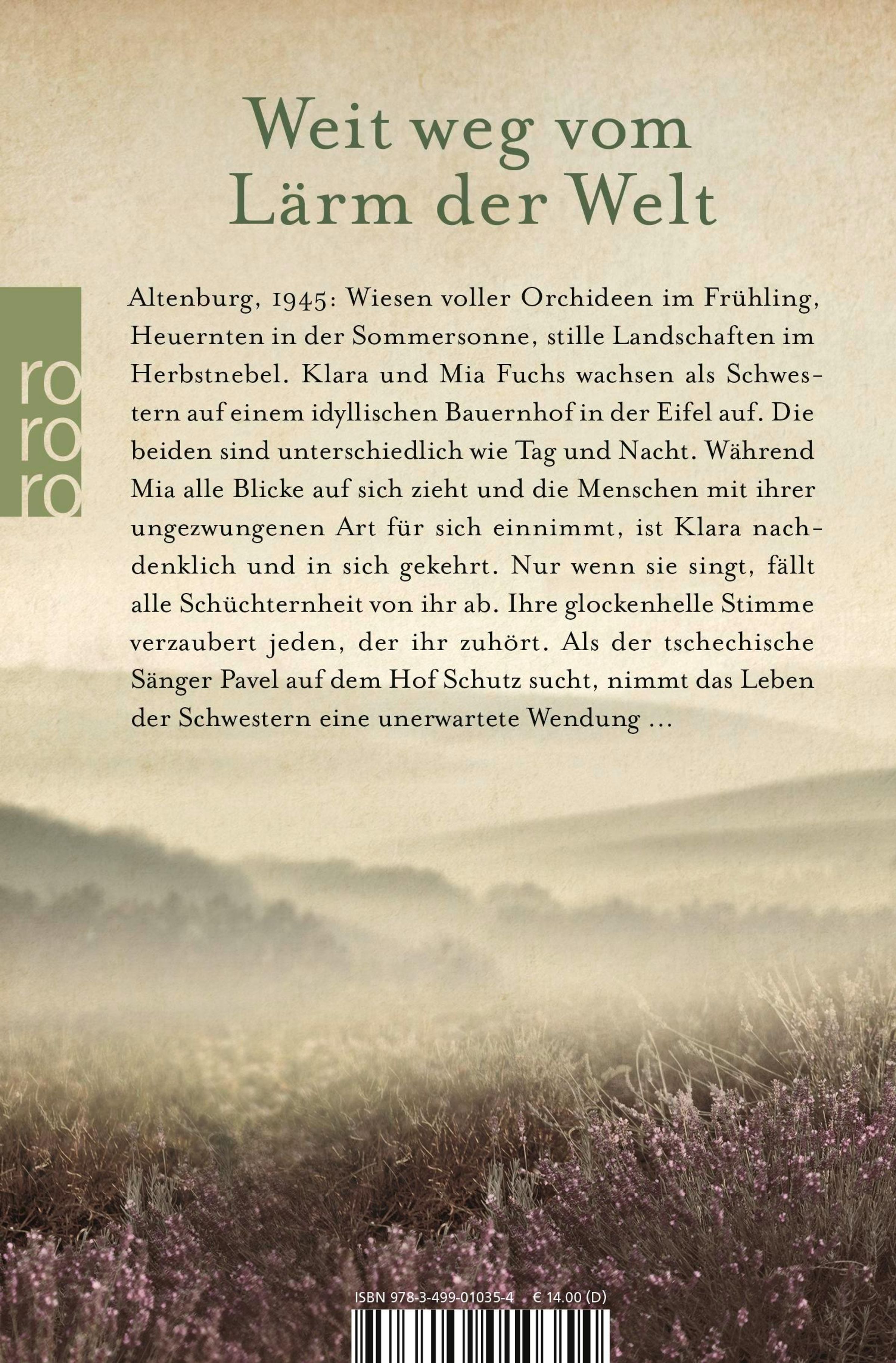 Altenburg, 1945: Wiesen voller Orchideen im Frühling, Heuernten in der Sommersonne, stille Landschaften im Herbstnebel. Klara und Mia Fuchs wachsen als Schwestern auf einem idyllischen Bauernhof in der Eifel auf. Die beiden sind unterschiedlich wie Tag und Nacht. Während Mia alle Blicke auf sich zieht und die Menschen mit ihrer ungezwungenen Art für sich einnimmt, ist Klara nachdenklich und in sich gekehrt. Nur wenn sie singt, fällt alle Schüchternheit von ihr ab. Ihre glockenhelle Stimme verzaubert jeden, der ihr zuhört. Als der tschechische Sänger Pavel auf dem Hof Schutz sucht, nimmt das Leben der Schwestern eine unerwartete Wendung ...