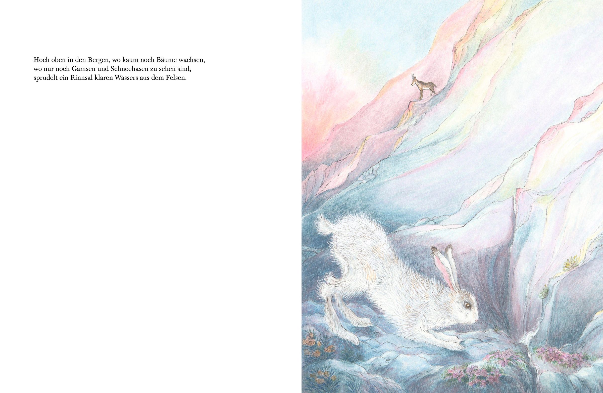 Hoch oben in den Bergen plätschert Wasser aus einer Quelle. Aus dem Rinnsal wird ein Bach, der munter zu Tal fließt und fünf Lärchenzapfen auf eine abenteuerliche Reise mitnimmt. Sie überwinden Wasserfälle, durchqueren Täler und Städte, und immer wieder entdeckt einer der Zapfen einen Ort, wo es ihm gefällt und er ein Zuhause findet. Bevor der letzte Zapfen auf das endlose Meer hinaustreibt, spült ihn eine Welle ans Ufer. Was wird er dort erleben?