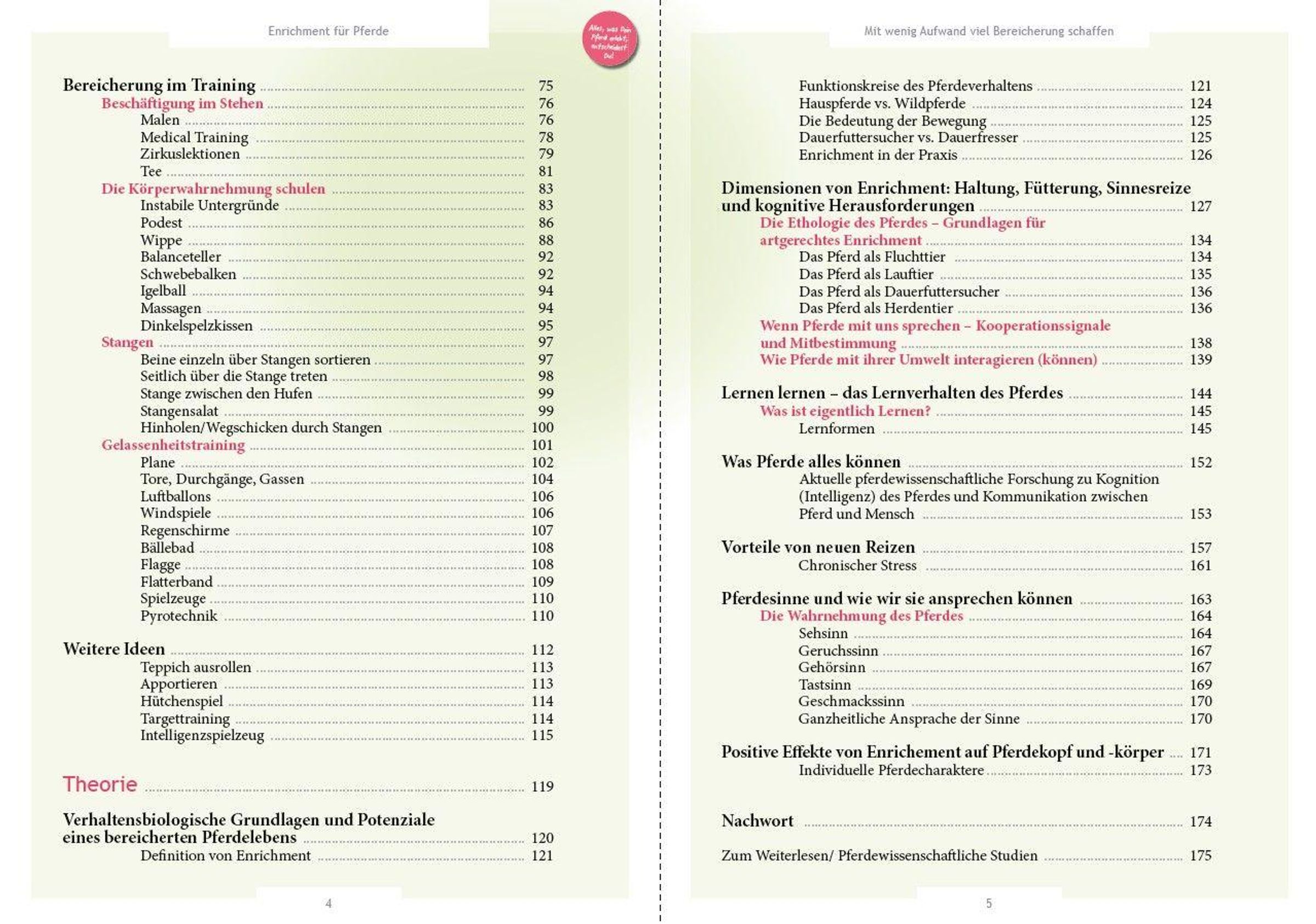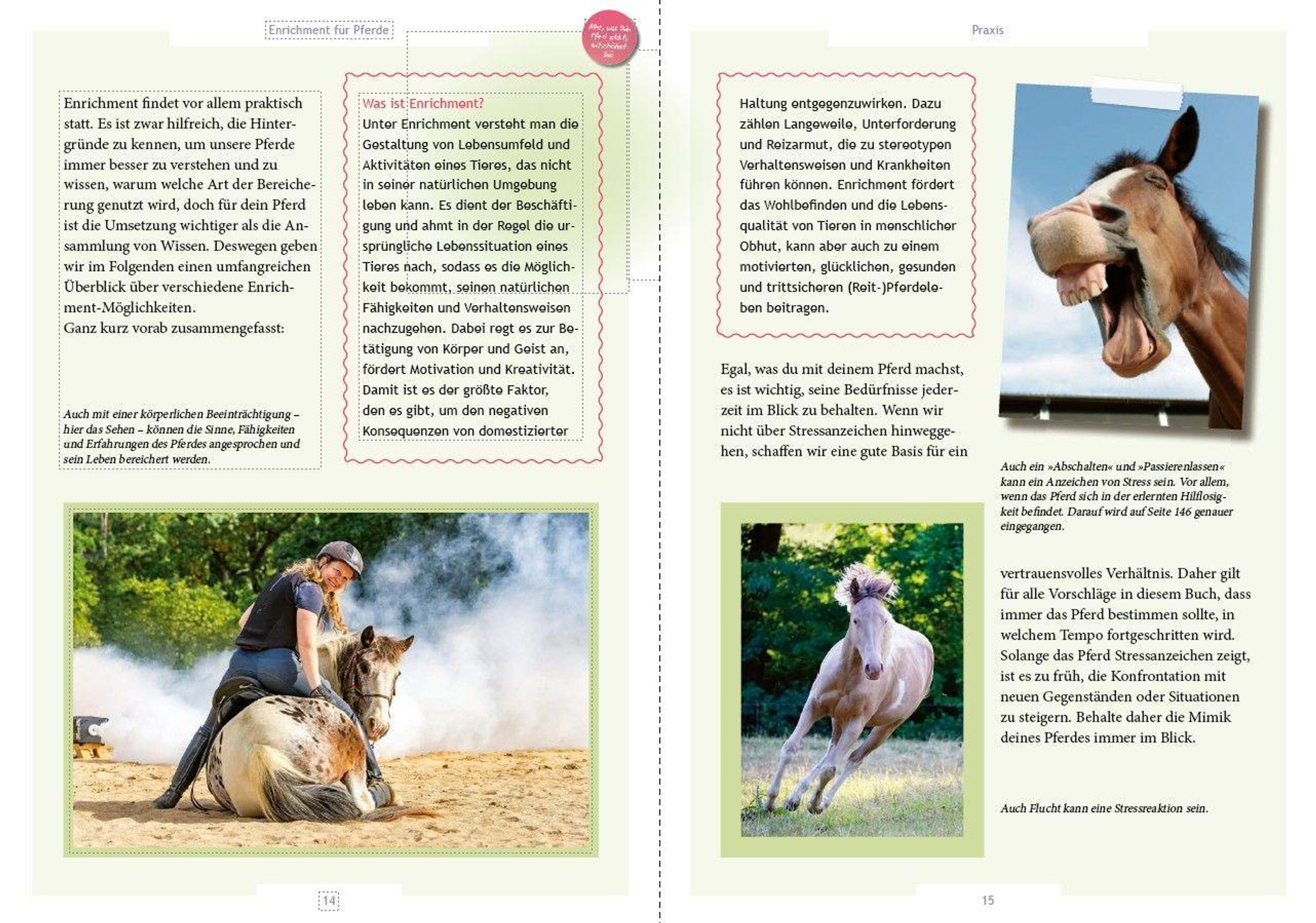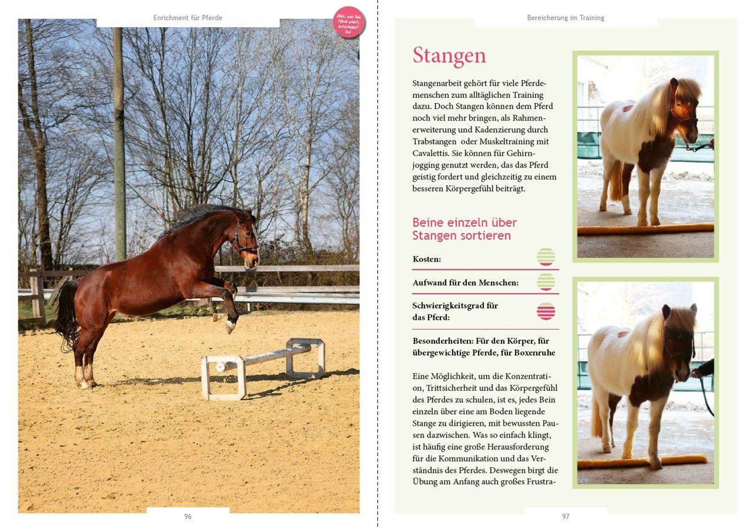 Pferde sind unsere Sportpartner und Freunde. Deshalb tun wir alles, damit es ihnen bei uns gut geht. Doch was bedeutet es, einem Pferd ein erfülltes und glückliches Leben zu ermöglichen? Für die Autorinnen ist die Antwort klar: Enrichment. Enrichment ist ein unverzichtbarer Bestandteil der artgerechten Pferdehaltung und betrifft somit den Alltag eines jeden Pferdes. Dieses Buch zeigt, wie durch Training, Haltungsoptimierung und kleine Spielereien das Leben der Pferde bereichert werden kann. All das ist gut für die körperliche Gesundheit der Tiere, das seelische Wohlbefinden sowie für ihre Intelligenz, Neugier und ihren Mut.
