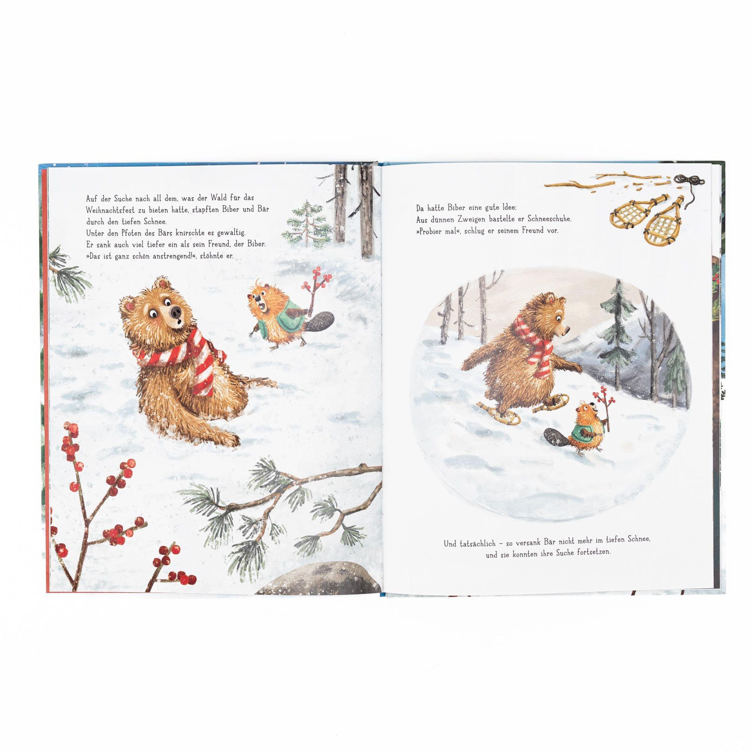 Der erste Schnee rieselt auf den Waldboden, und da wissen Biber und Bär: Ganz bald ist Weihnachten! Dieses Fest wollen die beiden natürlich gemeinsam feiern. Und so stapfen sie durch den zauberhaft verschneiten Wald, um all die Vorbereitungen zu treffen, die den Weihnachtsabend besonders machen: Sie sammeln Bucheckern und Tannenzapfen für den herrlichsten Baumschmuck, und der Biber fällt den größten Baum, den sie finden können. Doch der Baum ist so groß, dass Biber an den Bärenhöhlendecke klebt und Bär gar nicht mehr reinpasst.