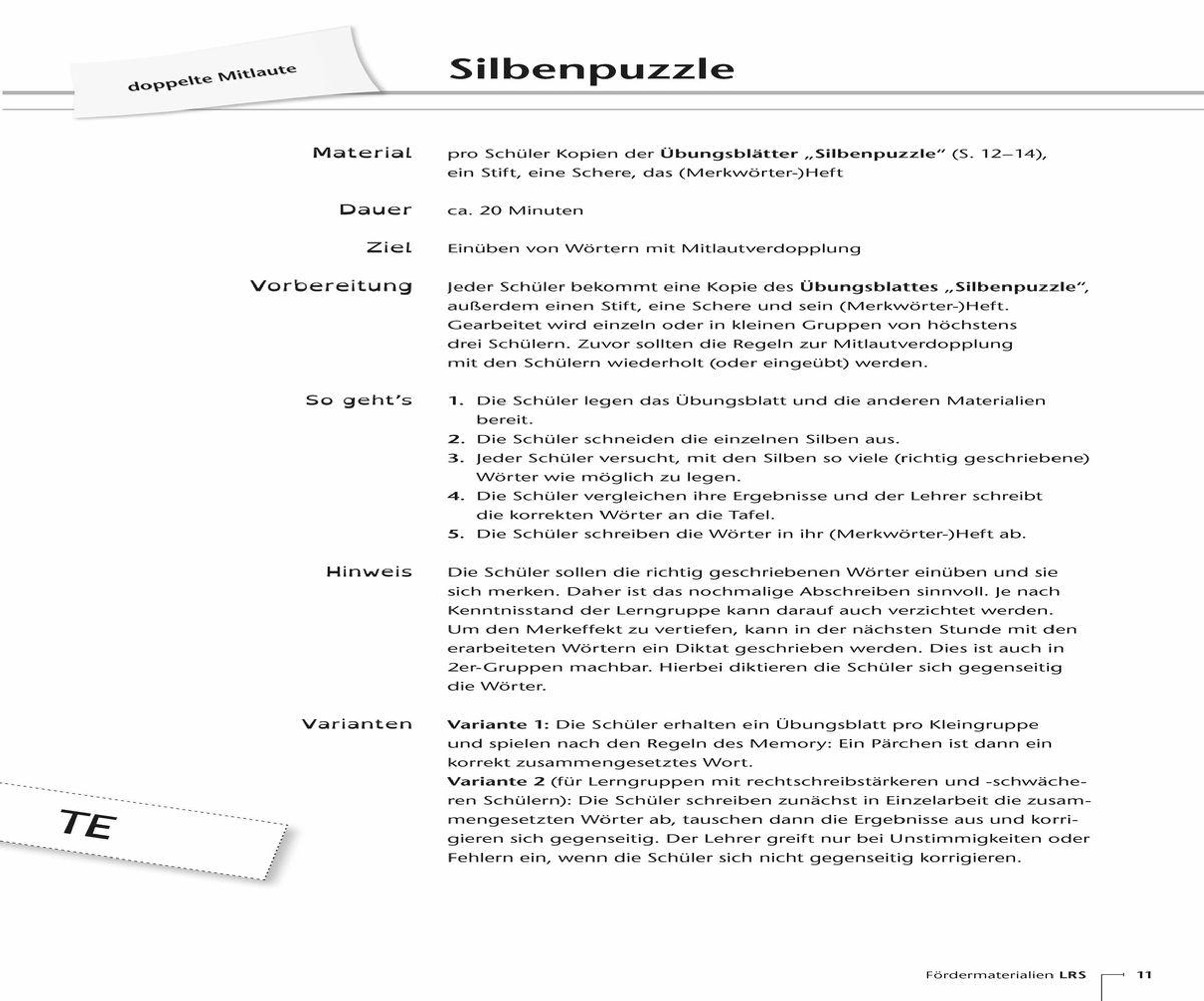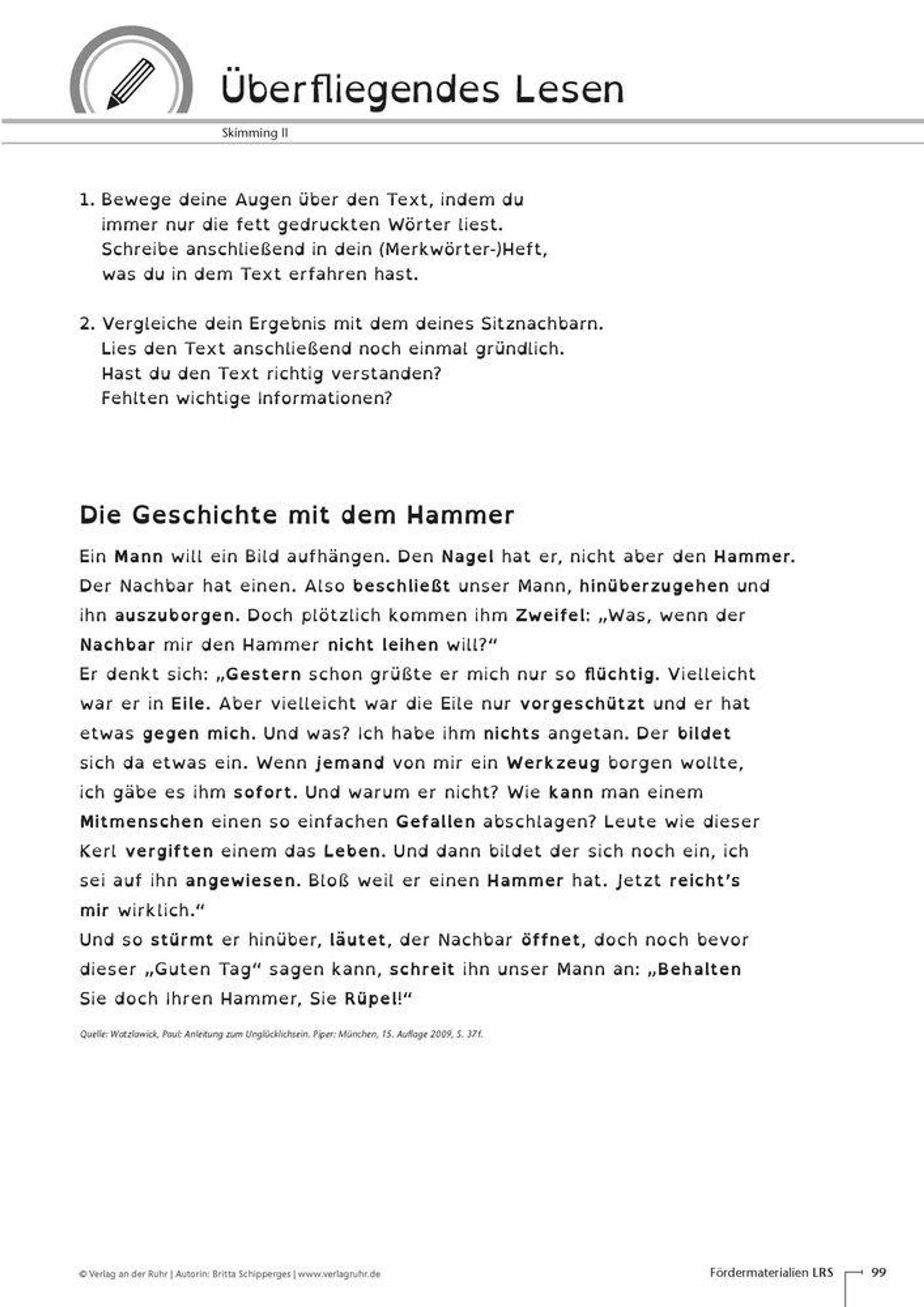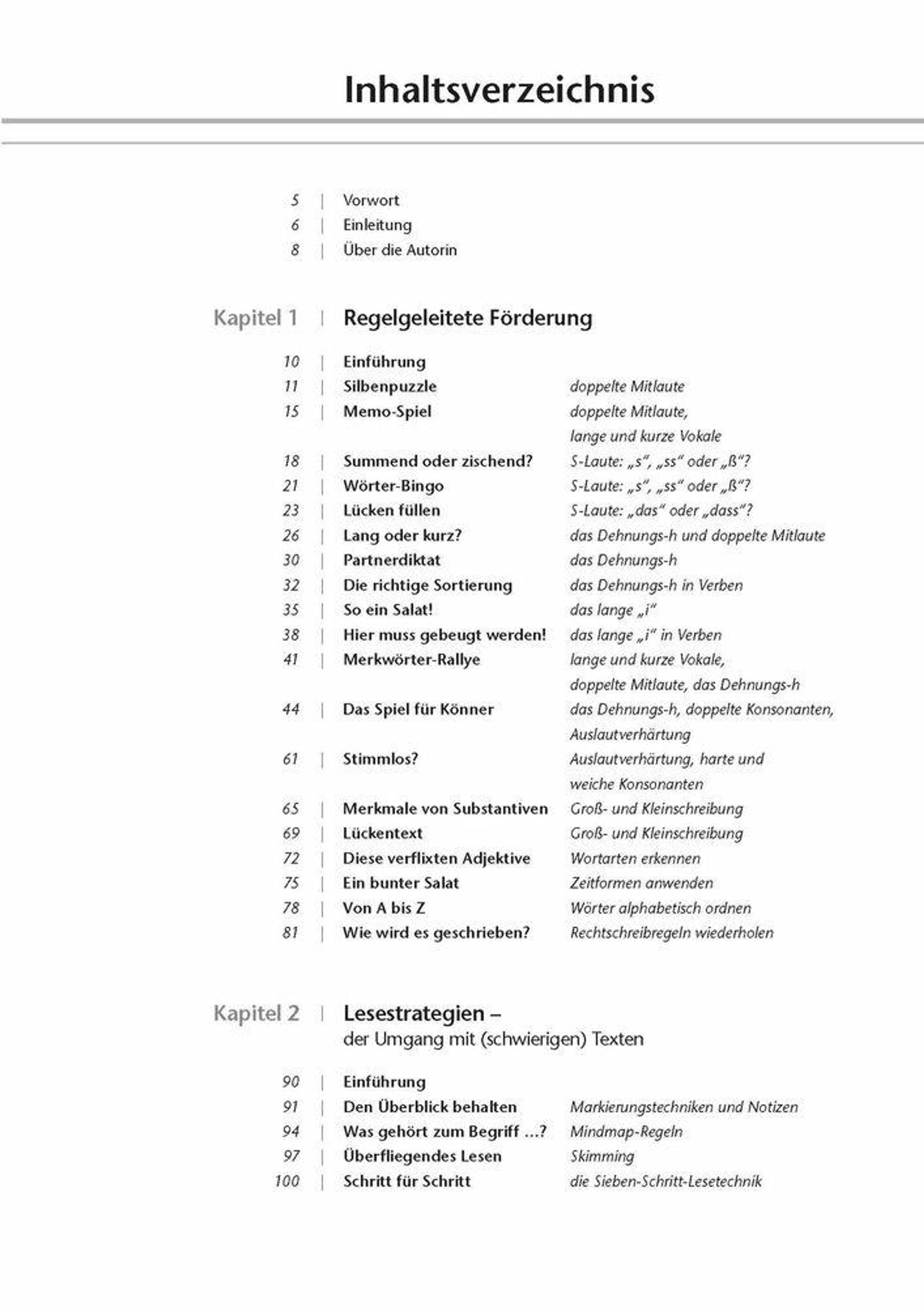 Fördermaterialien für Lehrer der Sekundarstufe an Förderschule, Hauptschule, Realschule, Gesamtschule und Gymnasium, Fach: Deutsch, Förderunterricht Deutsch, Klasse 5-10 +++ Nicht nur in Grundschulen sitzen Schüler mit einer Lese-Rechtschreib-Schwäche: Auch in der Sekundarstufe I haben sie mit dieser Lernschwierigkeit zu kämpfen. Mit diesen speziell auf die Bedürfnisse der Schüler der Sekundarstufe I zugeschnittenen Fördermaterialien erhalten Sie Kopiervorlagen mit konkreten Übungen zu den vier Bereichen "Regelgeleitete Förderung", "Lesestrategien - Der Umgang mit (schwierigen) Texten", "Konzentration" und "LRS und Fremdsprachen". So lassen sich grundlegende Strategien beim Erwerb von Lesen und Rechtschreiben ebenso fördern und trainieren wie die Kenntnis und der Einsatz von Lern- und Merktechniken. Anhand konkreter Beispieltexte können die Schüler Lesetechniken, wie das Skimming (überfliegendes Lesen), ebenso üben wie das Markieren wichtiger Textstellen oder das Mindmapping. Mit dem Einsatz der verschiedenen Übungen und Spiele, z. B. zum Dehnungs-h, zu S-Lauten, langen und kurzen Vokalen oder doppelten Mitlauten, gelingt Ihnen eine umfassende regelgeleitete Förderung sowohl im Fach- als auch Förderunterricht ohne große Vorbereitungszeit. Je nach Bedarf und Kenntnisstand Ihrer Lerngruppe können Sie zudem Infoblätter austeilen, die z. B. die Wortarten erklären und dabei helfen, die Thematik zu erläutern und Hilfestellung zu geben. Lösungsblätter dienen der Selbstkontrolle und ermöglichen ein selbstständiges Arbeiten. So können die Schüler überprüfen, ob sie z. B. die Regeln zur Groß- und Kleinschreibung richtig verstanden haben und anwenden können. Mit diesen Fördermaterialien können Sie Ihre Schüler dabei unterstützen, die Lese- und Rechtschreibschwierigkeiten abzubauen.
