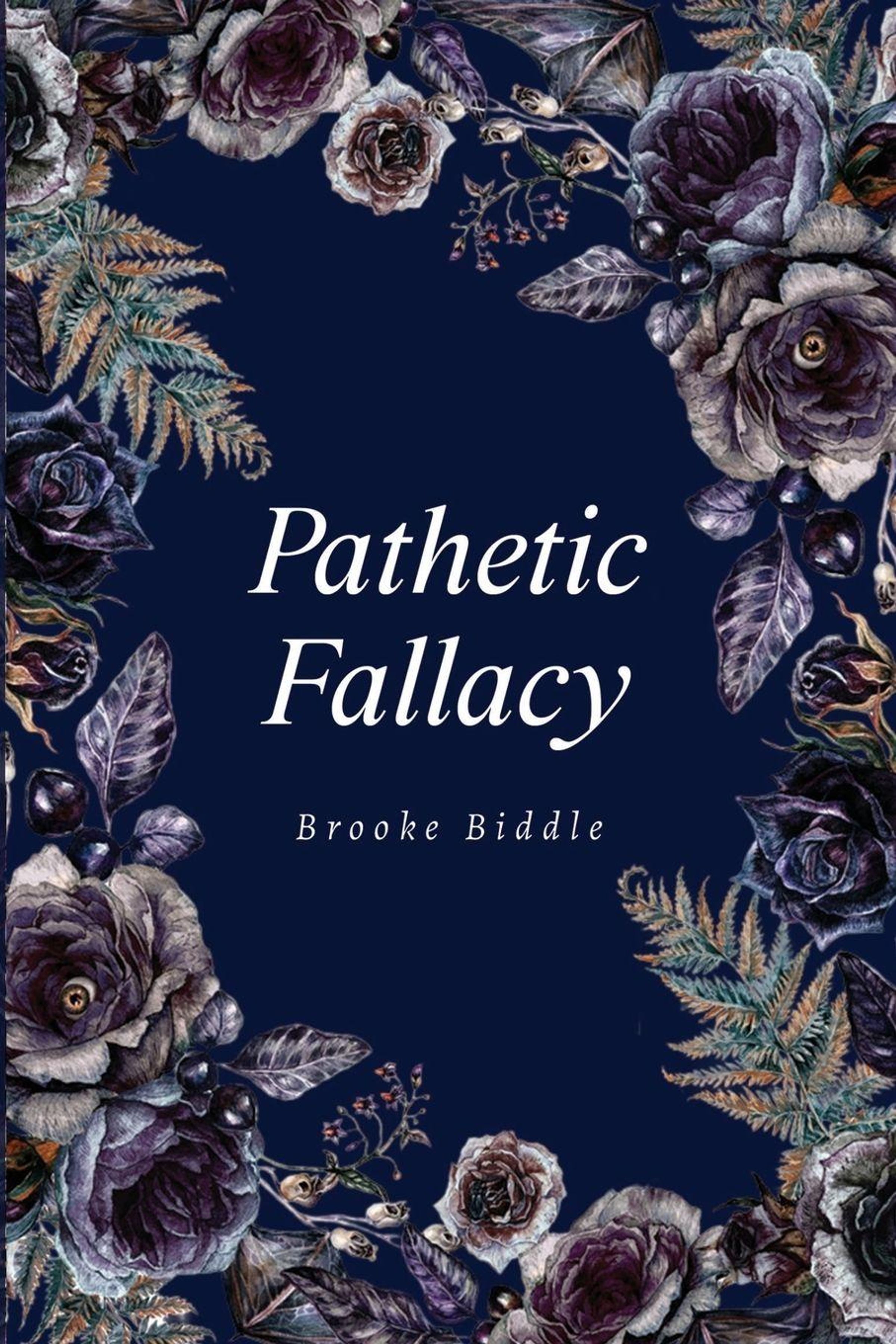 "Pathetic Fallacy" von Brooke Biddle. Dunkelblauer Hintergrund mit kunstvollen Blumen in lila und blauen Tönen verziert., Buch