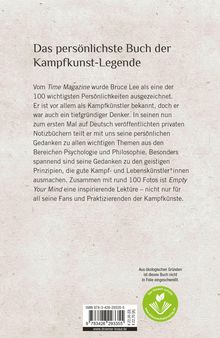 Bruce Lee ist vor allem als Kampfkünstler bekannt, doch er war auch ein tiefgründiger Denker. In seinen nun zum ersten Mal auf Deutsch veröffentlichten privaten Notizbüchern teilt er mit uns seine persönlichen Gedanken zu allen wichtigen Themen aus den Bereichen Psychologie und Philosophie. Besonders spannend ist seine Auffassung von den geistigen Prinzipien, die gute Kampf- und Lebenskünstler*innen ausmachen. Zusammen mit rund 100 Fotos ist Empty Your Mind ein Jubiläumsband zum 50. Todestag des Meisters am 20. Juli 2023, auf den all seine Fans und Praktizierenden der Kampfkünste nicht verzichten können.