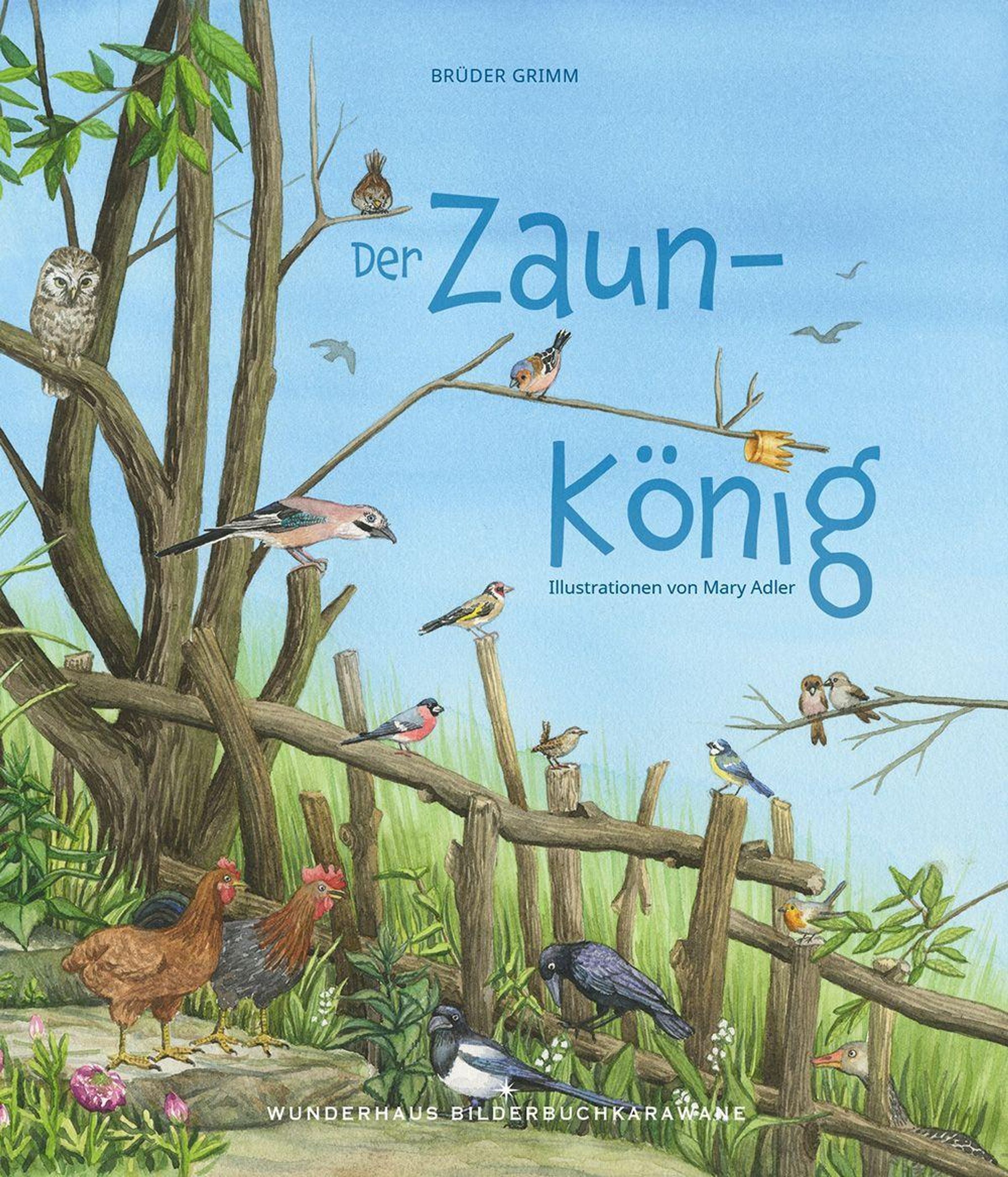„Brüder Grimm: Der Zaunkönig“, Illustration von Mary Adler. Mehrere Vögel und Hühner auf einem Holzzaun und Wiese., Buch