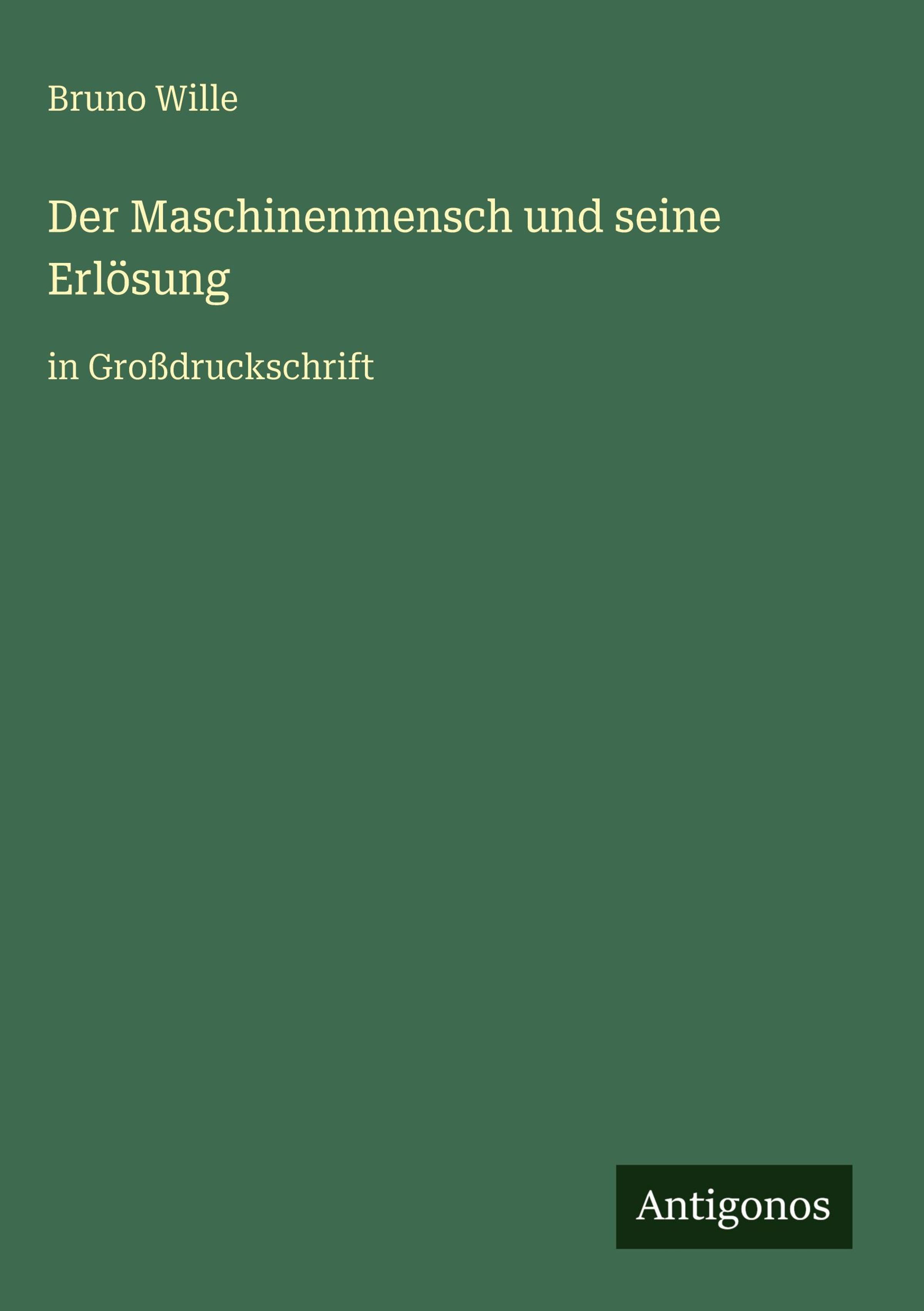 Bruno Wille, "Der Maschinenmensch und seine Erlösung", in Großdruckschrift. Grüner Hintergrund. Antigonos-Logo unten., Buch