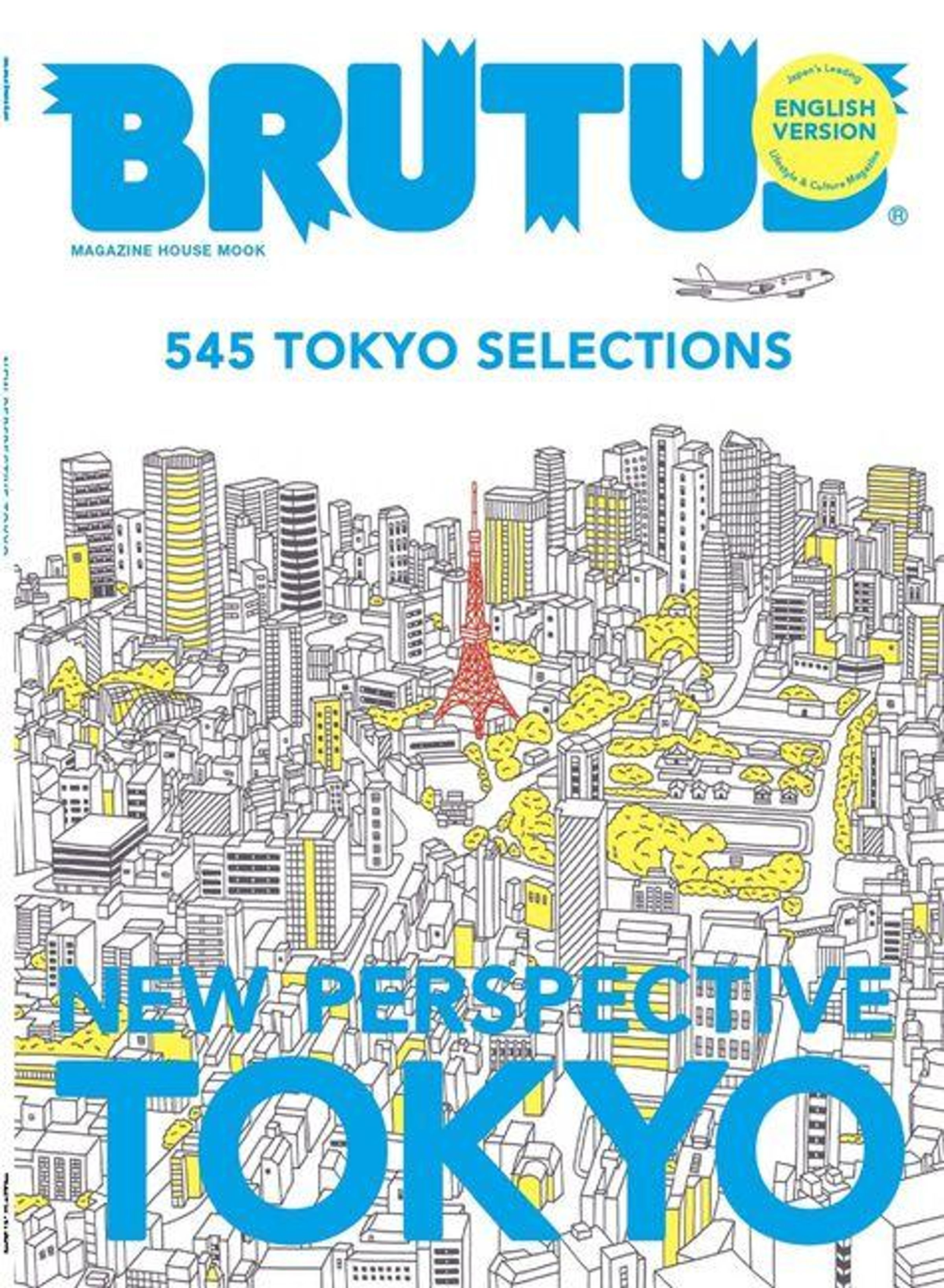 "545 TOKYO SELECTIONS. NEW PERSPECTIVE TOKYO." Illustration einer Stadtansicht mit dem Tokyo Tower im Zentrum. Flugzeug oben rechts., Buch