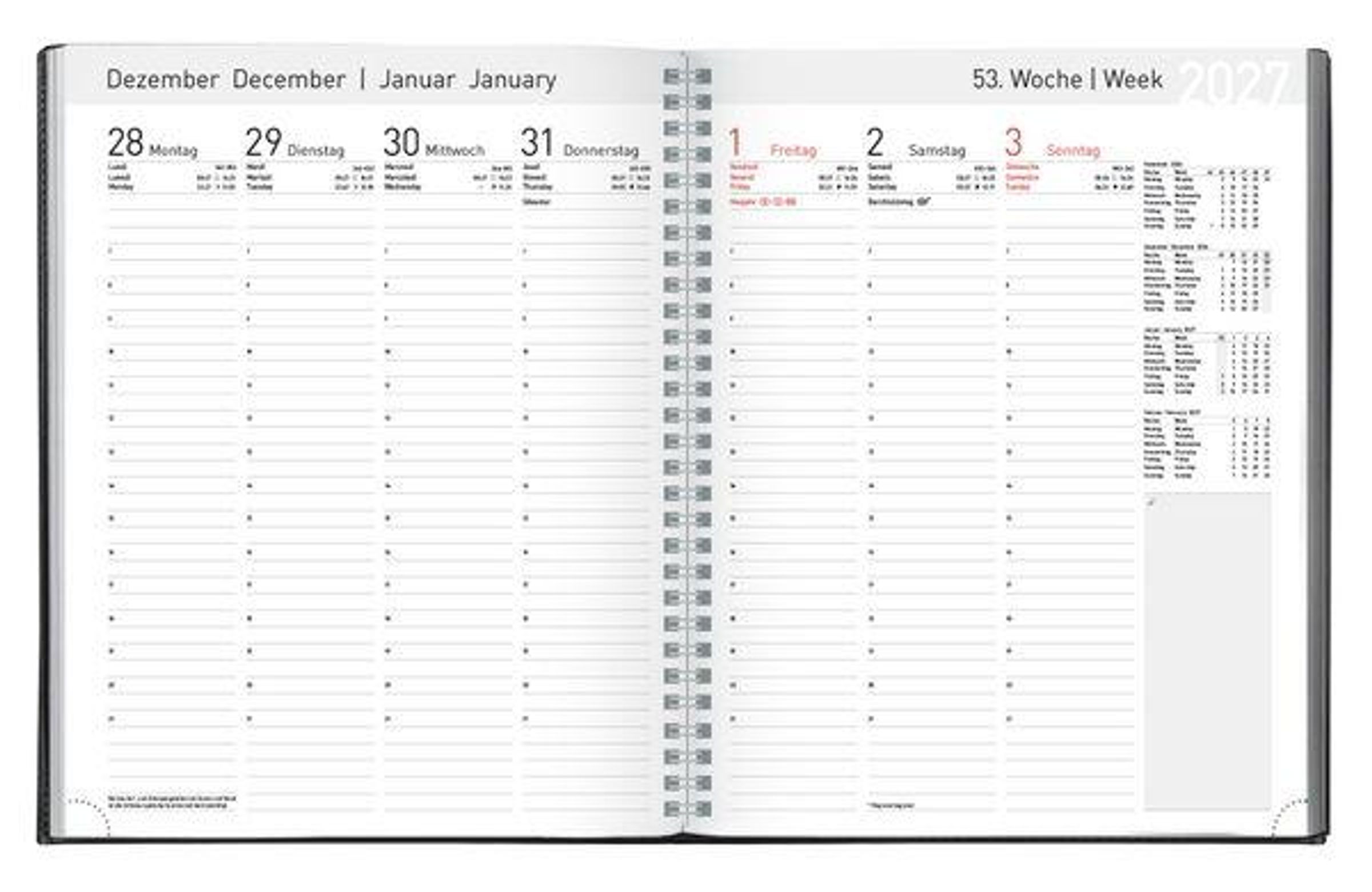 Hochwertiger Buchkalender mit edlem schwarzem Wechseleinband und Spiralbindung. 128 Seiten. Pro Woche 1 Doppelseite. Kalendarium d-e-f-i. Mit Registerheft A-Z, 24 Seiten.