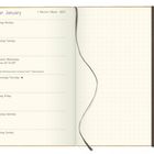 - Jede Doppelseite des 12 Monats-Kalendariums zeigt die Wochenübersicht sowie eine Seite für Notizen