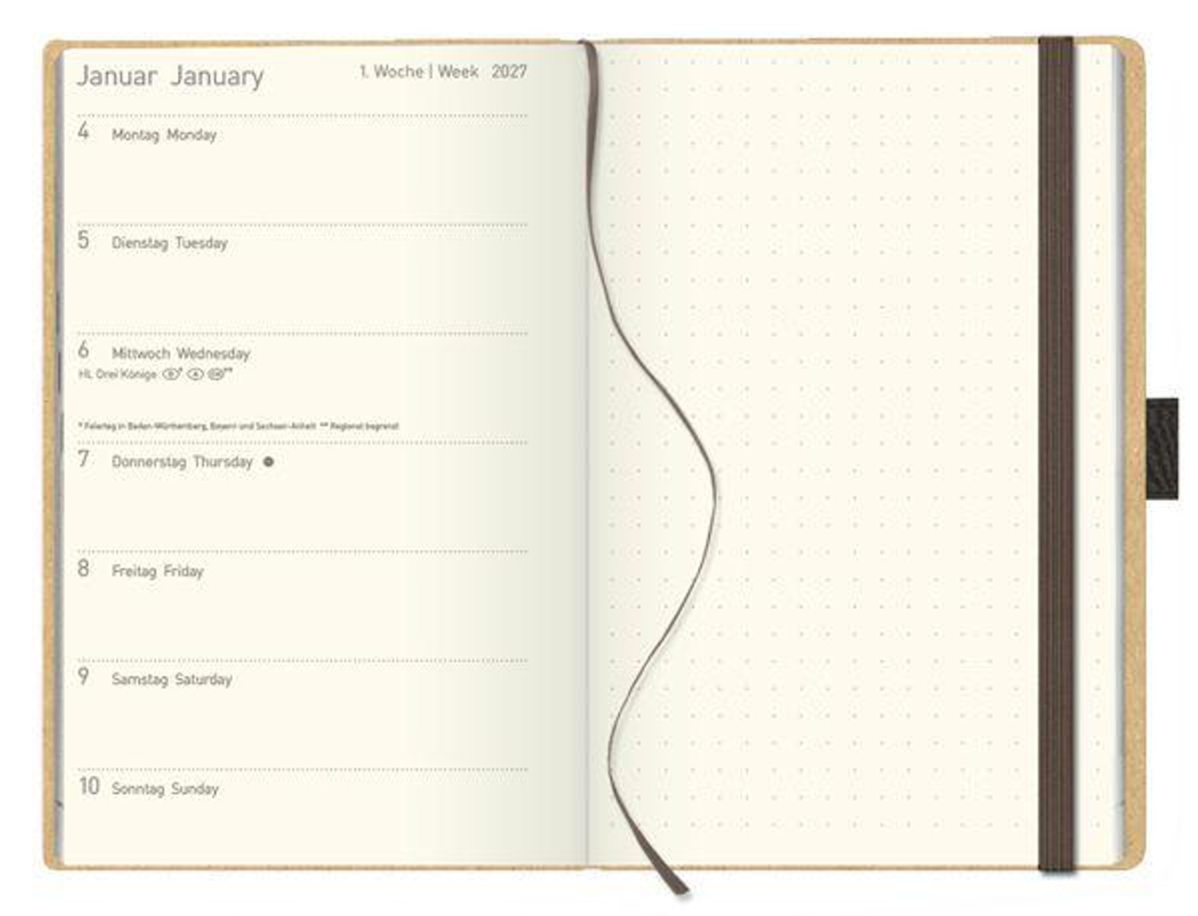- Nachhaltiger Terminplaner mit Wochenübersicht, Platz für Notizen, Leseband und Stifthalter. 13 x 21 cm