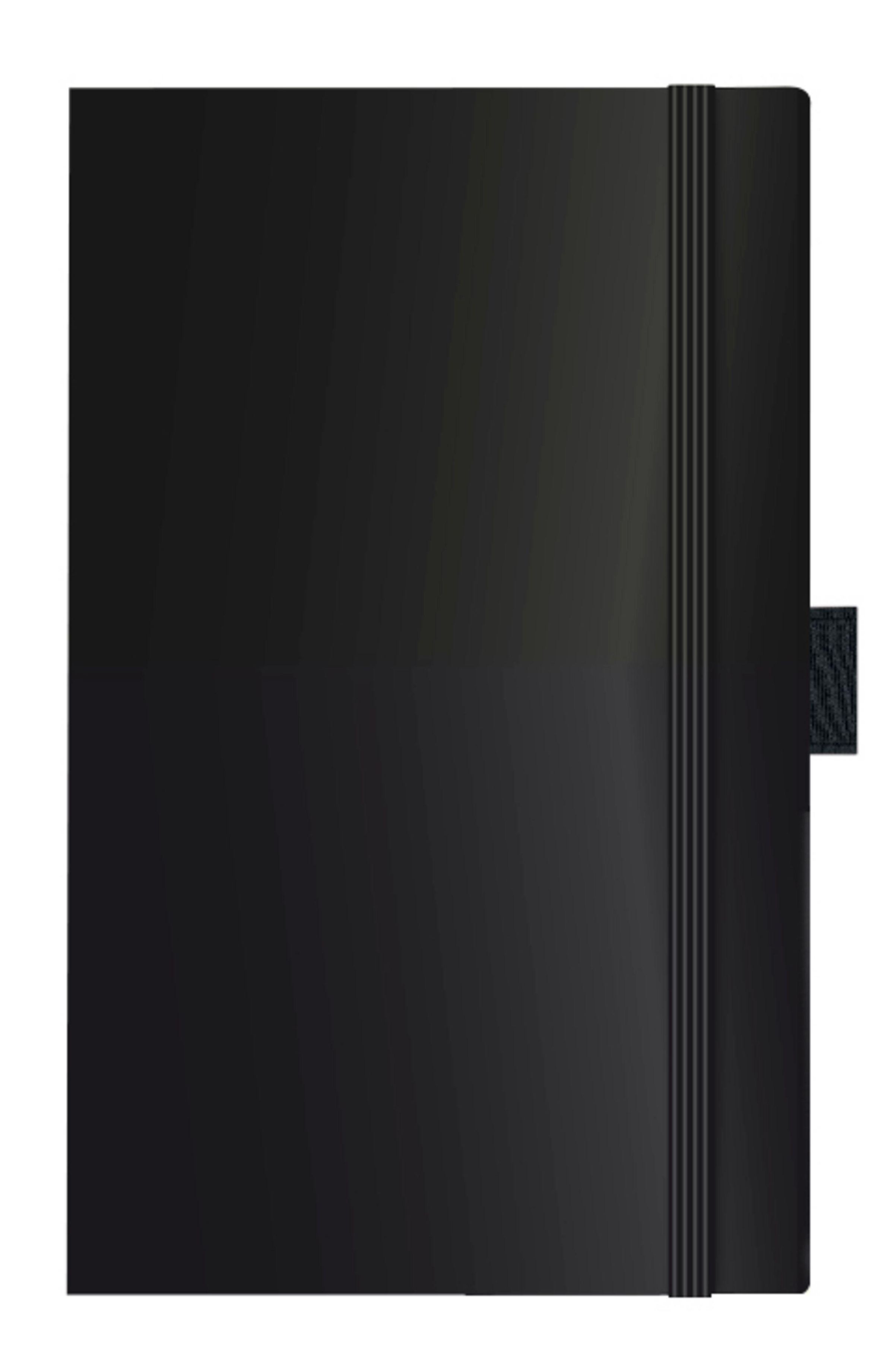 Ein schlichtes schwarzes Notizbuch, mit elastischem Band und Stifthalter an der Seite., Buch