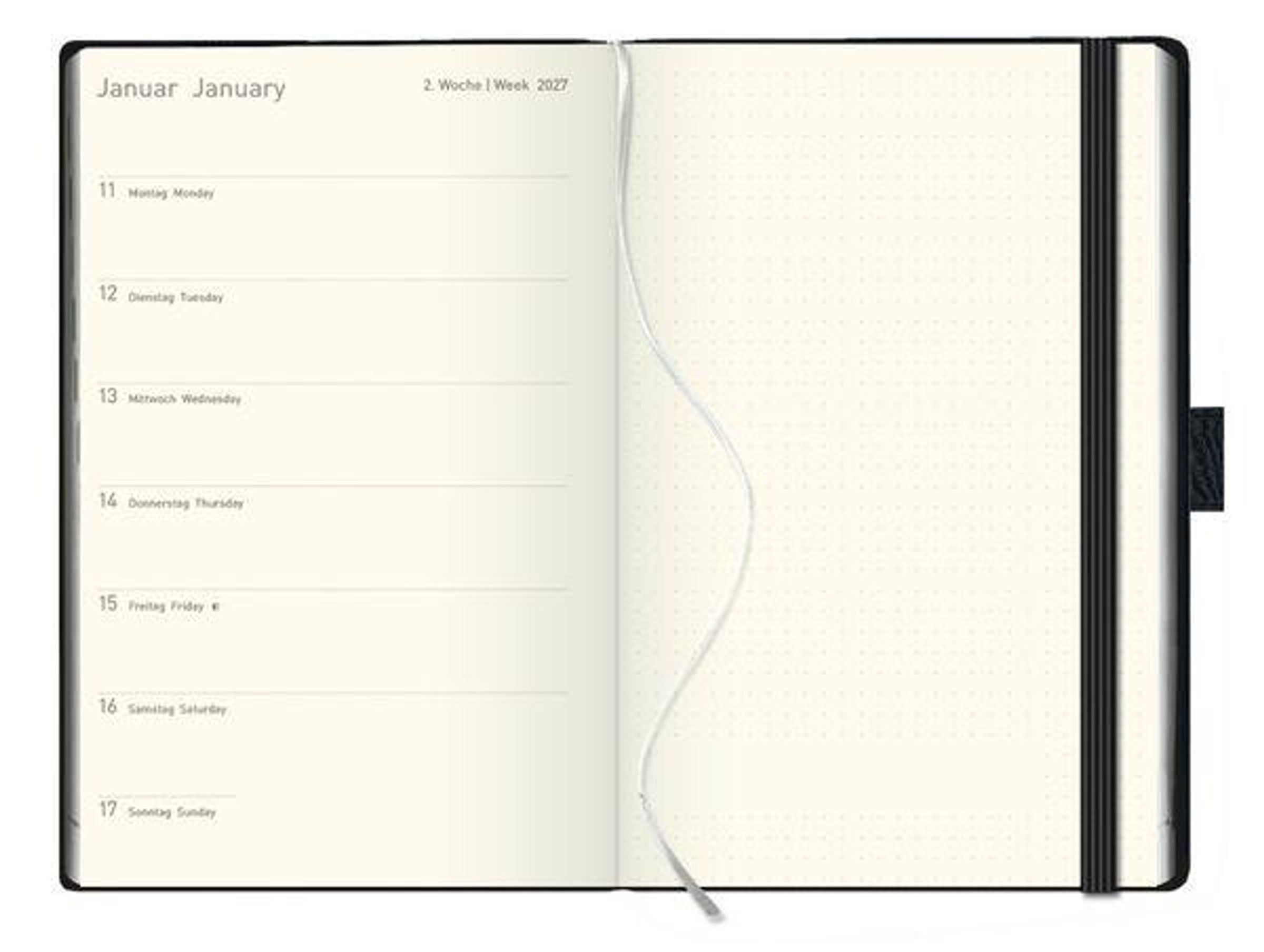 Hochwertiger Terminkalender. Auf der linken Seite die Wochenübersicht und auf der rechten Seite viel Platz für Notizen. Hardcover schwarz. 144 Seiten. 12-monatiges Kalendarium in Deutsch und Englisch.