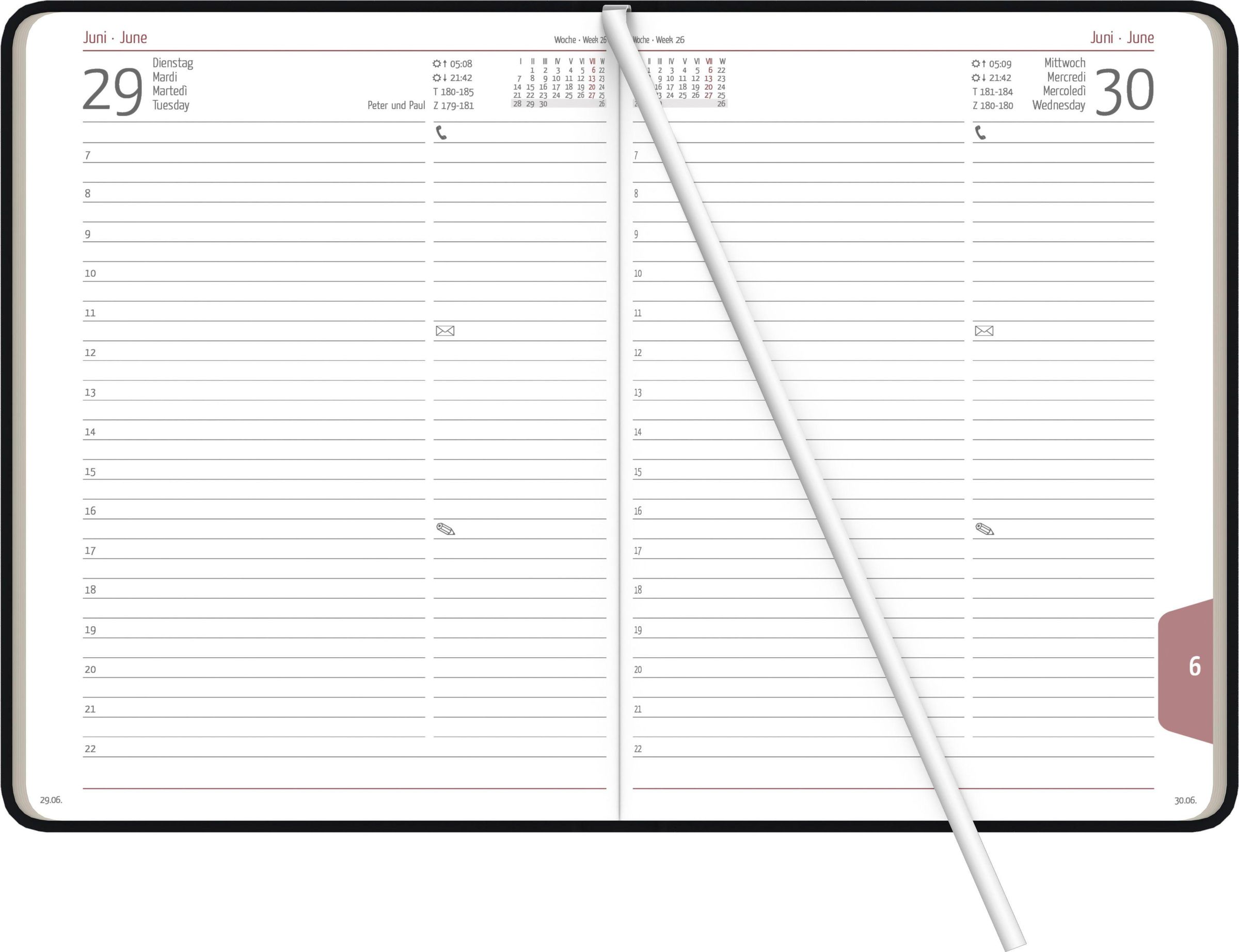 Praktische Registerstanzung, Eckenperforation und Leseband für schnelles Auffinden des aktuellen Tages