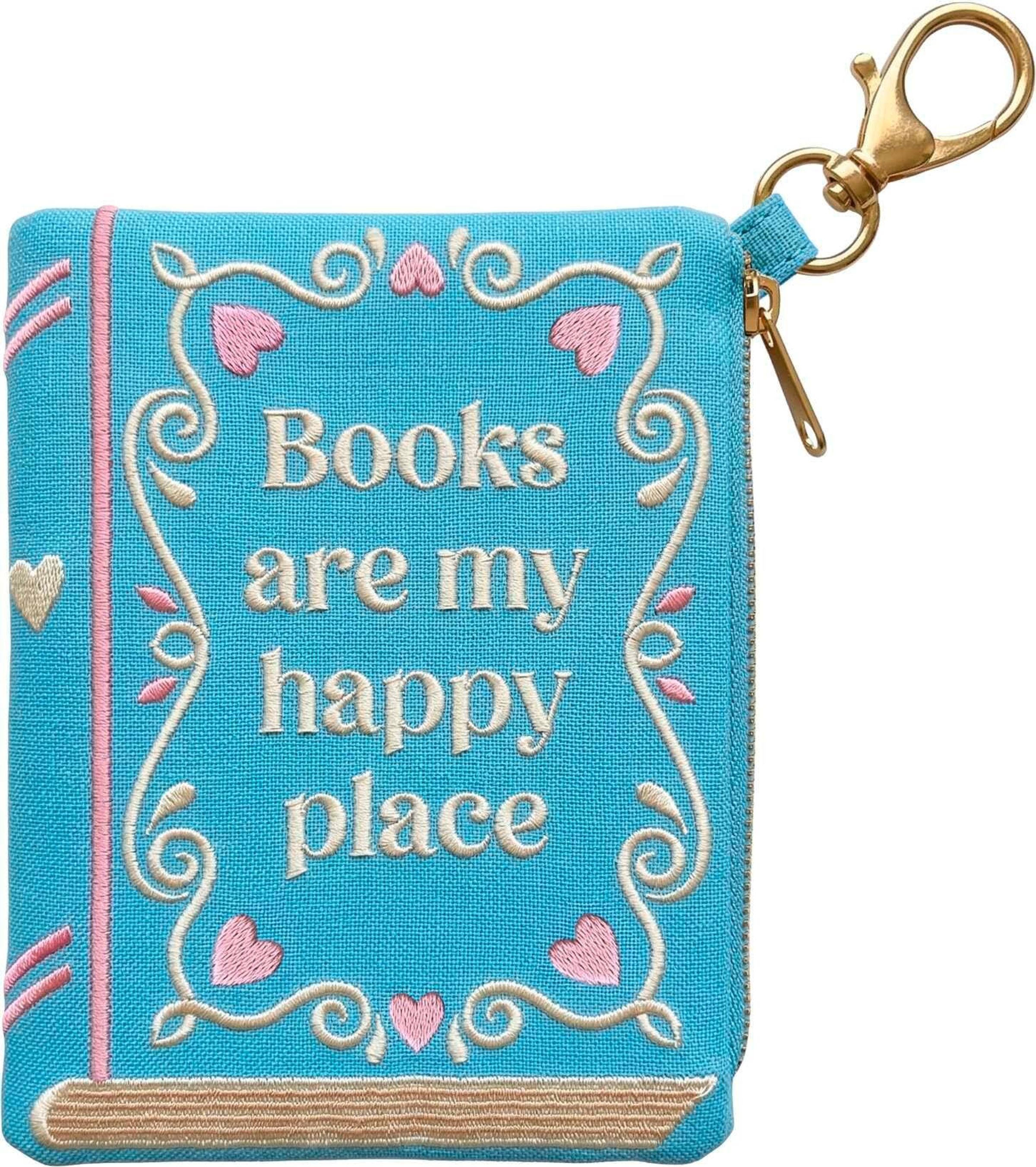 Dieses hochwertige Täschchen ist der perfekte Begleiter für alle Buchliebhaber*innen: ob für den Trip in die lokale Buchhandlung, als Etui für den Büchereiausweis oder als kleine Tasche für Lesungen und Buch-Events - im stabilen Stoffbeutel mit Reißverschluss kann nichts verloren gehen und mit dem praktischen Haken lässt sich das Täschchen sicher im Rucksack oder an der Gürtelschlaufe verstauen. Auch als Schlüsselanhänger oder Bag Charm ist es ein praktisches Accessoire. Durch die Buchcover-Optik und den aufgestickten Spruch "Books are my happy place" wird das Täschchen zudem zum fröhlichen Statement-Piece , das zeigt, dass du ein echter Bücherfan bist. Auch als kleines Mitbringsel für die bücherliebende Freundin oder den buchvernarrten Freund oder als Geschenkverpackung für einen Buchgutschein kann der Beutel trumpfen.