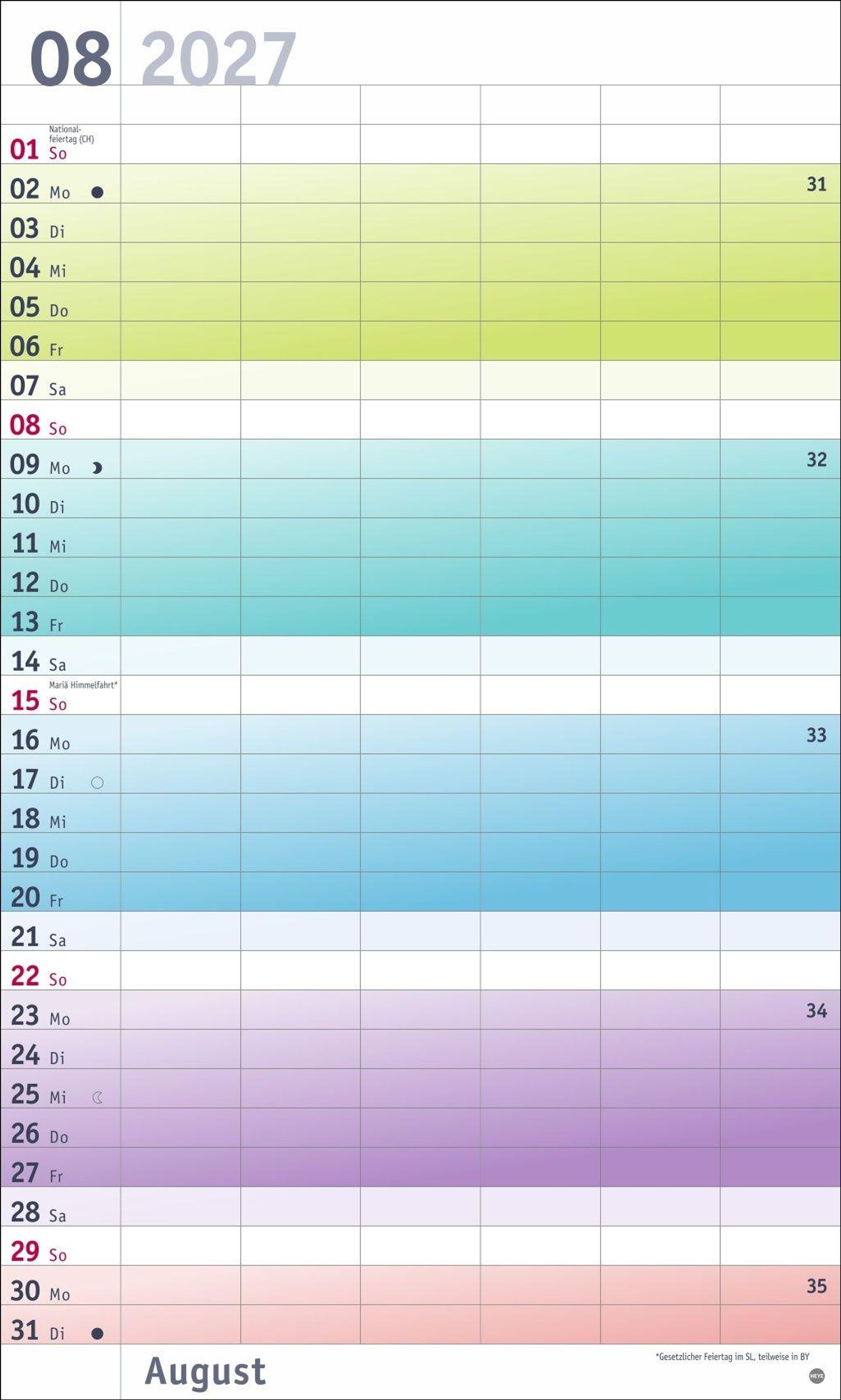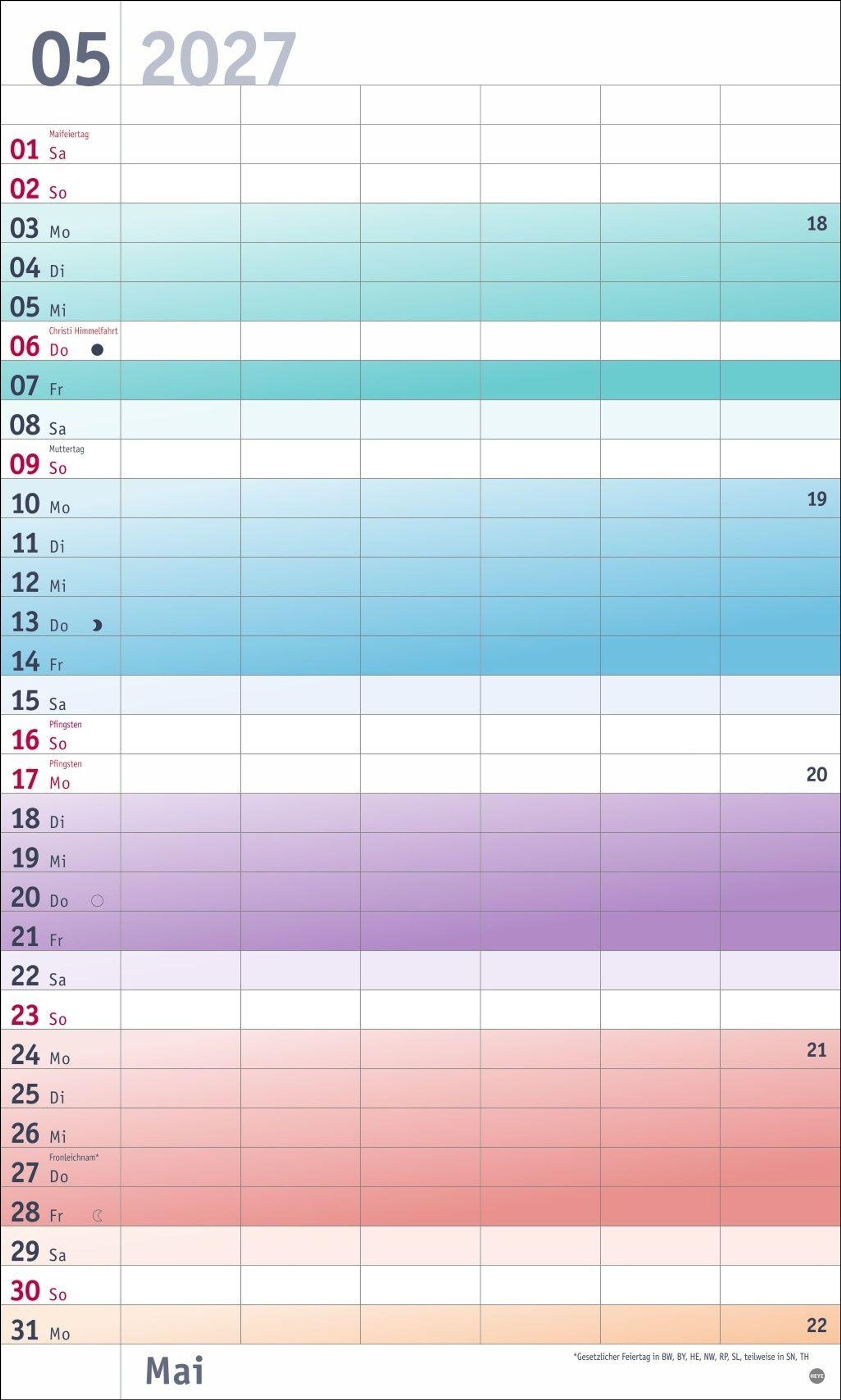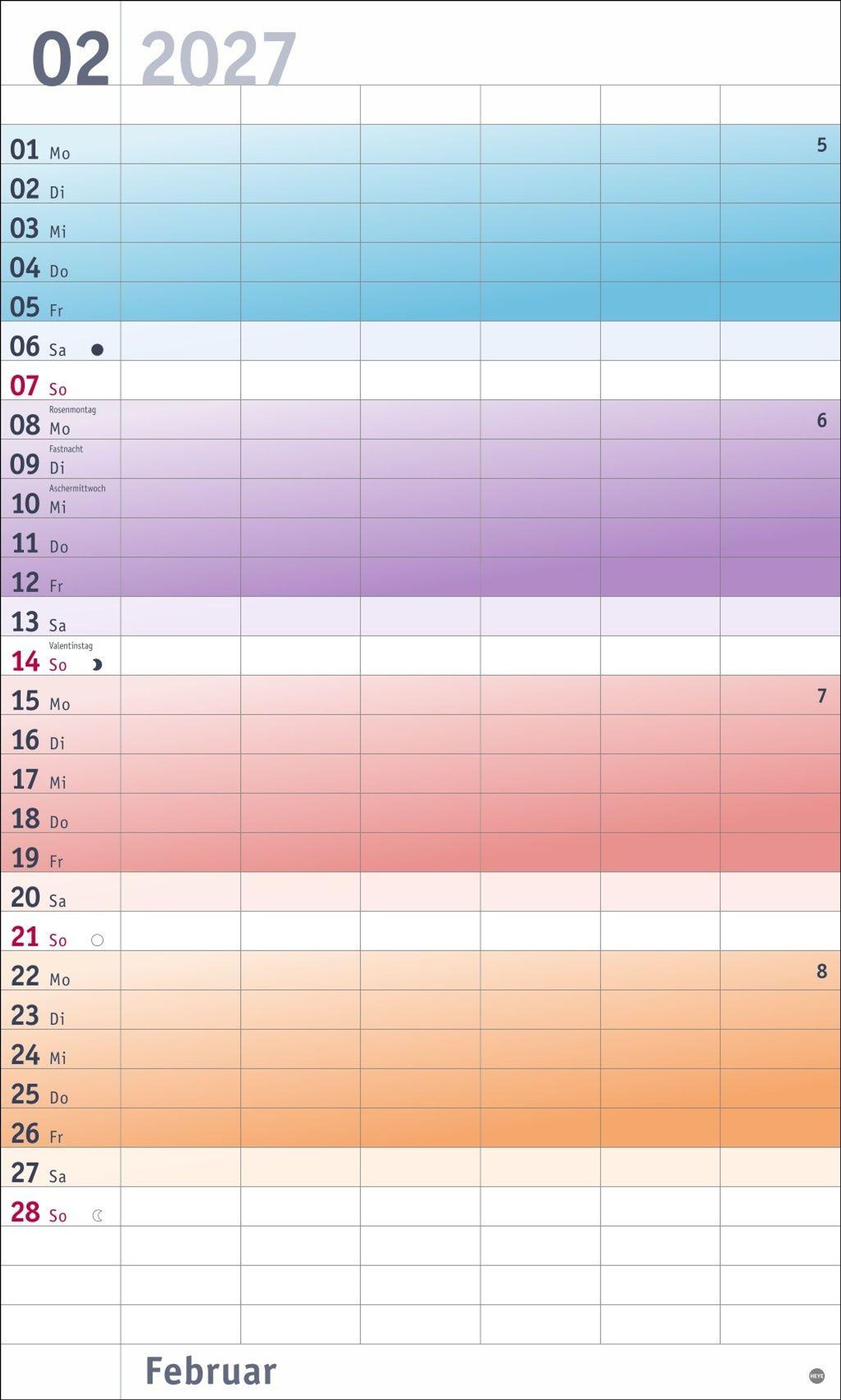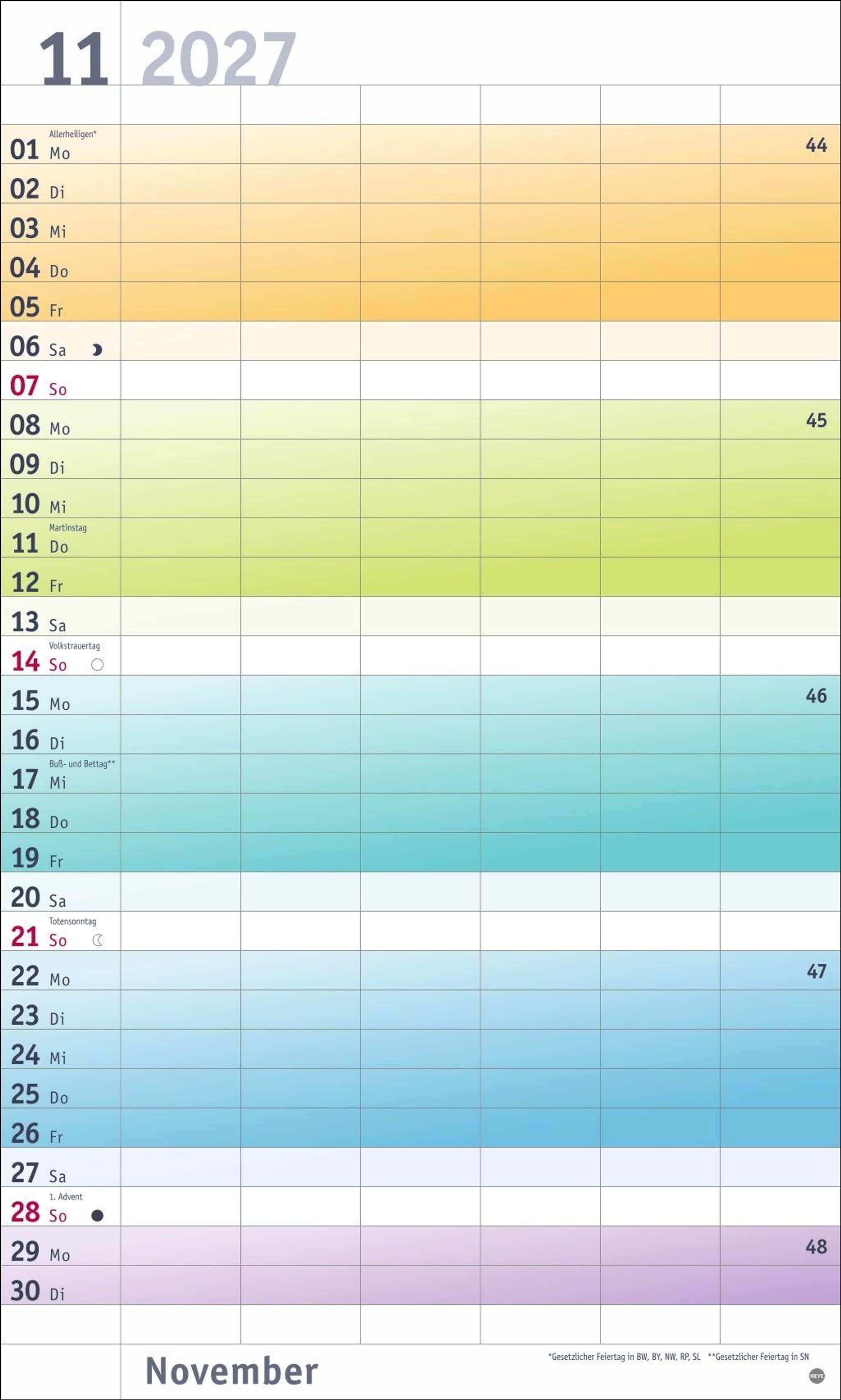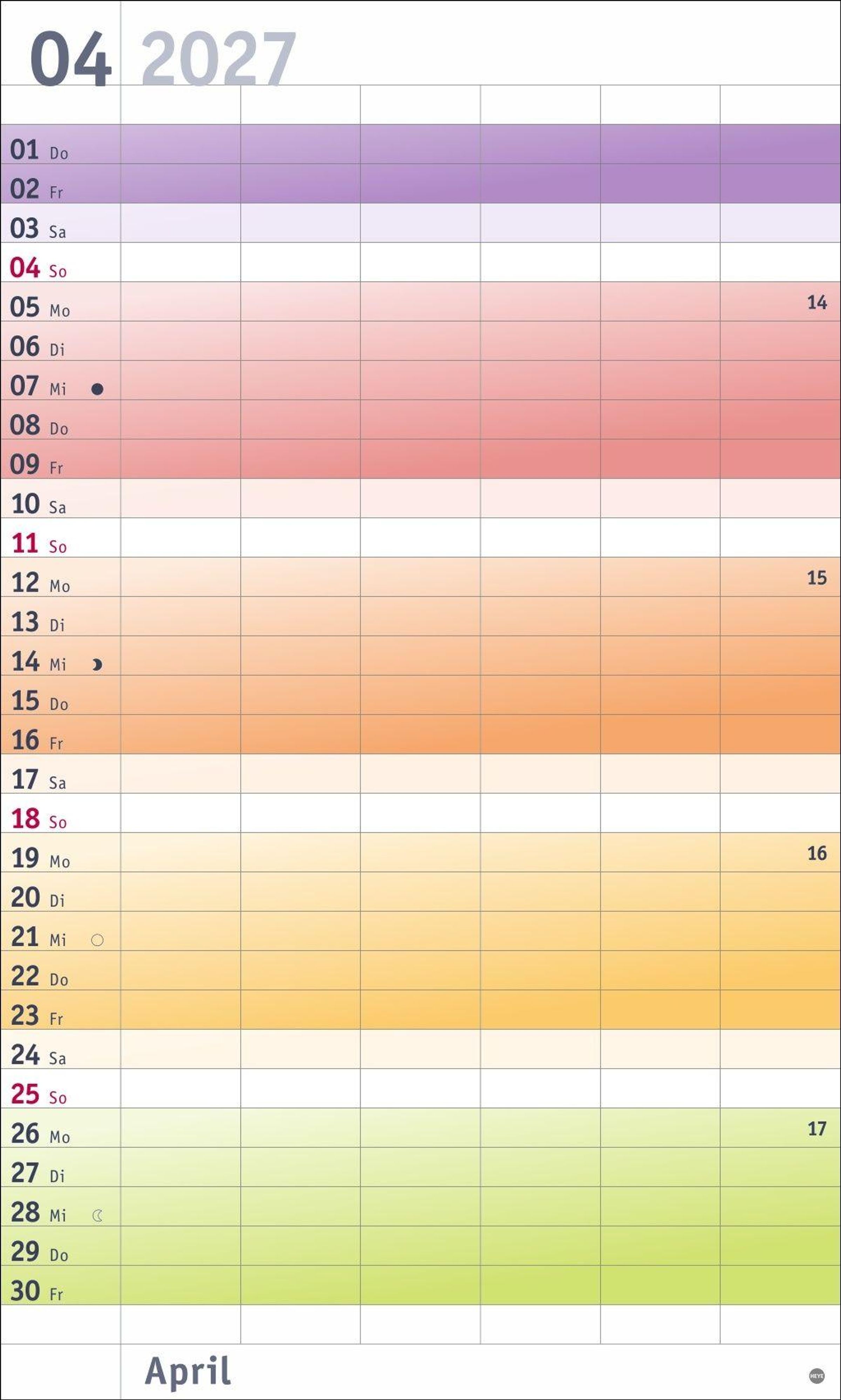 Farbenfrohes Design, neutrale Gestaltung: Kalender ohne platzraubende Muster im Format 27 x 45 cm, der Freiraum für das Wesentliche schafft