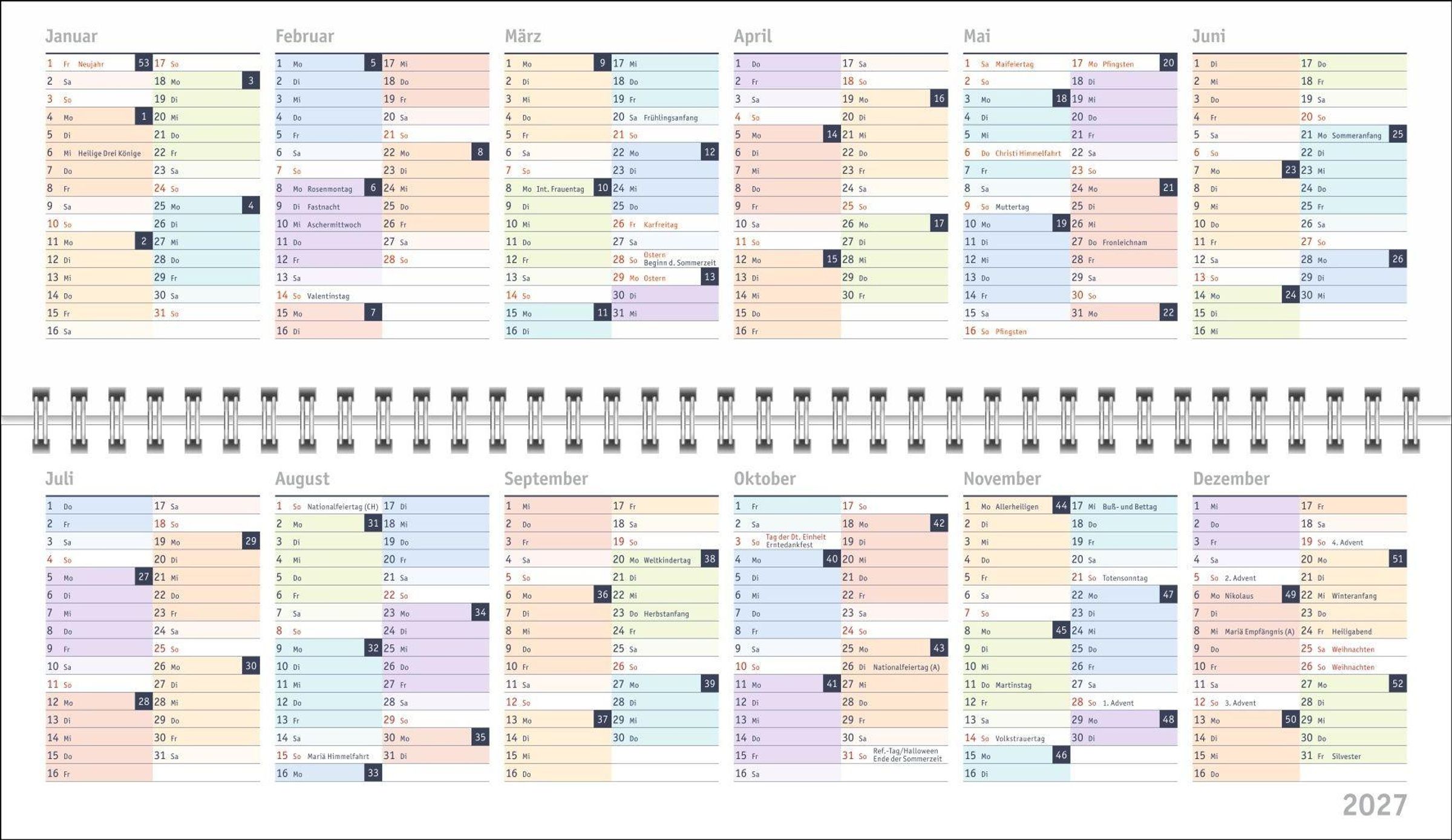 - Übersichtlicher Umklapp-Kalender 2027 mit farbig markierten Tagen. Tisch-Kalender für den Schreibtisch.