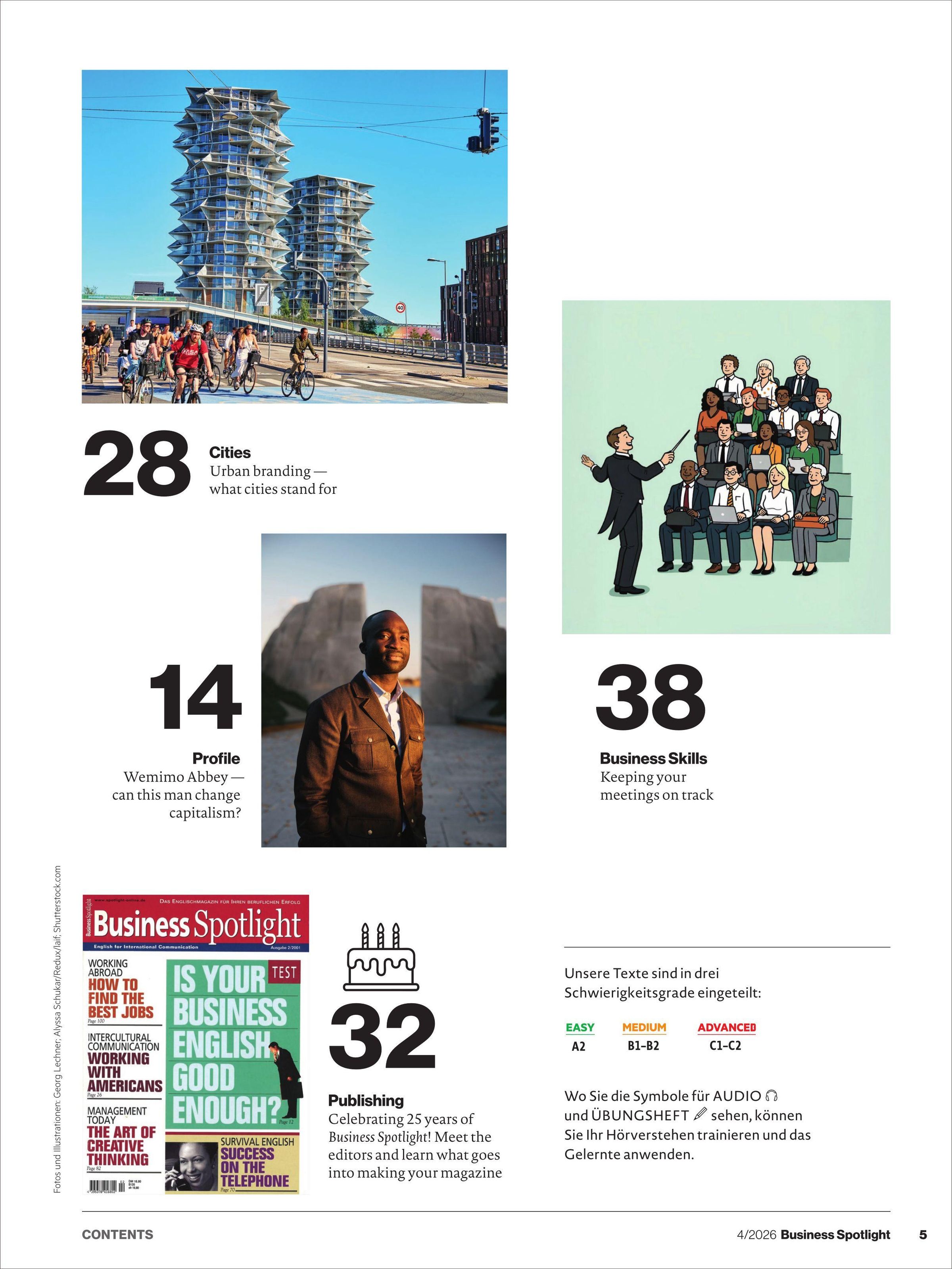 Business Spotlight verbessert nicht nur Ihr sprachliches Niveau in der internationalen Geschäftswelt, sondern gibt Ihnen darüber hinaus auch Tipps und Tricks für interkulturelles Arbeiten sowie aktuelle Berichte zu interessanten Ereignissen der Business-Welt.