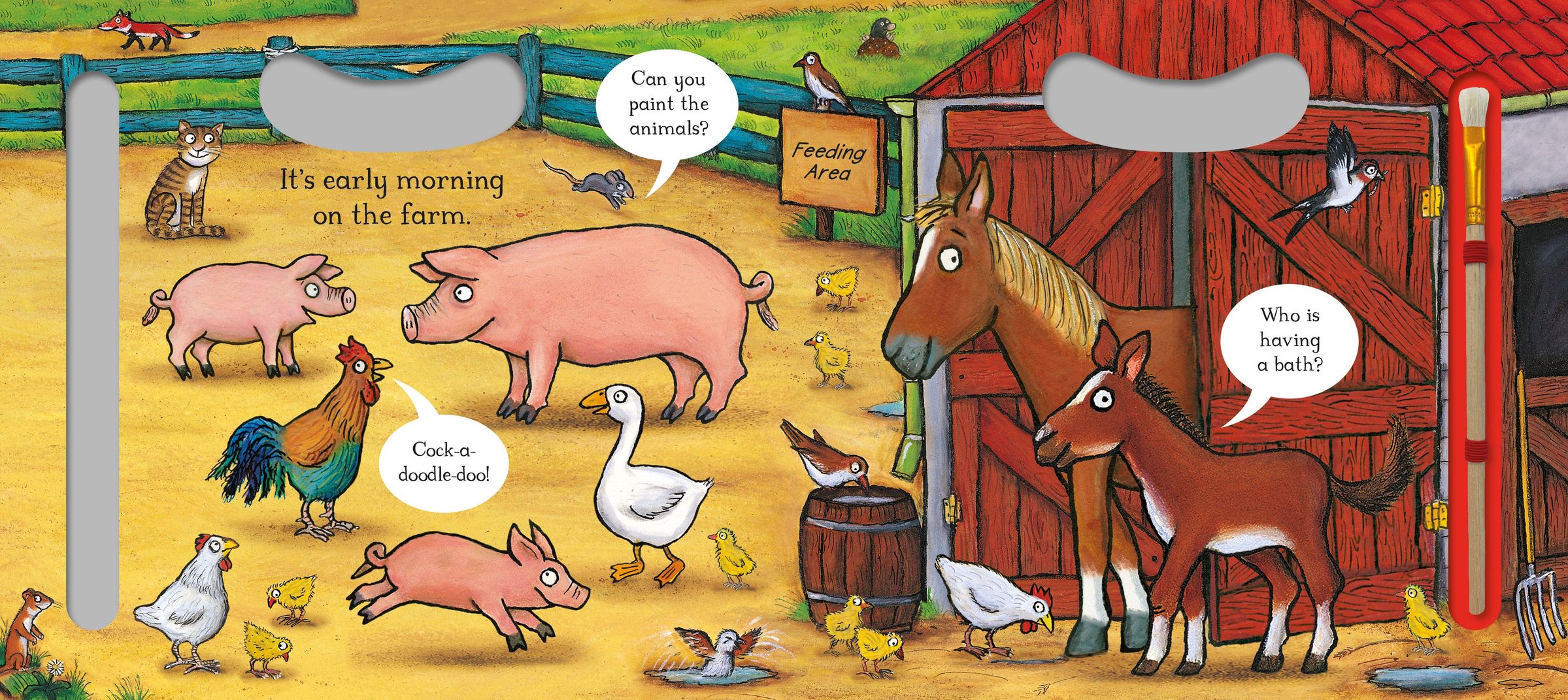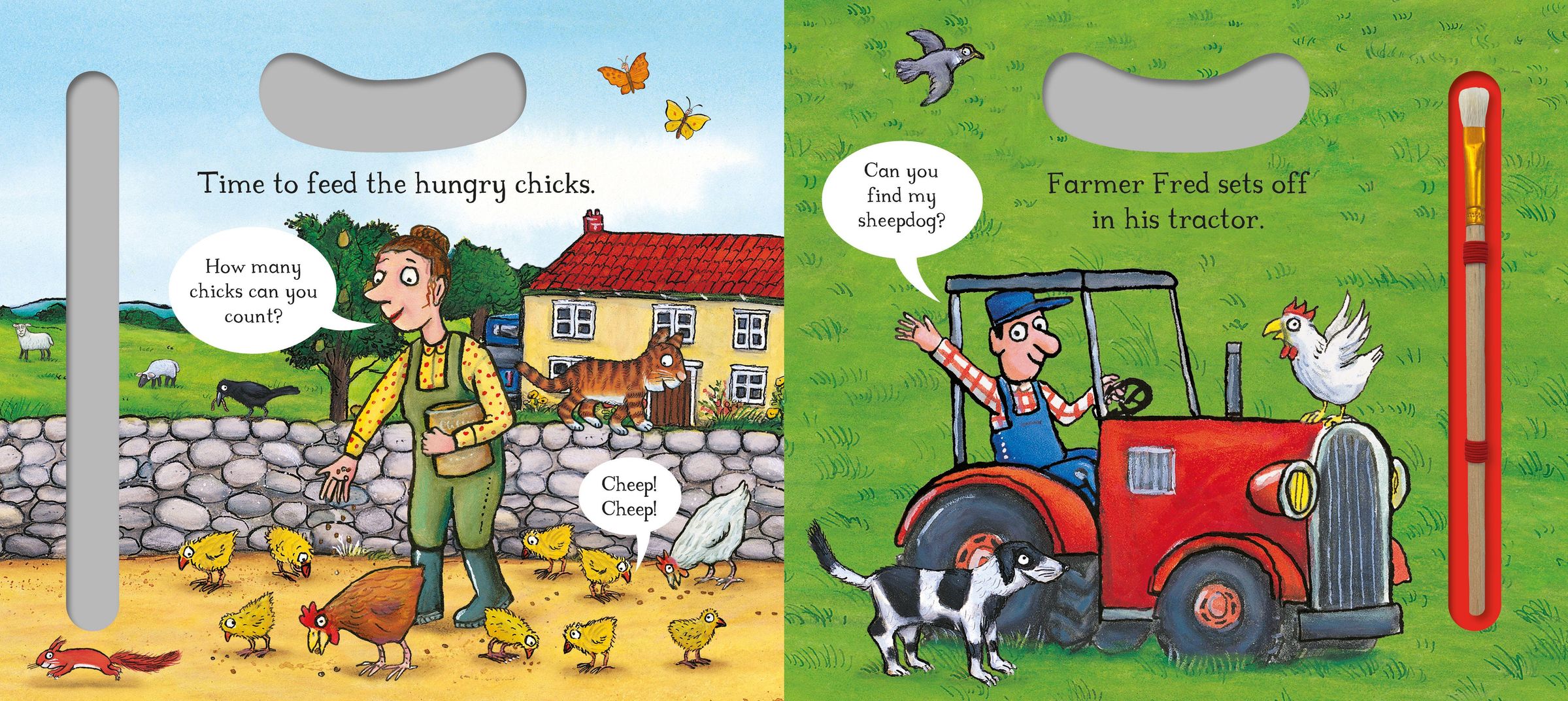 Join the noisy cockerel as he wakes up the all the animals, explore the busy farmyard and help the farmer feed the hungry chicks.
