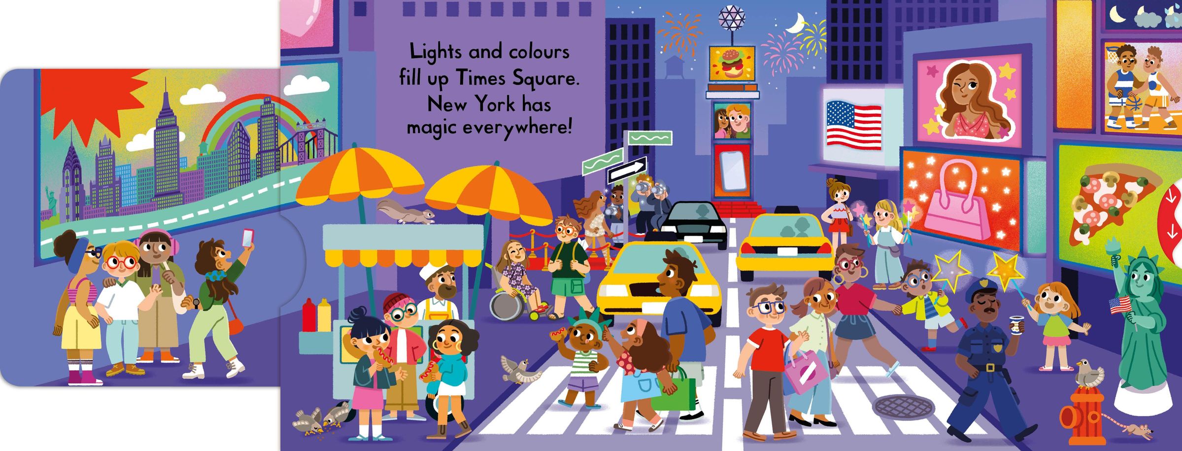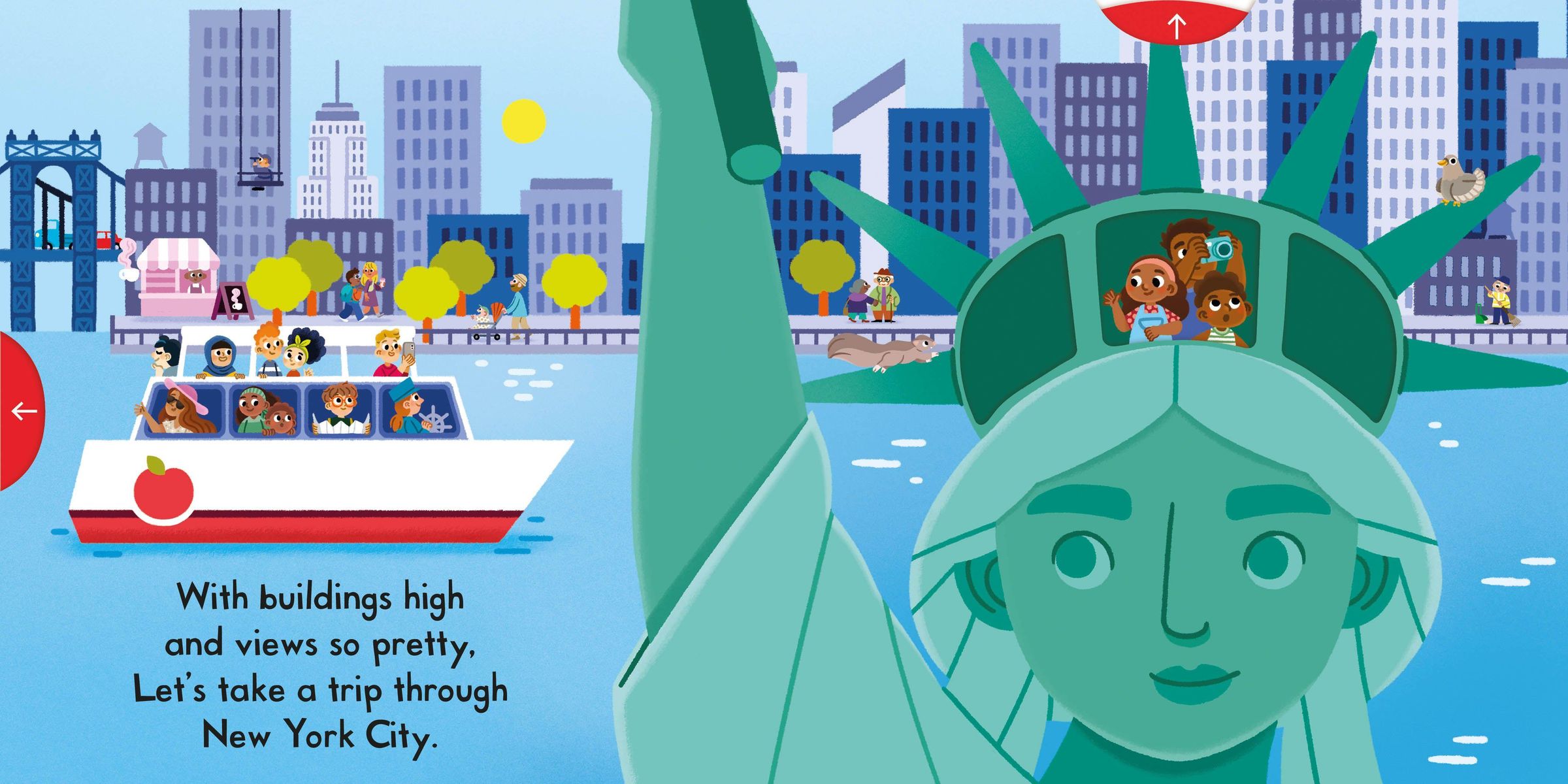 Push, pull and slide the scenes to explore New York City! Climb up the Statue of Liberty, ride the subway, enjoy a boat ride in sunny Central Park and take in the lights, sights and buzz of Times Square at night!