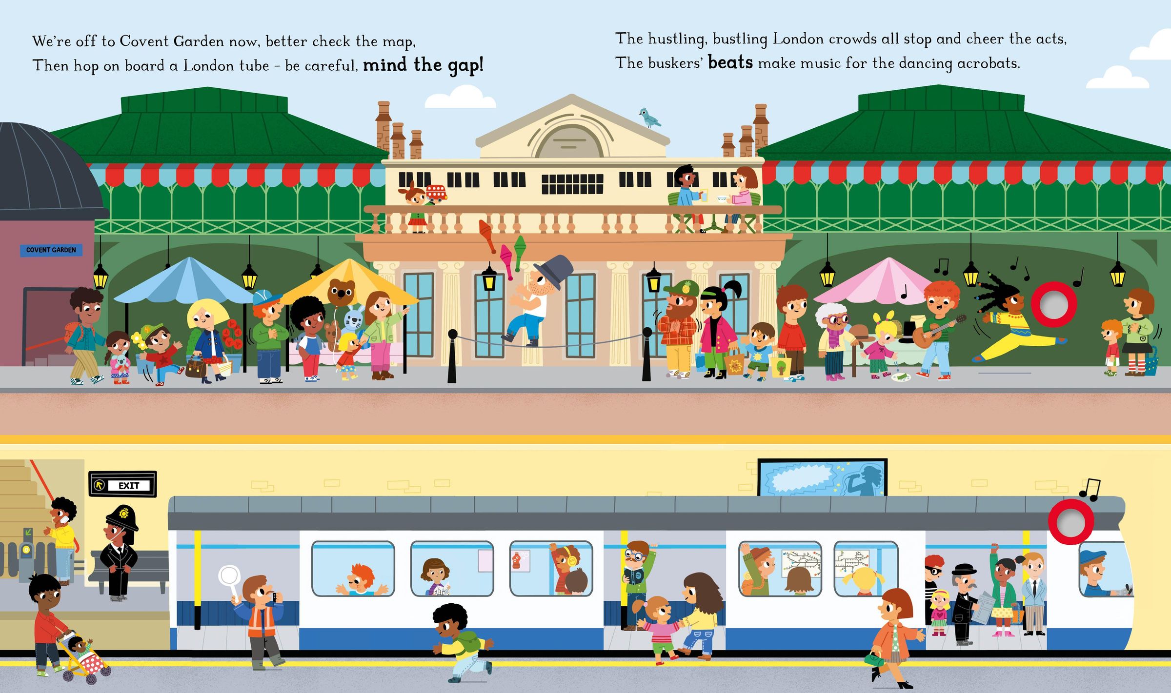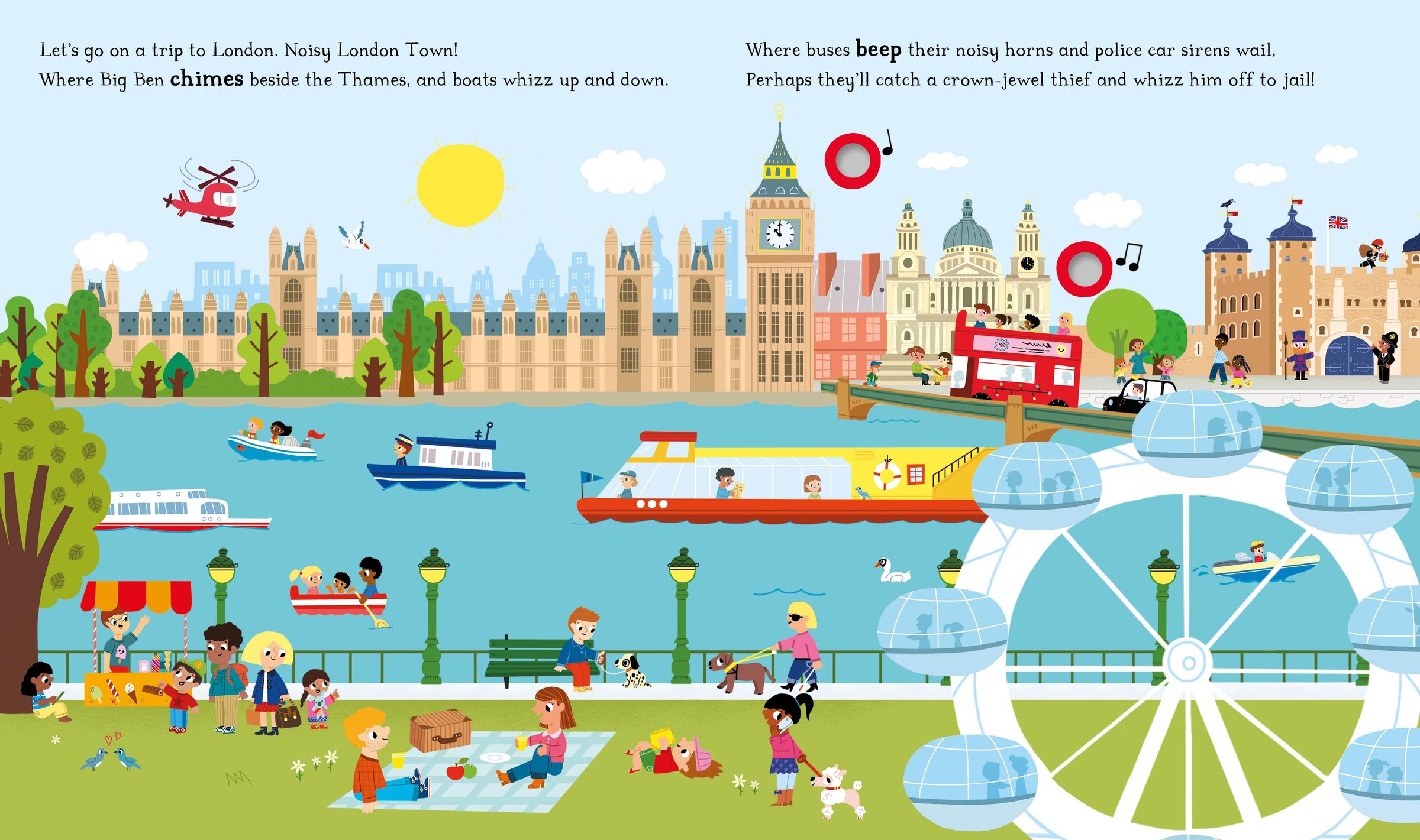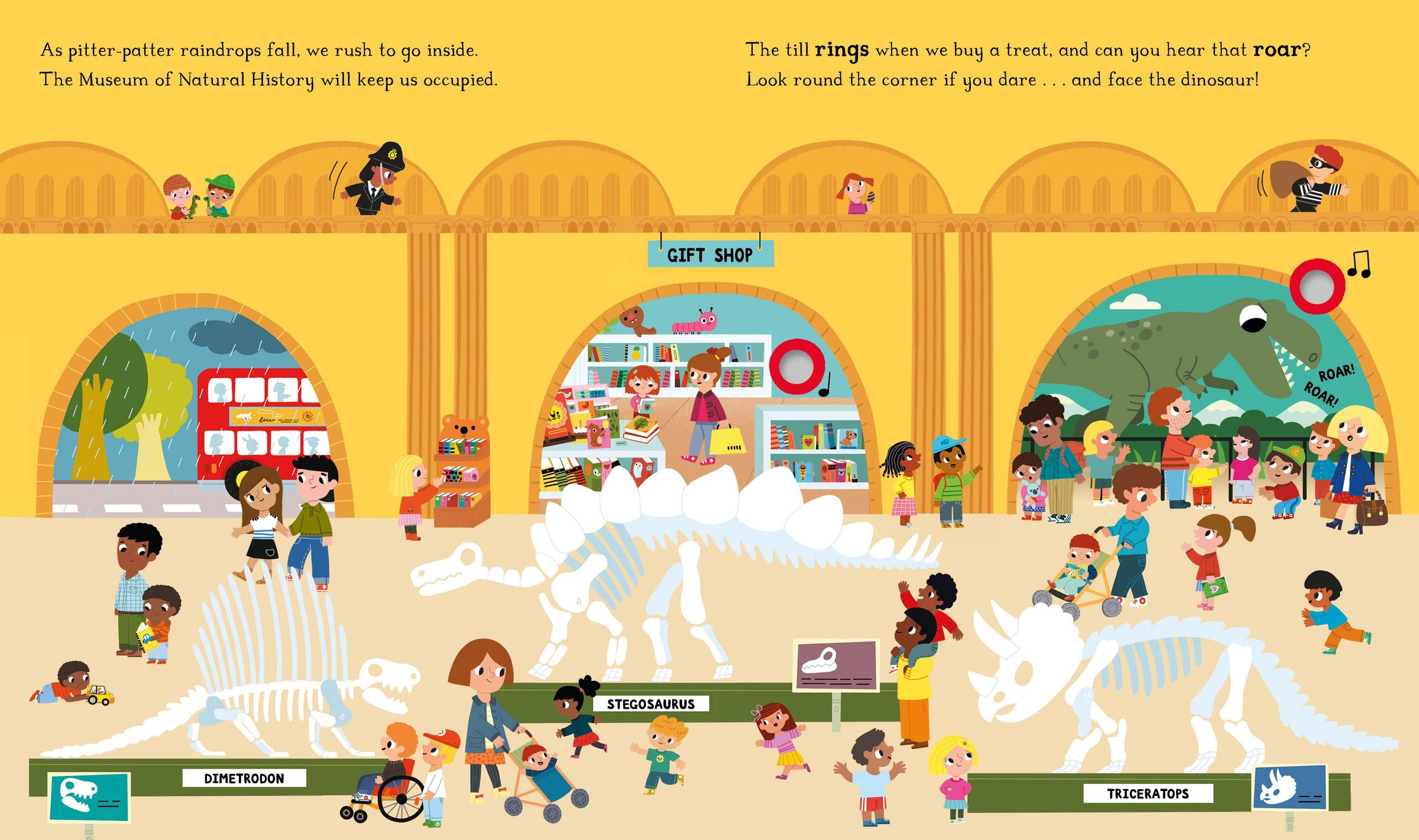 Watch out for beeping double-decker buses, find out who's roaring at the Natural History Museum, listen to the monkeys chitter chatter at London Zoo . . . then finish off the day with a trip to Buckingham Palace. And look out for the naughty crown jewel thief on every page!