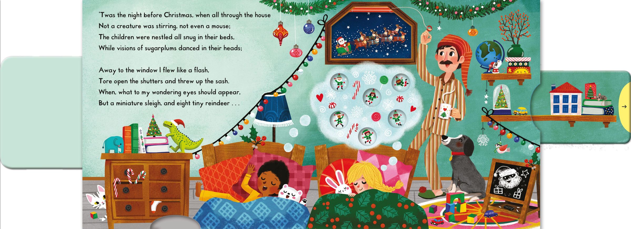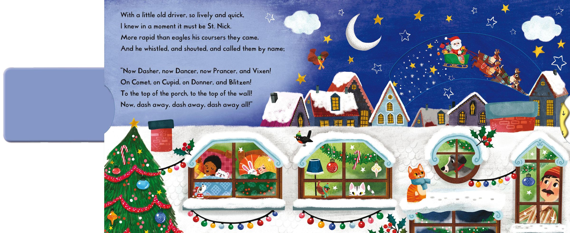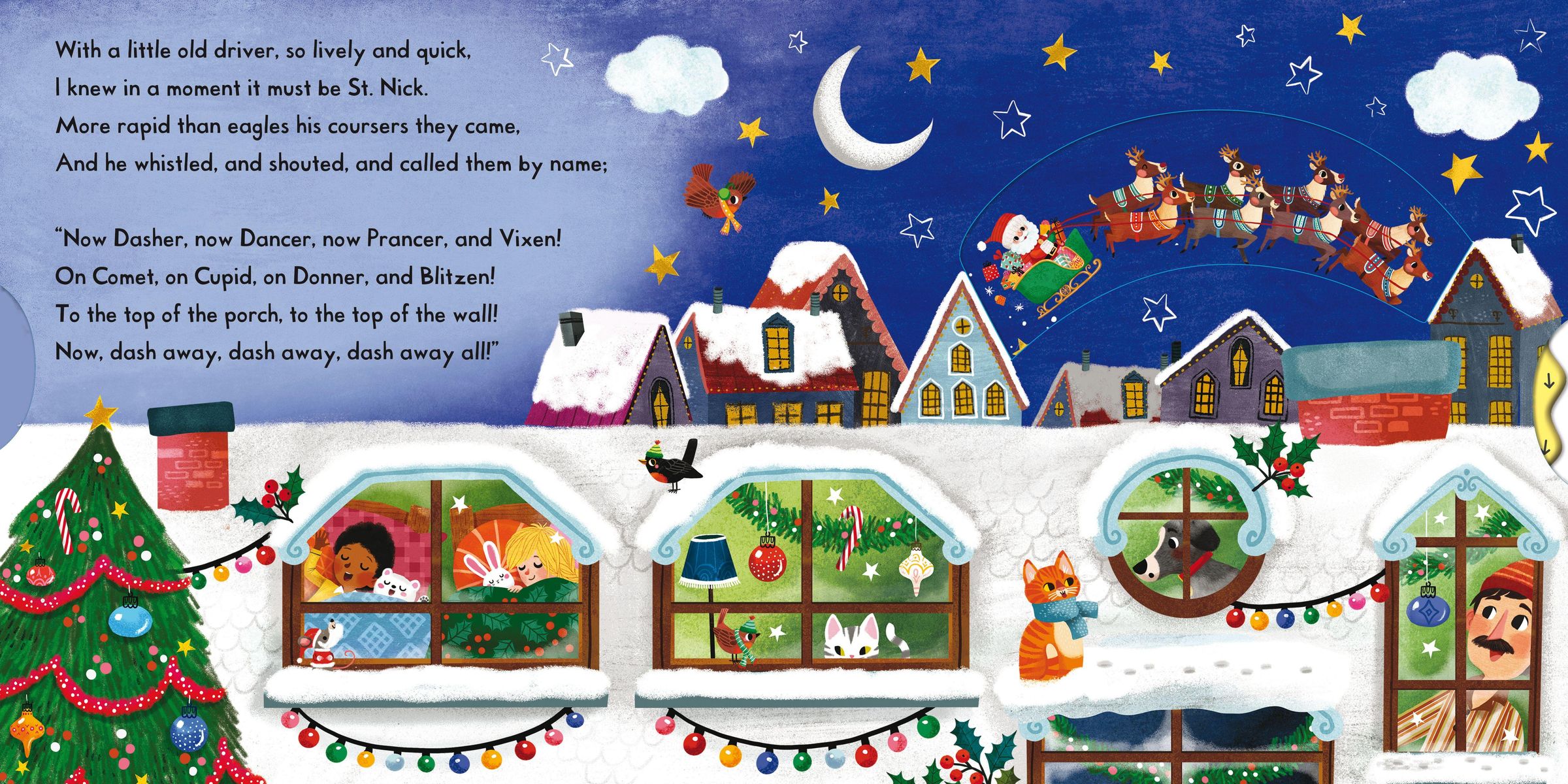 Push, pull and slide the colourful scenes to bring a classic poem to life in this delightful introduction for toddlers to Clement C Moore's Twas the Night Before Christmas !