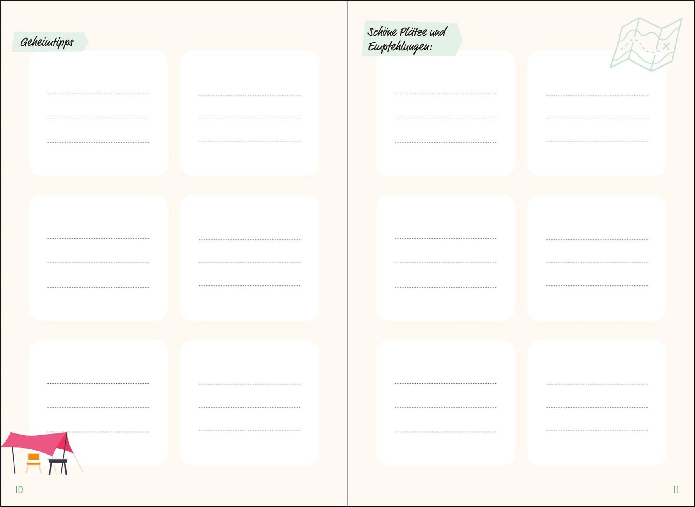 • Reisetagebuch für Erwachsene zum Ausfüllen. Travel Journal für den Urlaub mit Wohnmobil, Campingbus und Zelt