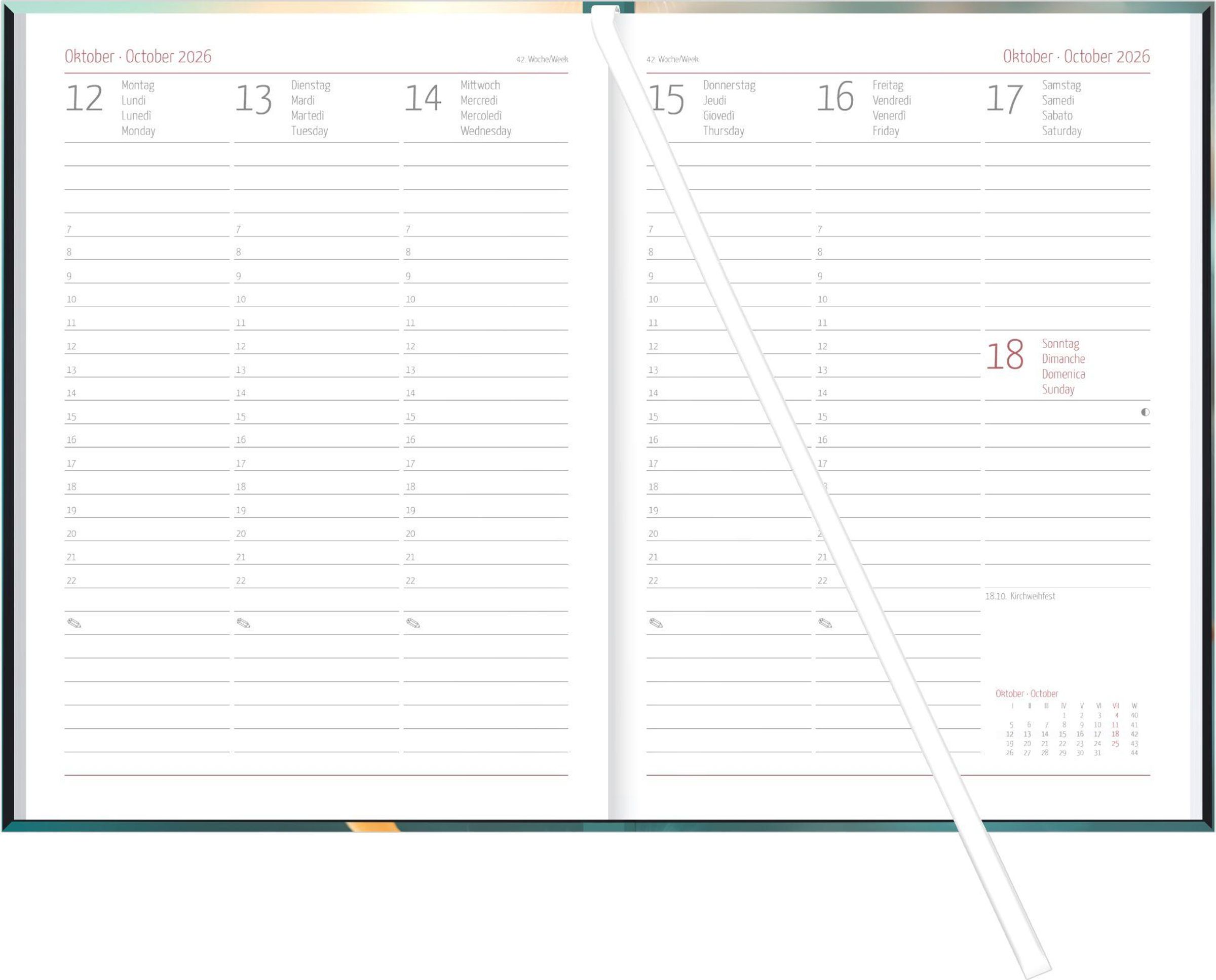 Übersichtliche Struktur: 1 Kalenderwoche pro Doppelseite mit großzügigen Notizflächen