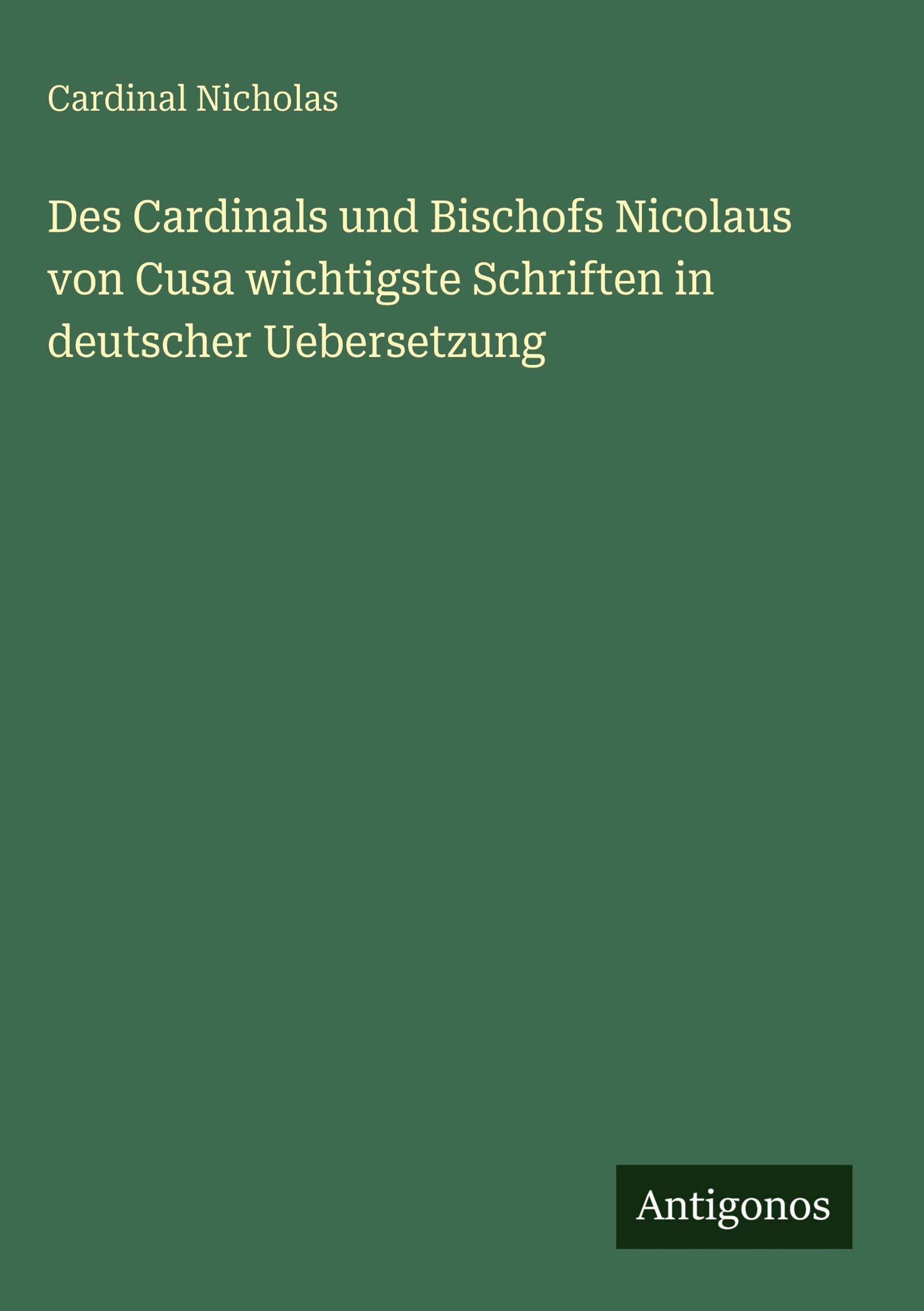 Cardinal Nicholas: Des Cardinals und Bischofs Nicolaus von Cusa wichtigste Schriften in deutscher Uebersetzung, Gebunden