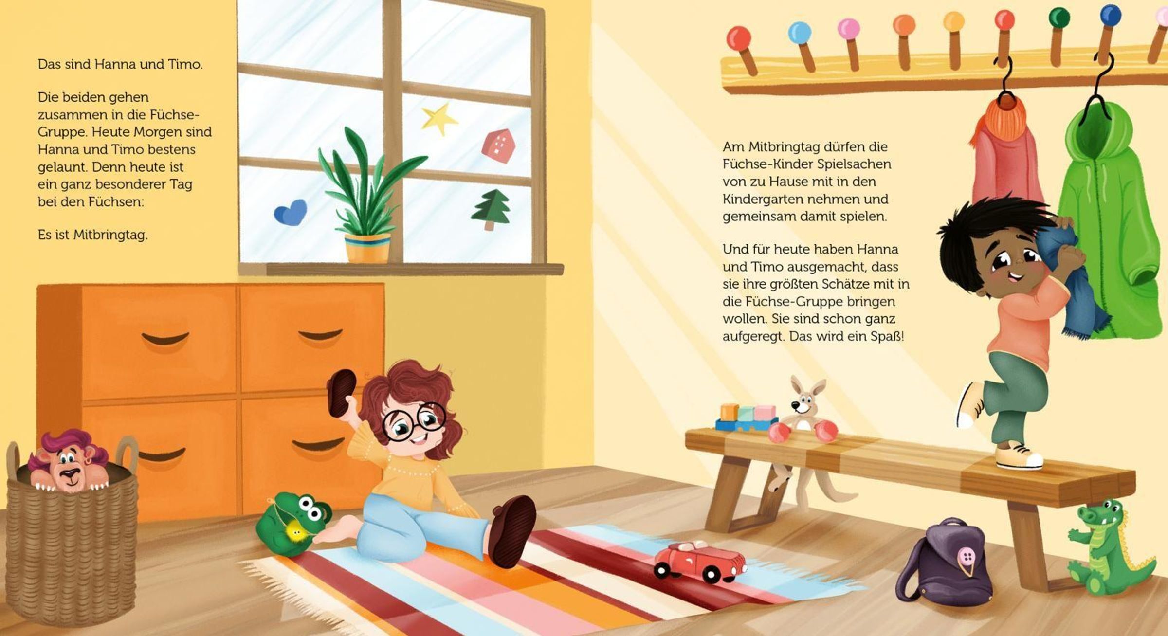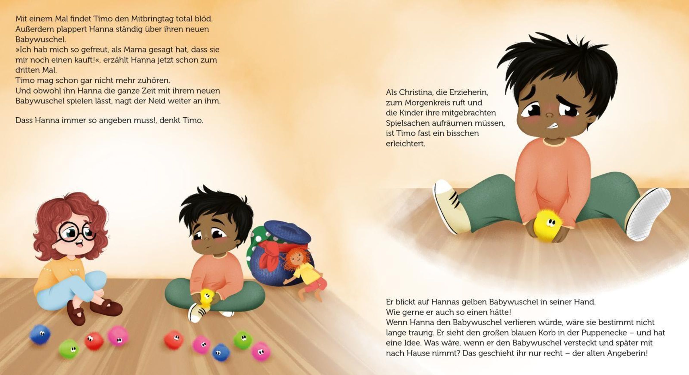 Hanna und Timo sind beste Freunde - doch am Mitbringtag im Kindergarten wird ihre Freundschaft auf eine harte Probe gestellt. Als Hanna ihren seltenen gelben Babywuschel zeigt, wird Timo ganz neidisch. Kurz entschlossen versteckt er das Spielzeug, doch seine Tat bleibt nicht unbemerkt. Was folgt, ist ein Gefühlschaos aus lügen, sich schuldig fühlen und bereuen. Zum Glück gibt es Christina, die Erzieherin, die den Kindern zeigt: Klauen, verstecken, angeben und lügen - das dürfen nur Elster, Eichhörnchen, Pfau und Papagei! Ein warmherziges Bilderbuch über Ehrlichkeit, Freundschaft und den Mut, Fehler einzugestehen.