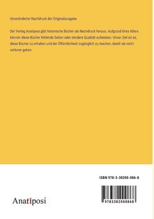 Unveränderter Nachdruck der Originalausgabe. Der Verlag Anatiposi gibt historische Bücher als Nachdruck heraus. Aufgrund ihres Alters können diese Bücher fehlende Seiten oder mindere Qualität aufweisen. Unser Ziel ist es, diese Bücher zu erhalten und der Öffentlichkeit zugänglich zu machen, damit sie nicht verloren gehen.