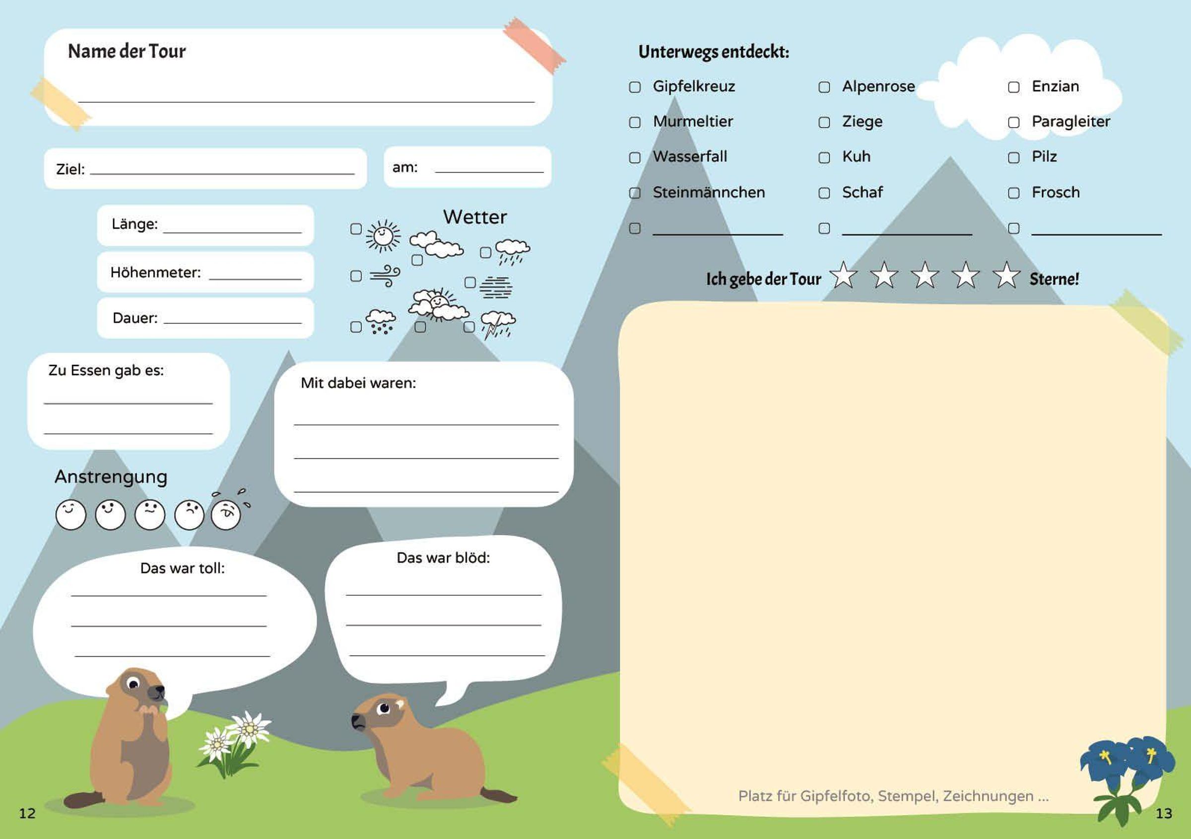 In diesem liebevoll gestalteten Wandertagebuch können kleine Gipfelstürmer ihre Abenteuer in den Bergen unvergesslich machen! Egal ob Wanderungen, Bergtouren oder Übernachtungen auf der Hütte - hier ist Platz für alle großen und kleinen Erlebnisse. Dank der vorformulierten Fragen fällt das Ausfüllen kinderleicht, und kreativer Freiraum für Zeichnungen, Fotos und eigene Ideen sorgt für jede Menge Spaß.