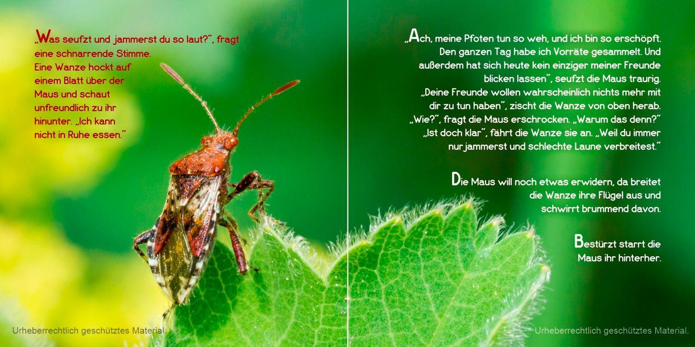 Die kleine Maus sammelt den ganzen Tag emsig Vorräte. Am Abend seufzt sie: "Au, wie tun mir die Pfoten weh." Eine missmutige Wanze, ein hochnäsiger Schmetterling und eine grummelige Kröte haben daraufhin nur unfreundliche und böse Worte für sie und reden ihr ein, dass ihre Freunde sie nicht mehr mögen. Das macht die kleine Maus furchtbar traurig. Zum Glück kommt kurz darauf die freundliche Schnecke vorbei und hilft ihr, ihr Selbstbewusstsein zurückzugewinnen.