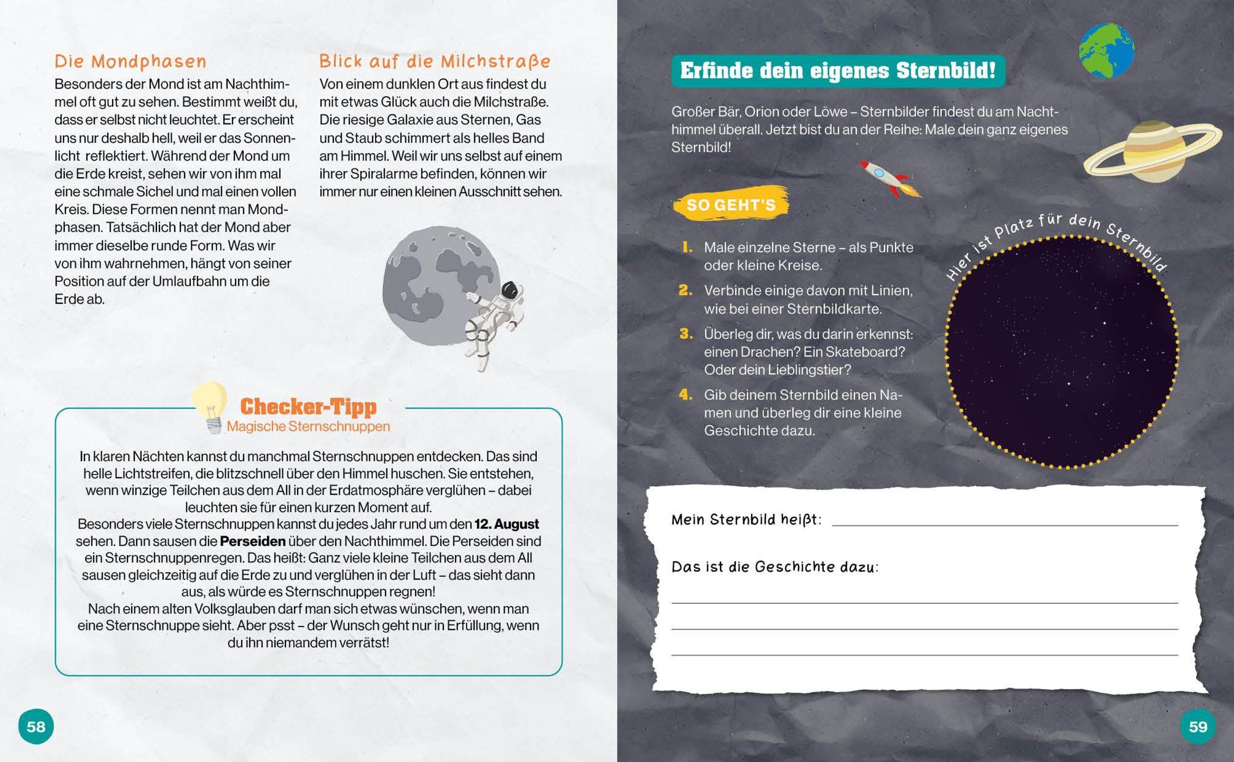 Passend zu den Projekten gibt es Checker-Fragen und spannendes Sachwissen sowie viel Platz zum Eintragen, coole Challenges, Rätsel und lustige Entweder-oder-Fragen zum Ankreuzen, mit denen du Marina noch besser kennenlernst.