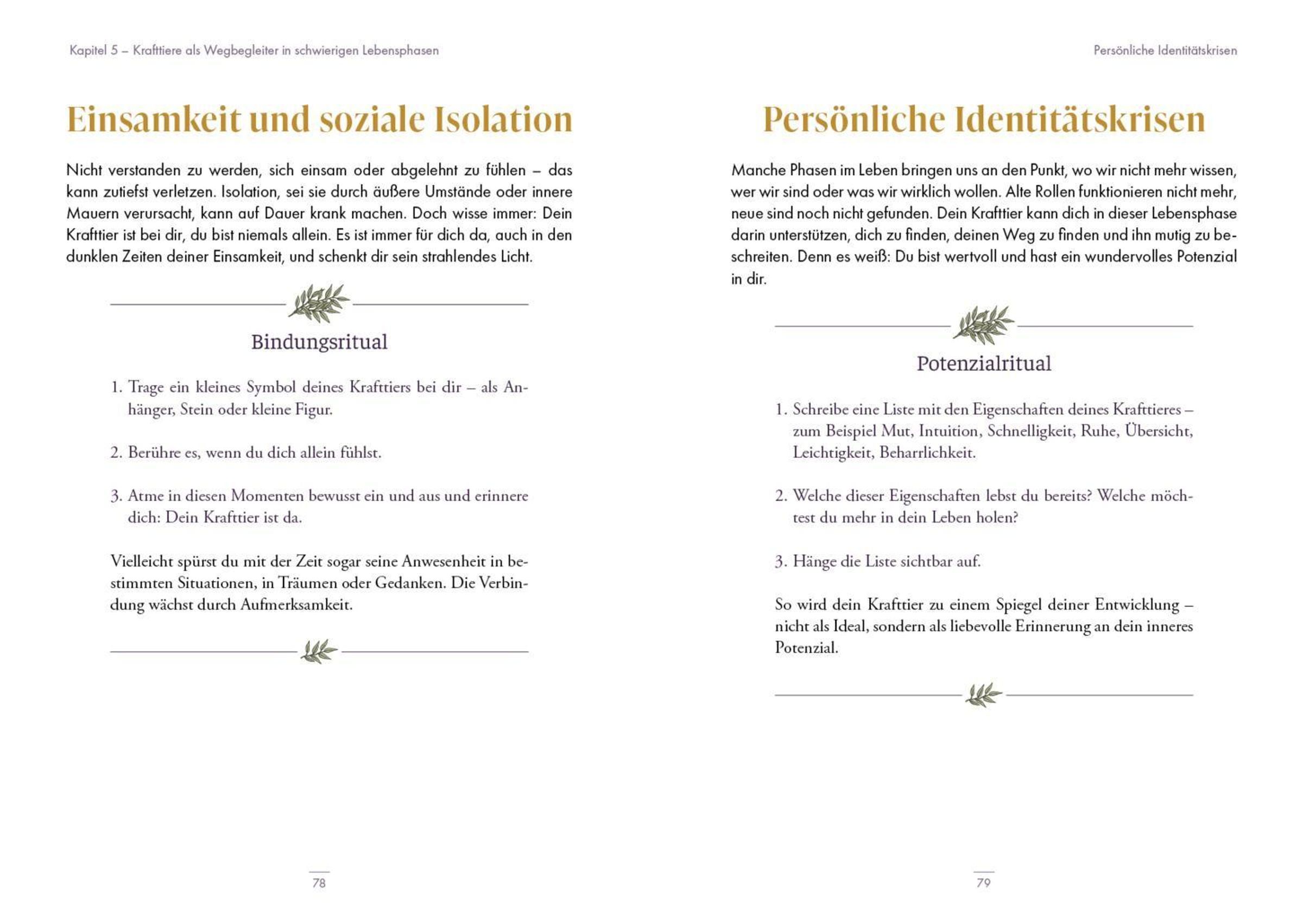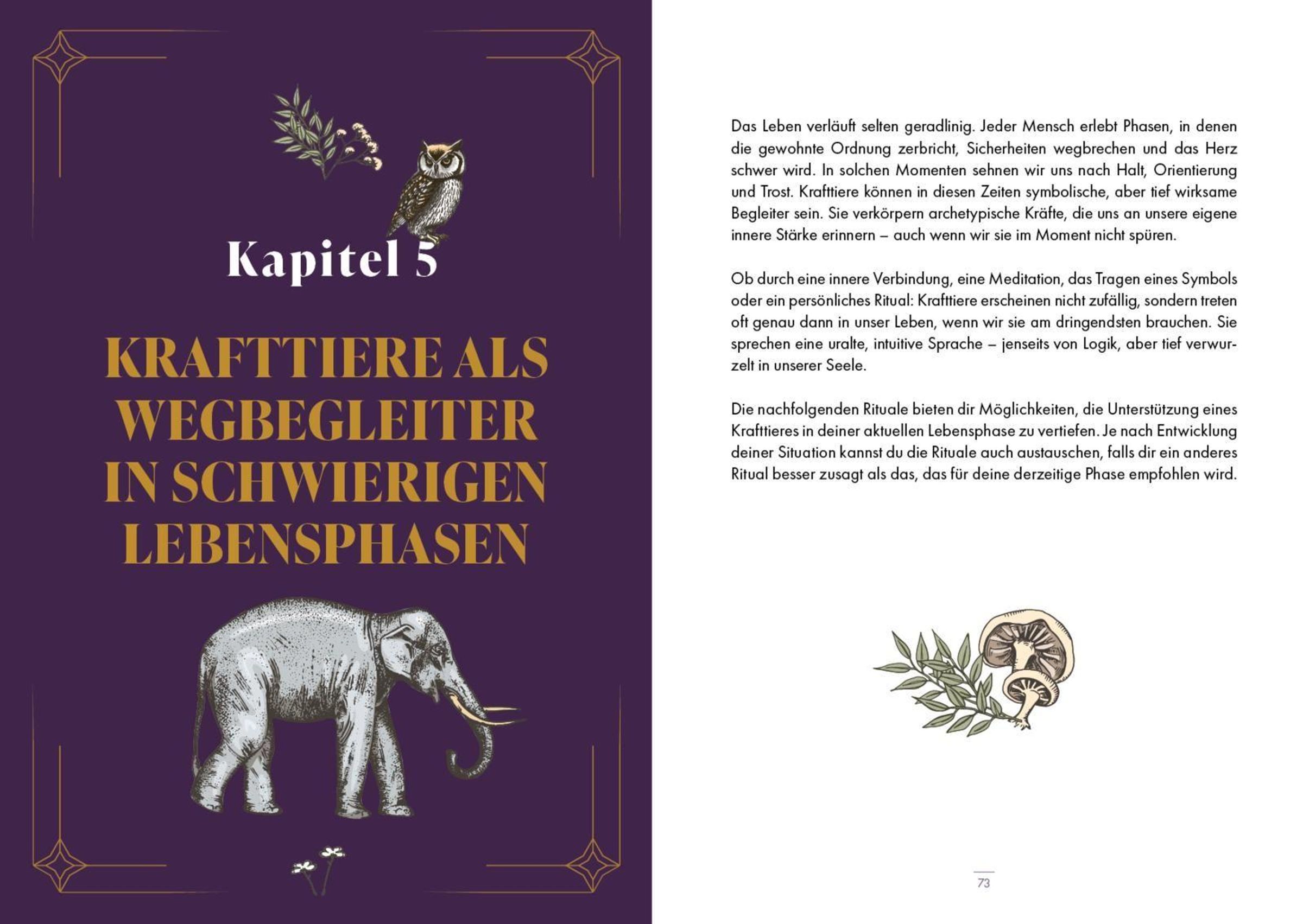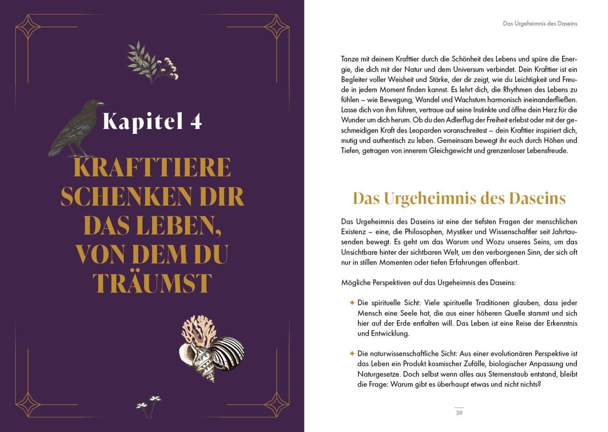 Seit Urzeiten begleiten Krafttiere die Menschen als weise Weggefährten und spirituelle Helfer. Sie stärken uns in herausfordernden Zeiten, etwa bei Trennung, Verlust, Krankheit, Konflikten oder Phasen der Unsicherheit. In solchen Momenten können Krafttiere zu wertvollen Verbündeten werden - sie schenken uns Mut, Hoffnung und neue Perspektiven. Caroline Deiß nimmt uns mit auf eine faszinierende Reise zu den Krafttieren der Erde, des Wassers, der Lüfte und der Mythen. Durch geführte Meditationen, Naturbeobachtungen, Zeichen und Rituale zeigt sie, wie Krafttiere uns durch schwierige Lebensphasen leiten. Mit über 50 ausführlich beschriebenen Krafttieren, die uns mehr über das Geheimnis unseres Lebens offenbaren und uns eine tiefere Verbindung zum eigenen Selbst schenken.