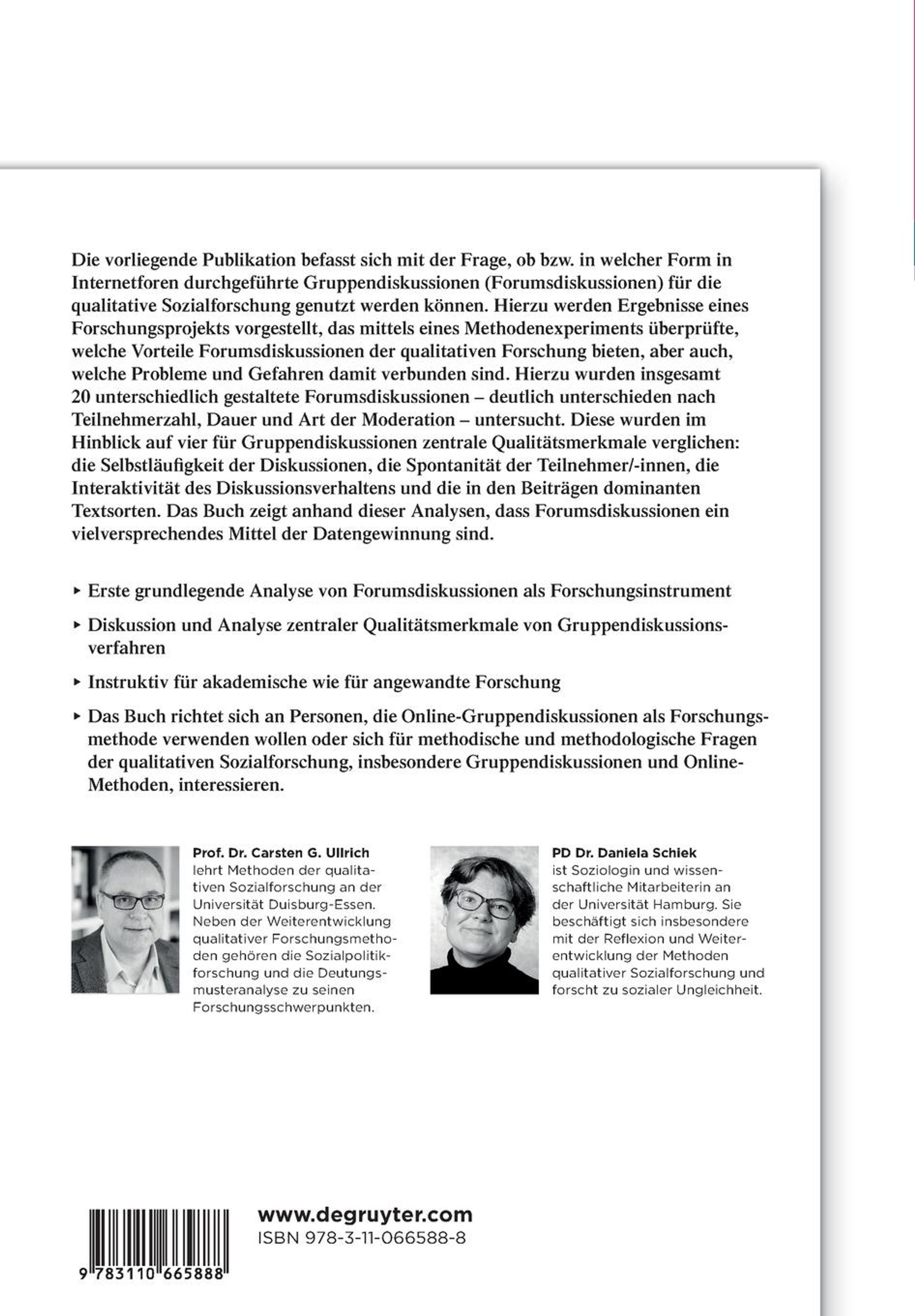 Forumsdiskussionen sind Gruppendiskussionen, die online in Internetforen durchgeführt werden und sich grundlegend von üblichen Gruppendiskussionen unterscheiden. Auf der Basis eines Methodenexperiments wird untersucht, welche Möglichkeiten solche Forumsdiskussionen der Sozialforschung bieten und welche Merkmale (u. a. Teilnehmerzahl, Multi-Threading) dabei wichtig sind.