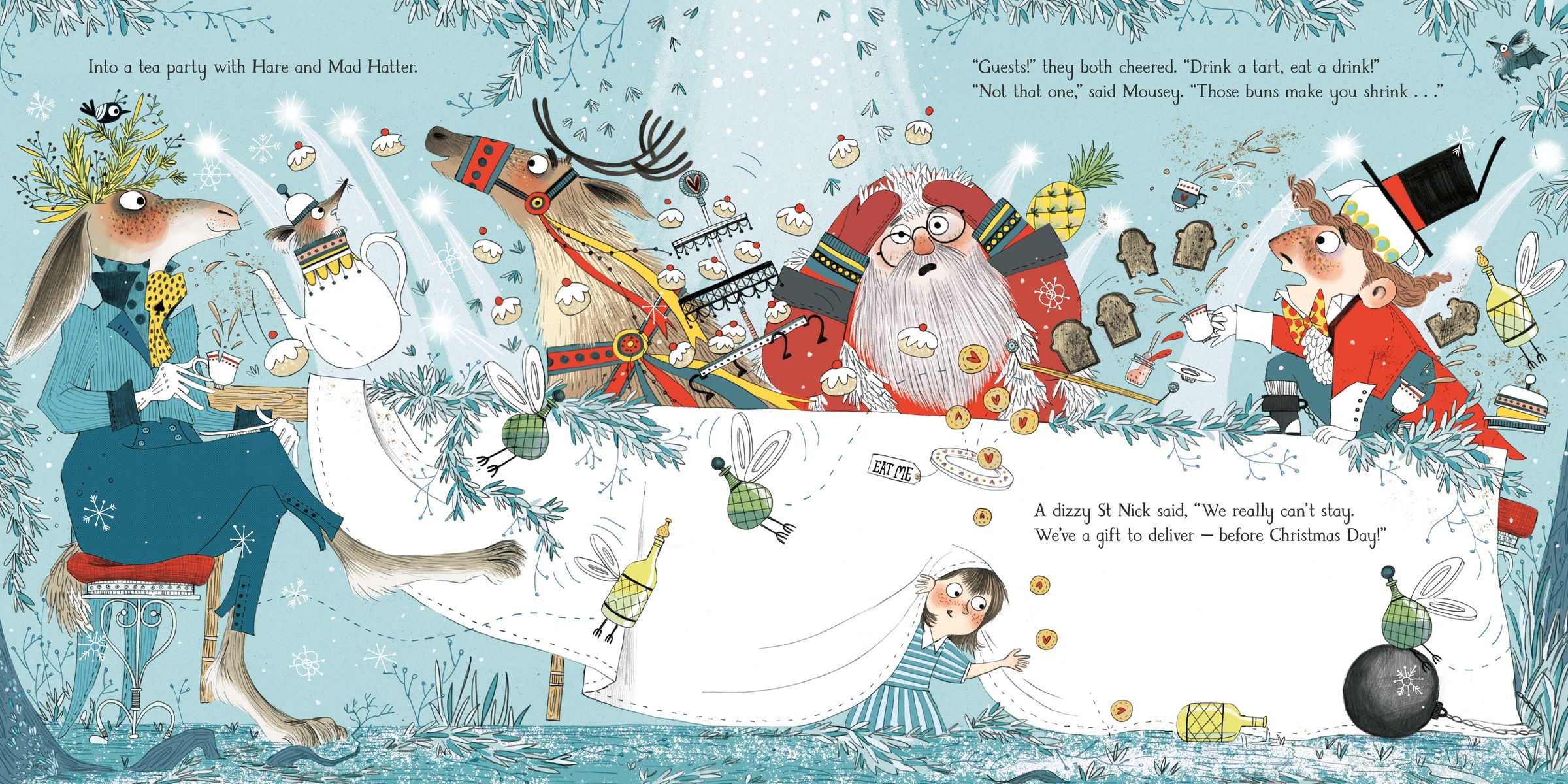 'Twas the night before Christmas, with a wonderful twist! Lewis Carroll's classic Wonderland returns but this time instead of Alice, it's Santa's turn for an adventure down the rabbit hole. Join the Cheshire Cat, the Mad Hatter, and the reindeer for a tea party with lots of festive fun!