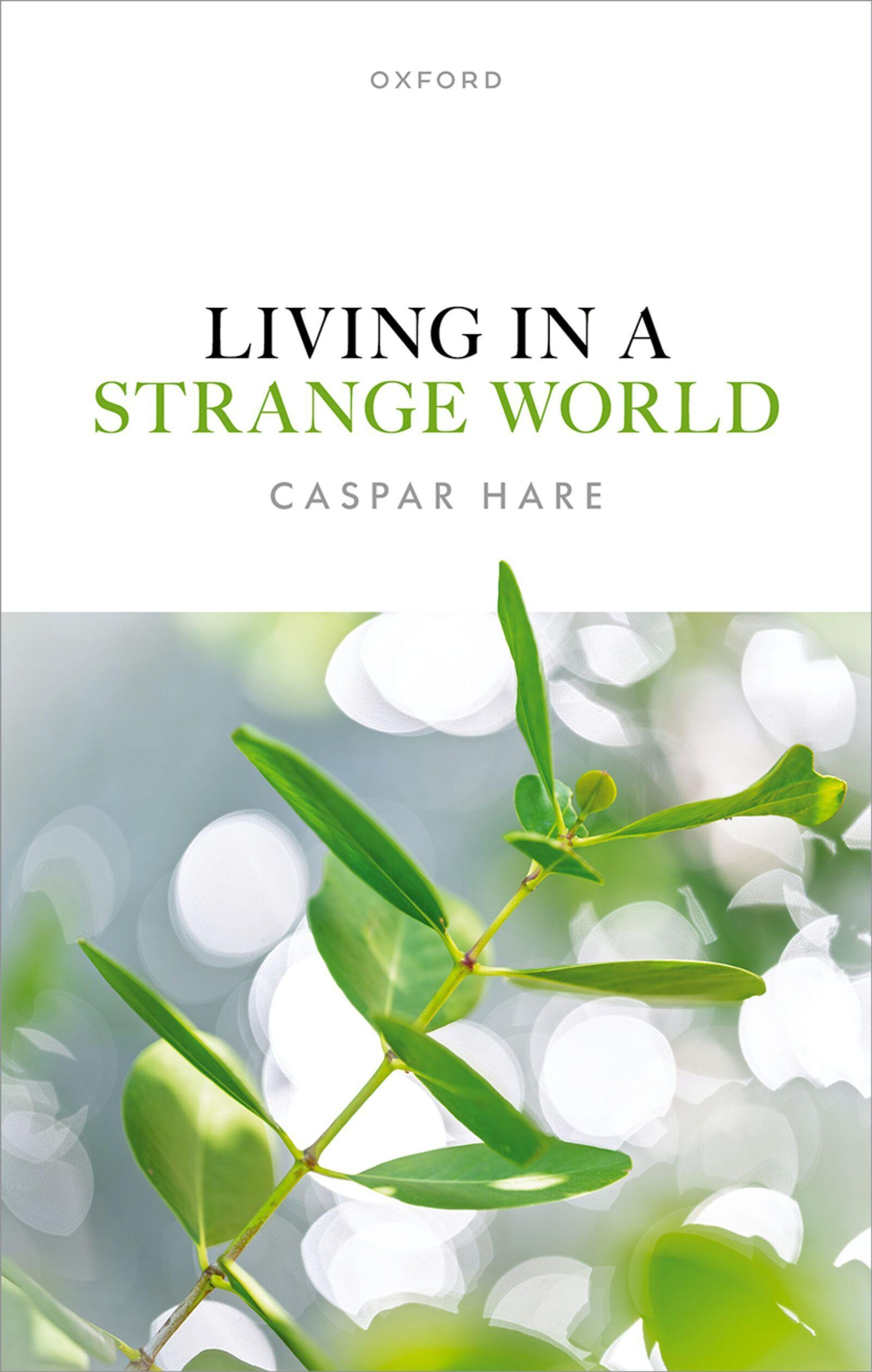"LIVING IN A STRANGE WORLD", Caspar Hare. Logo "OXFORD" oben. Vordergrund: Grüne Blätter vor unscharfem Hintergrund., Buch