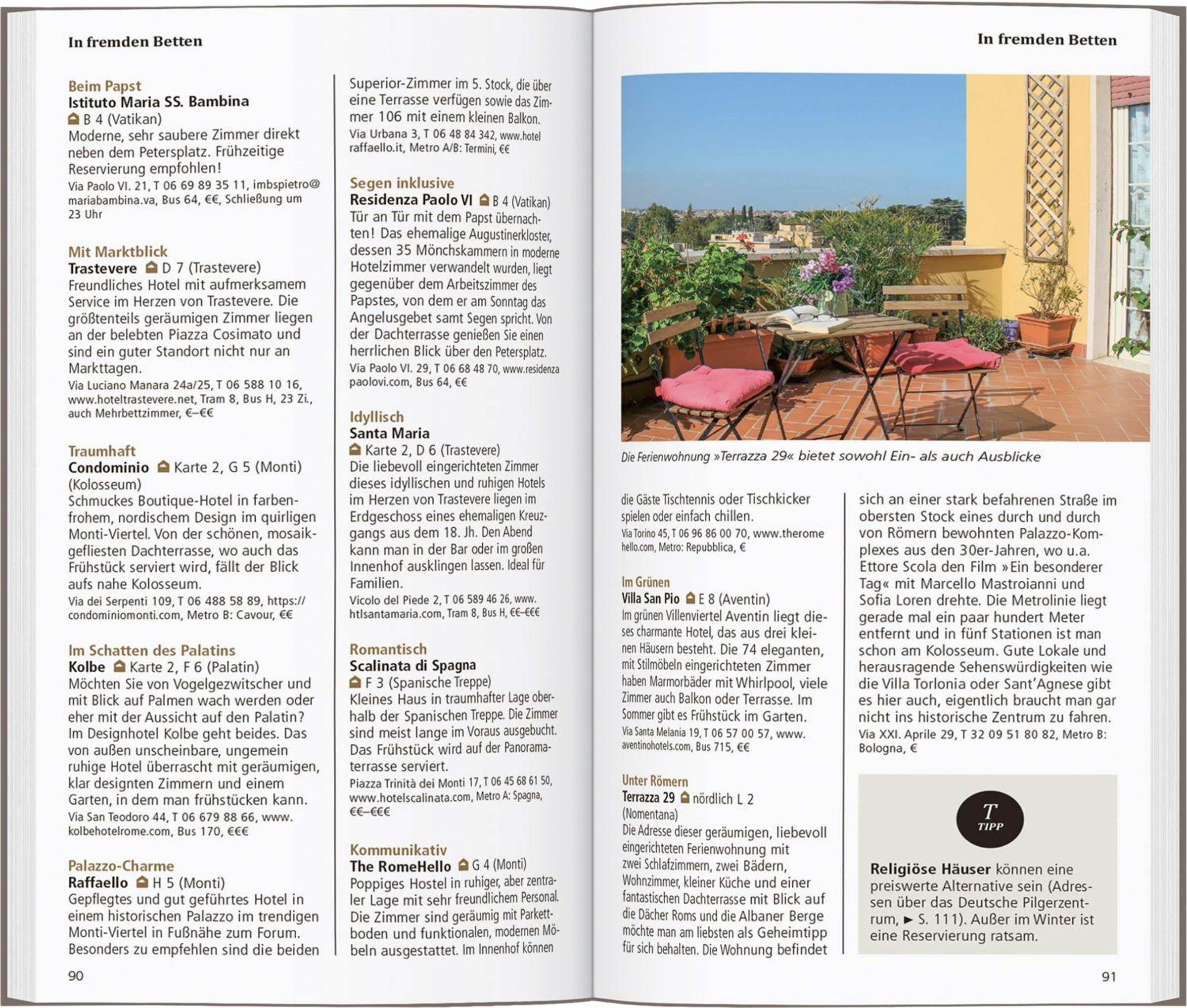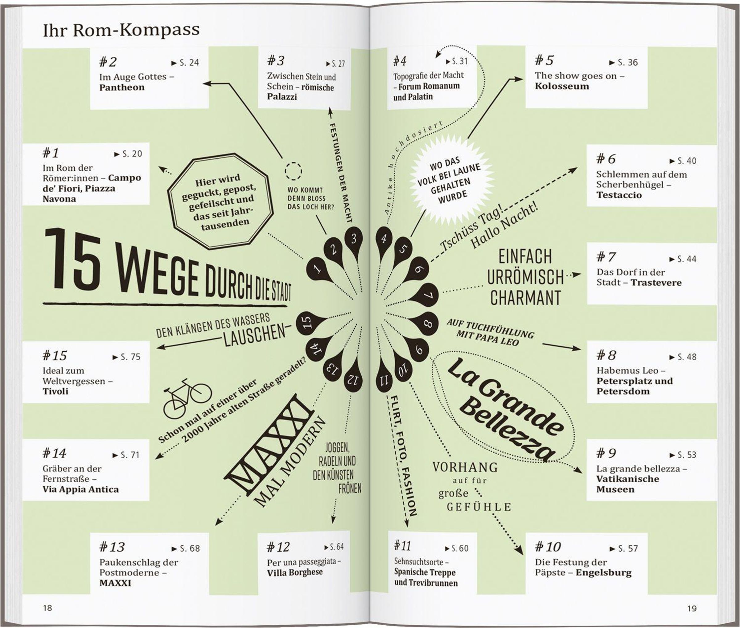 In eigenen Kapiteln erfahren Sie, wo es sich in fremden Betten gut schläft, wo Sie glücklich satt werden, wohin die Römer zum Stöbern und Entdecken gehen und wohin es sie zieht, wenn die Nacht beginnt.