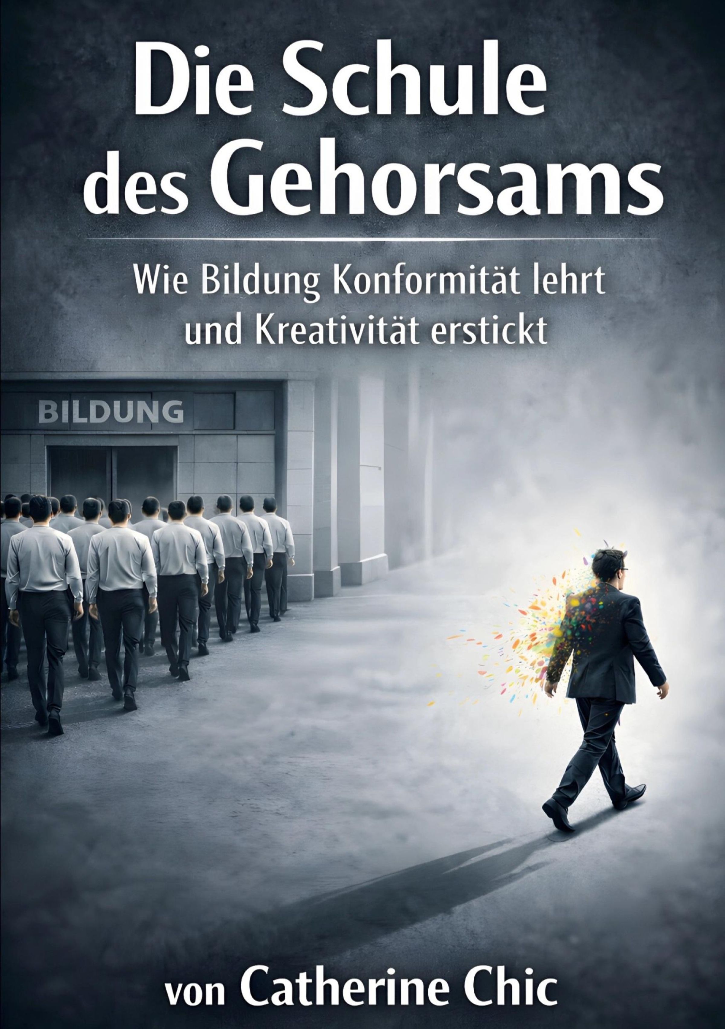 „Die Schule des Gehorsams: Wie Bildung Konformität lehrt und Kreativität erstickt.“ Ein Mann verlässt farbenfroh eine graue Reihe., Buch